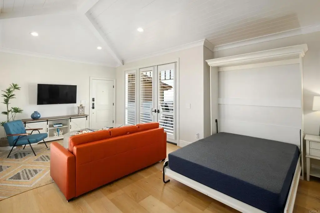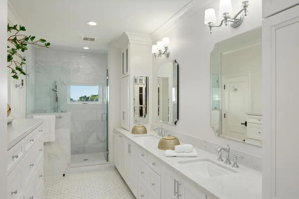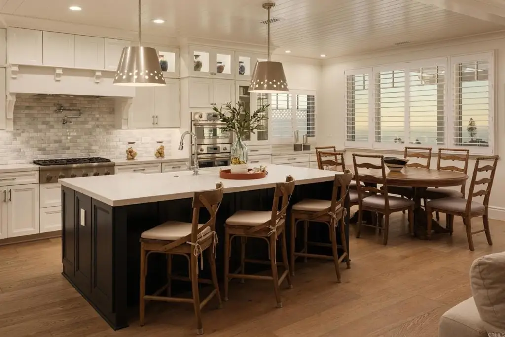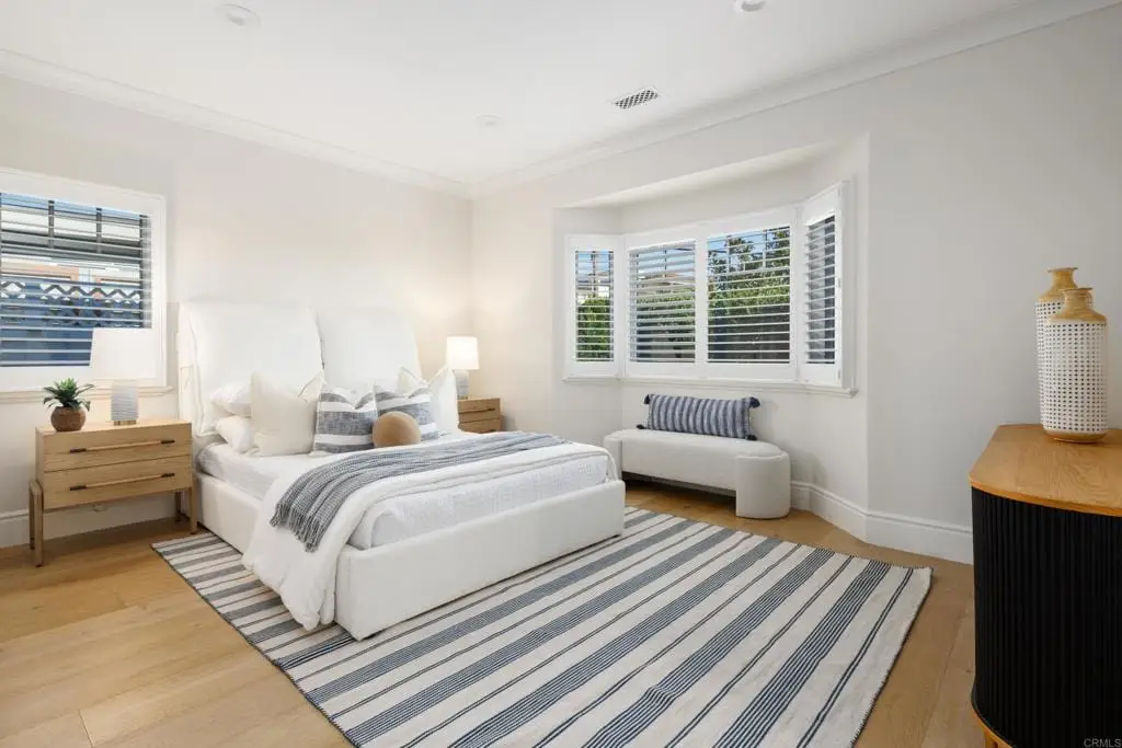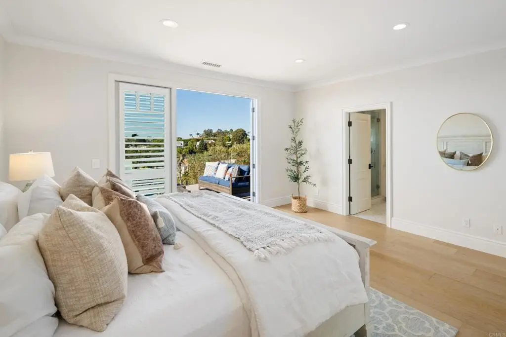 Experience comfort & luxury in this newly remodeled contemporary Hampton-style home featuring 4 bedrooms, 4.5 baths, and an expansive open-concept layout designed for modern living. The main residence is single level with a spacious great room and well-equipped gourmet kitchen anchored by a large island that flows effortlessly out onto the newly built TimberTech rear deck. You'll enjoy breathtaking panoramic ocean and canyon views from both the great room and the custom pergola-covered deck. High ceilings with transom windows, French doors and plantation shutters fill the home with natural light. French Oak wood flooring extends throughout, complementing the home's coastal charm. Generous wall space and custom lighting provide ideal areas to display art, adding a refined touch to the interiors. Each spacious bedroom includes built-ins and ensuite bathrooms featuring custom tilework and natural stone finishes for timeless elegance. Upstairs is a generous ADU that offers a full-size kitchen, bath, and walk-in closet perfect for guests, extended family, or rental income potential. The ADU has a separate entrance for privacy as well, and amazing views to both the north and south. This home beautifully blends comfortable luxury and modern sophistication, accentuating La Jolla's desirable lifestyle with impeccable craftsmanship and unforgettable views.