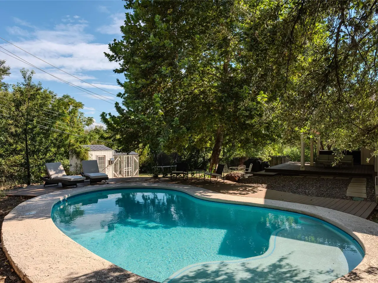 Tucked away on an oak-lined street in South Austin, this property offers the rare combination of privacy, space, and convenience just 10 minutes from the airport and downtown. The home sits on two full lots, both of which convey, creating an oversized property with a protected 150-foot natural buffer zone behind the fence. The result is a private, wooded setting that feels rural while keeping city amenities close at hand.Inside, the open layout creates a large entertaining area where the kitchen, dining, and living spaces flow together seamlessly. The modern kitchen includes stainless steel appliances, a built in beverage cooler and microwave, a reverse osmosis water system and plenty of storage. The primary suite is tucked away for privacy, with two additional bedrooms offering flexibility for family, guests, or office use. A detached 200 sq ft structure provides a bonus space perfect for a dedicated office, studio, or retreat.Step outside to enjoy the expansive fenced yard, complete with a pool, patio, and room to entertain or unwind. A chicken coop adds charm--and the chickens can convey. A two-car garage and long driveway provide plenty of parking and storage. Recent updates include new flooring, a new roof, a tankless water heater, and pool and outdoor living remodel, making this home move-in ready.With its combination of multiple lots, a wooded setting, modern updates, and a location close to shopping, dining, and major roadways, this property is ideal for anyone wanting the feel of the country without giving up the convenience of the city.