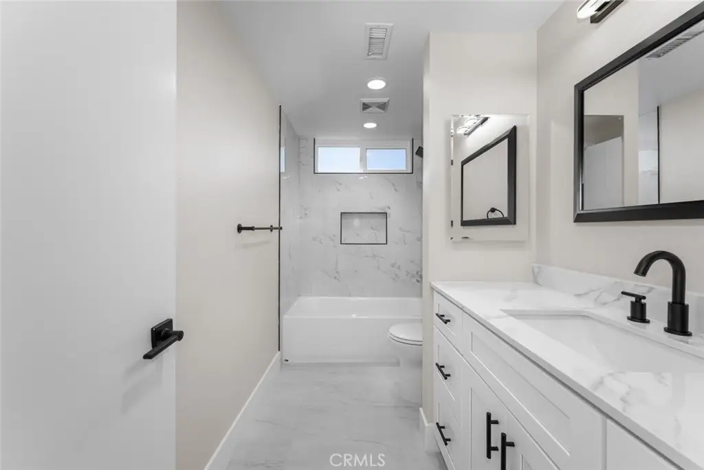 This 5-Bedrooom La Palma home has been comprehensively remodeled and updated for 2025, offering a thoroughly modern experience. Located in the sought-after "Hollandia Tract," homeowners will benefit from a pristine and turn-key condition new home. Curb appeal welcomes you with new exterior paint, landscaping, and a beautiful distinctive front door. As you enter, the spacious living room presents a freshly painted neutral color palette that awaits your personal touch. The home boasts numerous upgrades dual-pane windows, stunning vinyl laminate floors throughout with tile in the bathrooms, a remodeled kitchen with quartz countertops, subway-tile backsplash, new appliances and an extensive center island. Convenient downstairs bedroom for guests, extended family, or a home office is available. The remodeled downstairs bath includes a shower as well. Upstairs includes the spacious primary bedroom with dual closets and private bathroom, three additional bedrooms, and a full hallway bathroom. All bathrooms are remodeled in the current desired style and flows with the remainder of the house. Toulouse is conveniently located and provides access to many of the conveniences of Southern California, schools, parks, amusement parks, entertainment, and transportation.