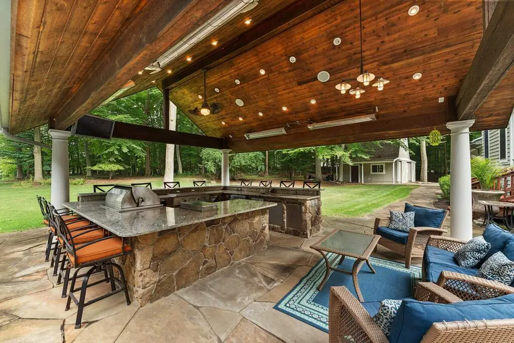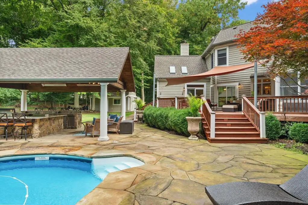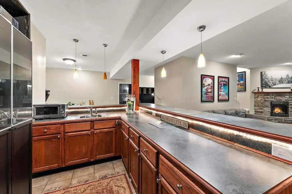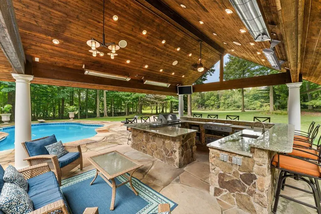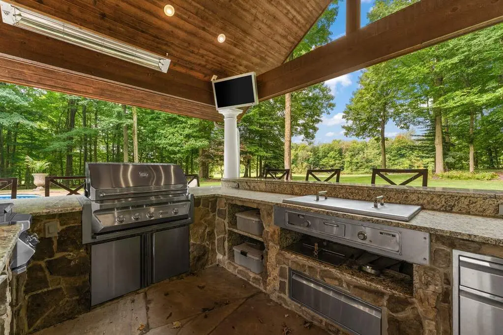 Nestled on six wooded acres, this stunning 5-bedroom, 3.5-bath home offers 4,500 sq. ft. of refined living space and exceptional privacy via a long, 800-foot winding driveway. Meticulously maintained since it was built in 2000, the home features a massive primary suite with a spa-like bathroom and an incredible walk-in closet. The kitchen offers ample counter space, high-end appliances, and a separate wet bar with beverage refrigerator, all flowing seamlessly into the main living areas. A spacious walk-out basement includes a bedroom, full bathroom, and a large entertainment area with a second wet bar--perfect for hosting. In addition, the basement offers over 900 sq. ft. of unfinished space, ideal for storage. The stone and cedar exterior complements the professionally landscaped and fully irrigated yard, surrounded by mature forest, creating a serene and picturesque setting. The oversized, heated 3-car garage offers year-round comfort and ample storage. Outdoor living is a true highlight, featuring a heated in-ground pool surrounded by an expansive stone patio, a gas fire pit, and a vaulted pavilion. The pavilion includes a full outdoor kitchen with granite countertops, a large grill, surface cooktop, beverage refrigerator, two burners, ceiling-mounted electric heaters, and is wired for TVs and a sound system. A separate barn provides two bays and attic storage, offering flexible space for hobbies, equipment, or a workshop. The property is equipped with a full-home Generac generator for peace of mind. Recent updates include two new HVAC systems (2022) and a new roof (2024) on the home, pavilion, and barn. An additional 15+ acres are available to expand the property. Please see MLS number 828377 for information regarding this exceptional property.