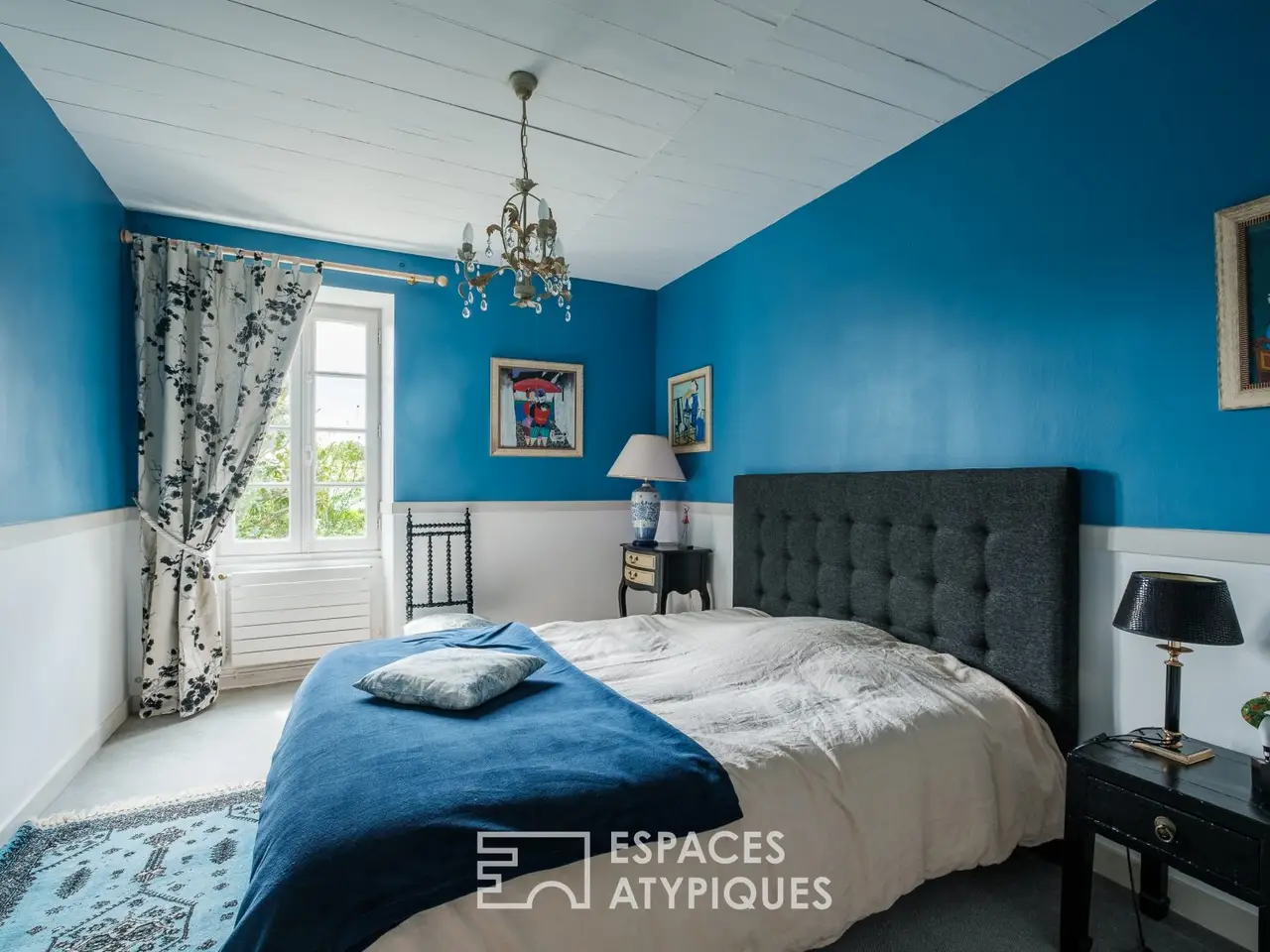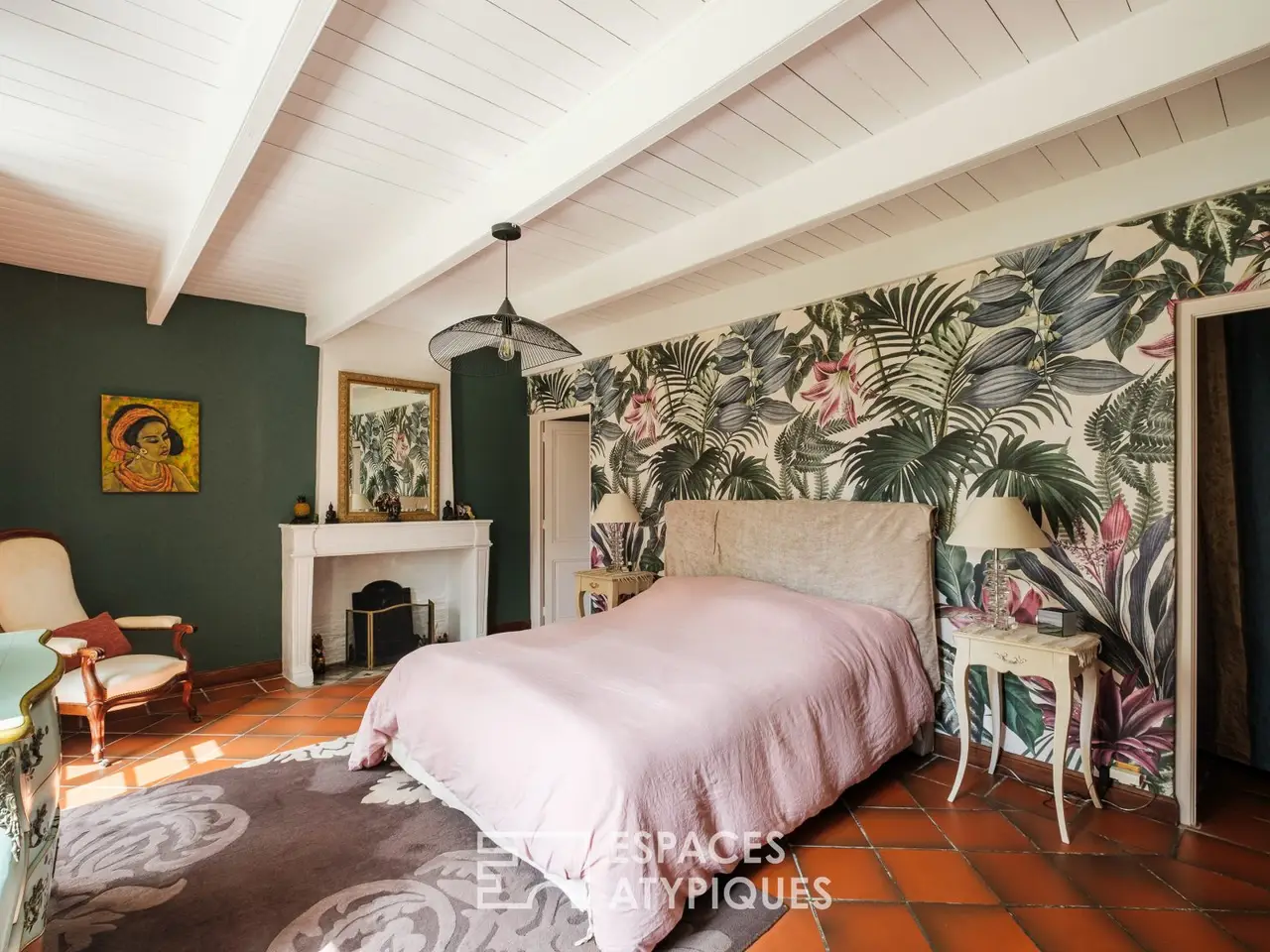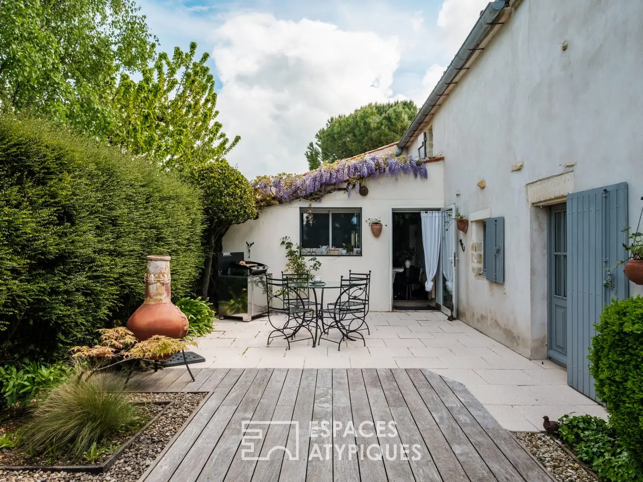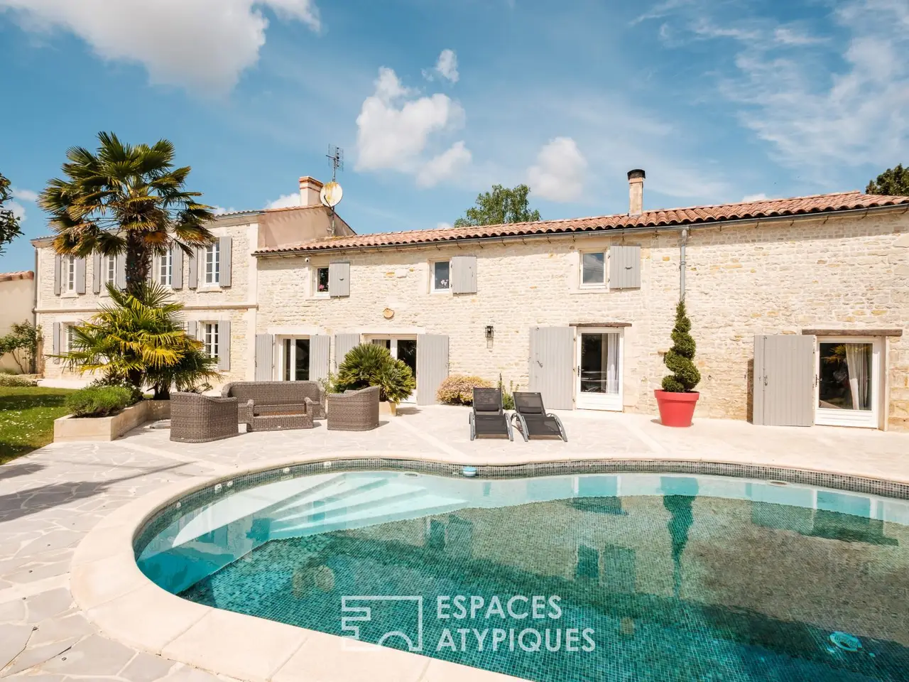 Just 6 kilometers from La Rochelle, in the heart of a vibrant town with many shops, this authentic Charentaise house of approximately 268 m2 of living space flourishes on a wooded plot of over 1,400 m2.Combining old-world charm with quality features, it reveals a privileged living environment with a landscaped garden, a heated swimming pool, several terraces, a garage, and covered parking. A rare location, sheltered from view, designed for comfortable and refined family life. From the entrance, the generous volumes and original features give this building an undeniable charm. The large living room seduces with its volume highlighted by its exposed beams and its mezzanine creating a void over the living room. In this living room, a warm atmosphere is created by a stone wall, an insert with contemporary finishes, and beautiful glass openings that open onto the sunny terrace and the swimming pool, thus extending the living space to the outdoors.Separate from but communicating with the living room, the authentic-style kitchen with a range cooker and granite worktop opens onto a second shaded terrace, ideal for summer meals. In addition, it is completed by a pantry. On this same ground floor, the office benefits from a pleasant space enhanced by the presence of an old fireplace. In its extension, a master suite of approximately 31 m2 with dressing room and bathroom ensures comfort on one level while offering a soothing view of the garden. This first level also includes an entrance with several storage spaces, a boiler room, as well as a wellness area of approximately 20 sqm (excluding living space), dedicated to the spa. The latter benefits from a green panorama thanks to a large glass facade opening onto the garden. Upstairs, the sleeping area accommodates three bright bedrooms sharing a bathroom. The mezzanine, overlooking the living room, houses a second office and a television area. From this space, a billiard room with vintage charm, approximately 22 sqm, offers the possibility of creating a fifth bedroom. In the vast landscaped garden, several spaces are designed for everyone's enjoyment. The mosaic-adorned swimming pool is accompanied by a south-facing terrace in front of the beautiful stone facade of the house. A green space decorated with a lawn invites you to savor the freshness of the surrounding vegetation. An orchard and a vegetable garden enrich this natural setting, offering the possibility of local harvests. Finally, mechanical or DIY enthusiasts will appreciate the vast courtyard that can accommodate three vehicles, complemented by a garage. A unique property where the elegance of the old building combines with a serene living environment. A house of character that will appeal to lovers of atypical real estate. ENERGY CLASS: C / CLIMATE CLASS: C. Estimated average amount of annual energy expenditure for standard use, established from energy prices for the years 2021, 2022 and 2023: between EUR3,460 and EUR4,710. Additional information * 7 rooms * 5 bedrooms * 2 shower rooms * Outdoor space : 1410 SQM * Parking : 6 parking spaces * Property tax : 1 012 €