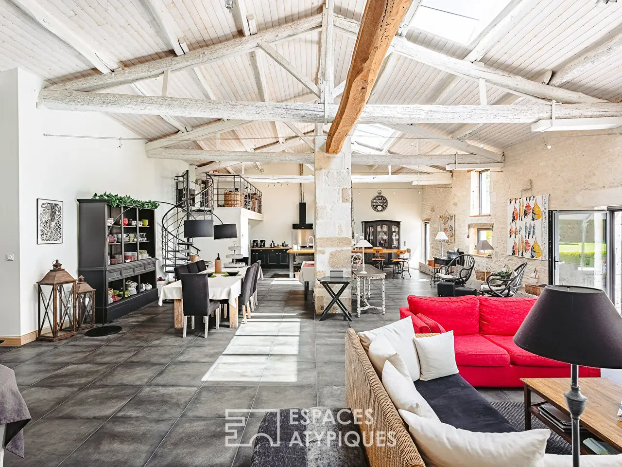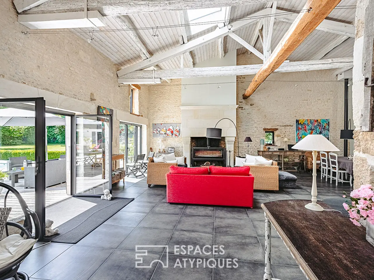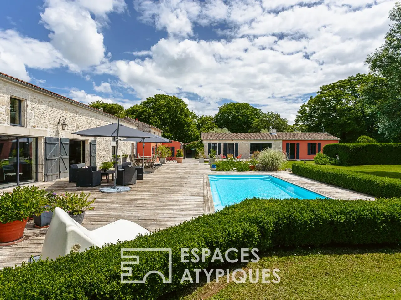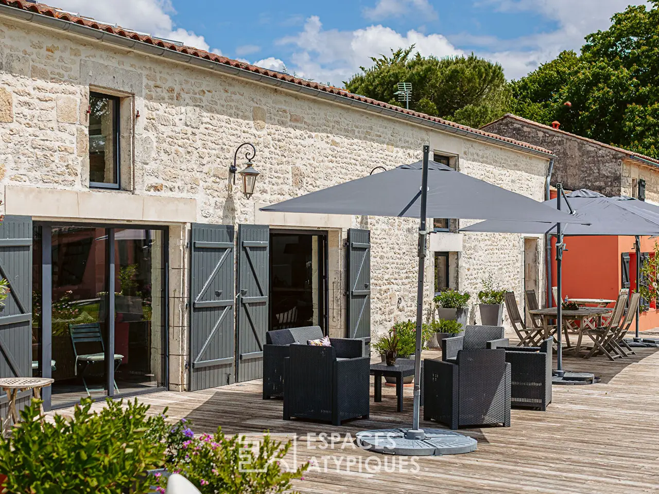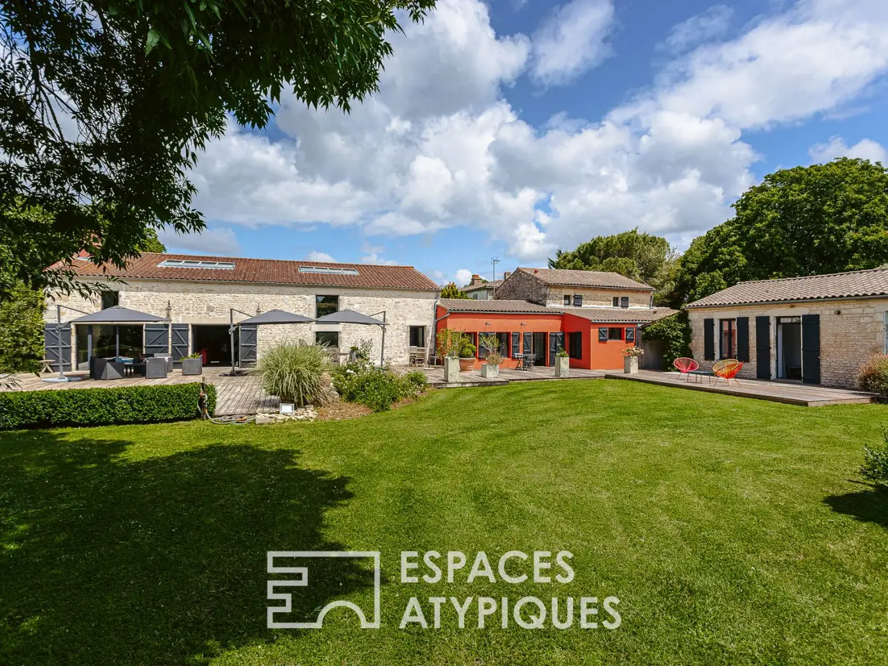 EXCLUSIVE ATYPICAL SPACESLocated in the town of Aigrefeuille-d'Aunis on a magnificent wooded plot, this exceptional property benefits from a calm and green setting just 15 minutes from the beach, and 20-25 minutes from La Rochelle. Made up of an old barn of approximately 337 m2, and a former artist's studio of approximately 98 m2, this complex forms an intimate enclosure facing its wooded park, its terraces and its swimming pool.The first buildings dating from 1583, the whole was completely renovated 10 years ago to benefit from modern comfort while maintaining an authentic atmosphere. The property now offers three guest rooms and a high-quality gite.On the barn side, facing south, an extraordinary living room of approximately 180 m2 will delight lovers of large volumes and brightness. A first lounge area takes place in front of an imposing stone fireplace mantle, while the second is more discreet to enjoy the library or the musical instruments. The kitchen area, for its part, is organized around a large central wooden island.Preserved for charm, the old stone mangers complete the decoration. Taking advantage of the volume, an office is nestled in the heights of this living room:. From the kitchen, a hallway with numerous cupboards leads to a large private bedroom upstairs.This suite of approximately 34 m2 benefits from its bathroom and dressing room. A cellar and a scullery complete this private area. Accessible from exterior terraces, three magnificent independent suites complete the ground floor of the barn.Each of them benefits from impeccable finishes with walk-in shower, double sink, and view of the park. Note that these rooms could communicate again with the private part (old configuration of the premises).Facing west with its workshop bay facing the garden, the former artist's studio is today divided into two parts.The first is a gite of approximately 53 m2 with living room-kitchen, bedroom, extra bed and bathroom. Like the guest rooms, it also benefits from its private terrace. The second part is for private use with two bedrooms and a bathroom for an area of approximately 33 m2, making it possible to create a new gite or accommodate loved ones. In the park, a first reception area allows parking for numerous vehicles. In this space, a garden shed/workshop offers plenty of storage capacity.Once there, you just have to let yourself be carried away by your curiosity to discover this green setting with century-old trees:.Friendliness, charm, relaxation, are words that suit very well to this unique property just 15 minutes from the Surgeres TGV station. All amenities in the town of Aigrefeuille-d'Aunis are accessible on foot or by bike (schools, restaurants, supermarket, etc.)ENERGY CLASS: B / CLIMATE CLASS: A. Estimated average amount of annual energy expenditure for standard use, established based on energy prices for the year 2021: between EUR2,150 and EUR2,990REF. EALR1620Additional information* 9 rooms* 6 bedrooms* 6 shower rooms* Outdoor space : 6552 SQM* Parking : 15 parking spaces* Property tax : 3 636 €Energy Performance CertificatePrimary energy consumptionb : 92 kWh/m2.anHigh performance housing*A*92kWh/m2.an3*kg CO2/m2.anB*C*D*E*F*GExtremely poor housing performance* Of which greenhouse gas emissionsa : 3 kg CO2/m2.anLow CO2 emissions*3kg CO2/m2.anA*B*C*D*E*F*GVery high CO2 emissionsEstimated average amount of annual energy expenditure for standard use, established from energy prices for the year 2021 : betwee