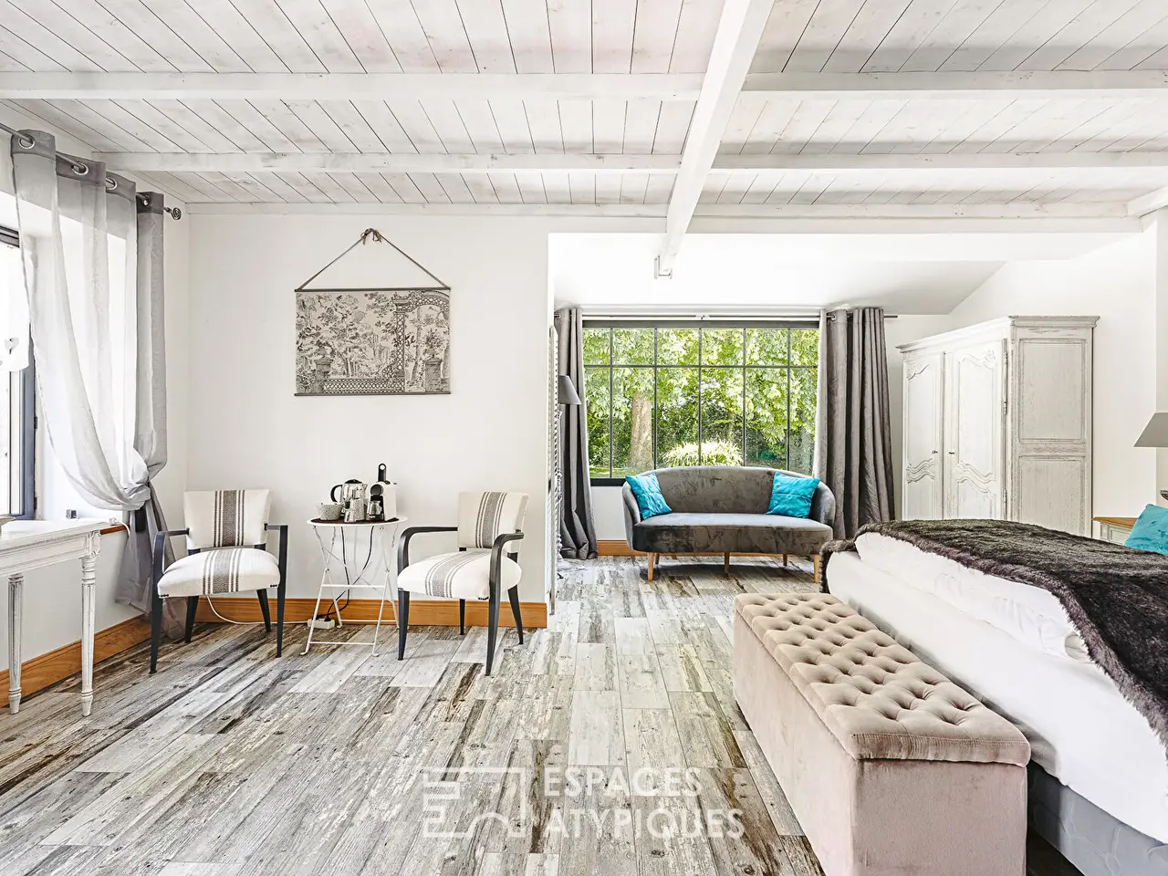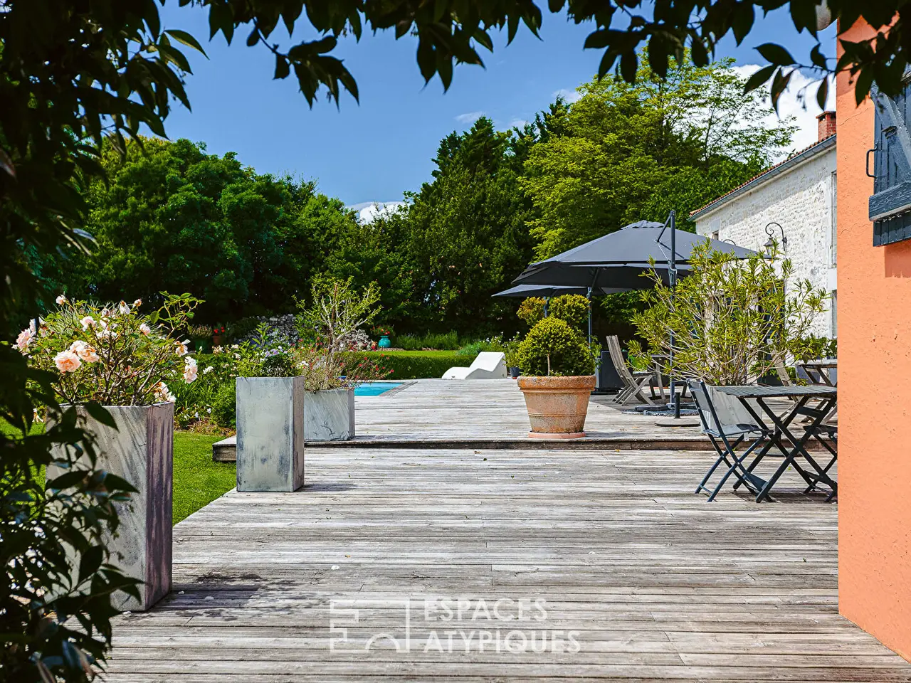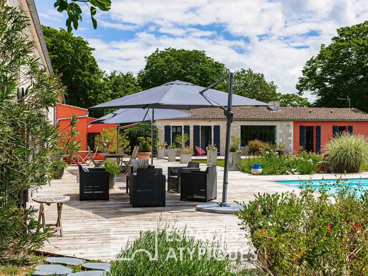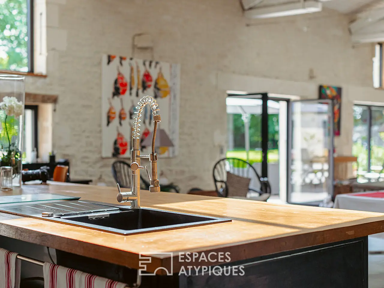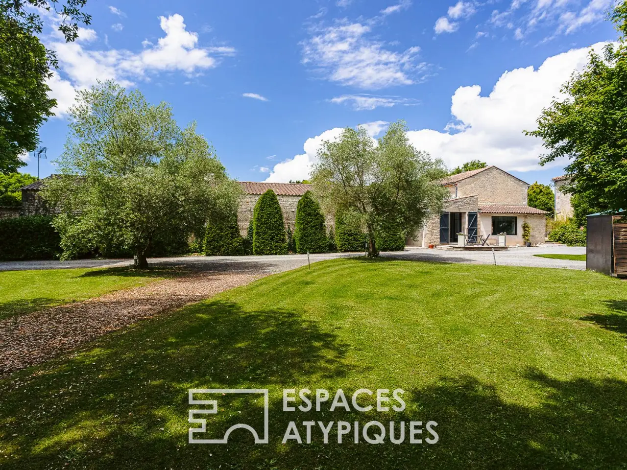 EXCLUSIVE ATYPICAL SPACESLocated in the town of Aigrefeuille-d'Aunis on a magnificent wooded plot, this exceptional property benefits from a calm and green setting just 15 minutes from the beach, and 20-25 minutes from La Rochelle. Made up of an old barn of approximately 337 m2, and a former artist's studio of approximately 98 m2, this complex forms an intimate enclosure facing its wooded park, its terraces and its swimming pool.The first buildings dating from 1583, the whole was completely renovated 10 years ago to benefit from modern comfort while maintaining an authentic atmosphere. The property now offers three guest rooms and a high-quality gite.On the barn side, facing south, an extraordinary living room of approximately 180 m2 will delight lovers of large volumes and brightness. A first lounge area takes place in front of an imposing stone fireplace mantle, while the second is more discreet to enjoy the library or the musical instruments. The kitchen area, for its part, is organized around a large central wooden island.Preserved for charm, the old stone mangers complete the decoration. Taking advantage of the volume, an office is nestled in the heights of this living room:. From the kitchen, a hallway with numerous cupboards leads to a large private bedroom upstairs.This suite of approximately 34 m2 benefits from its bathroom and dressing room. A cellar and a scullery complete this private area. Accessible from exterior terraces, three magnificent independent suites complete the ground floor of the barn.Each of them benefits from impeccable finishes with walk-in shower, double sink, and view of the park. Note that these rooms could communicate again with the private part (old configuration of the premises).Facing west with its workshop bay facing the garden, the former artist's studio is today divided into two parts.The first is a gite of approximately 53 m2 with living room-kitchen, bedroom, extra bed and bathroom. Like the guest rooms, it also benefits from its private terrace. The second part is for private use with two bedrooms and a bathroom for an area of approximately 33 m2, making it possible to create a new gite or accommodate loved ones. In the park, a first reception area allows parking for numerous vehicles. In this space, a garden shed/workshop offers plenty of storage capacity.Once there, you just have to let yourself be carried away by your curiosity to discover this green setting with century-old trees:.Friendliness, charm, relaxation, are words that suit very well to this unique property just 15 minutes from the Surgeres TGV station. All amenities in the town of Aigrefeuille-d'Aunis are accessible on foot or by bike (schools, restaurants, supermarket, etc.)ENERGY CLASS: B / CLIMATE CLASS: A. Estimated average amount of annual energy expenditure for standard use, established based on energy prices for the year 2021: between EUR2,150 and EUR2,990REF. EALR1620Additional information* 9 rooms* 6 bedrooms* 6 shower rooms* Outdoor space : 6552 SQM* Parking : 15 parking spaces* Property tax : 3 636 €Energy Performance CertificatePrimary energy consumptionb : 92 kWh/m2.anHigh performance housing*A*92kWh/m2.an3*kg CO2/m2.anB*C*D*E*F*GExtremely poor housing performance* Of which greenhouse gas emissionsa : 3 kg CO2/m2.anLow CO2 emissions*3kg CO2/m2.anA*B*C*D*E*F*GVery high CO2 emissionsEstimated average amount of annual energy expenditure for standard use, established from energy prices for the year 2021 : betwee