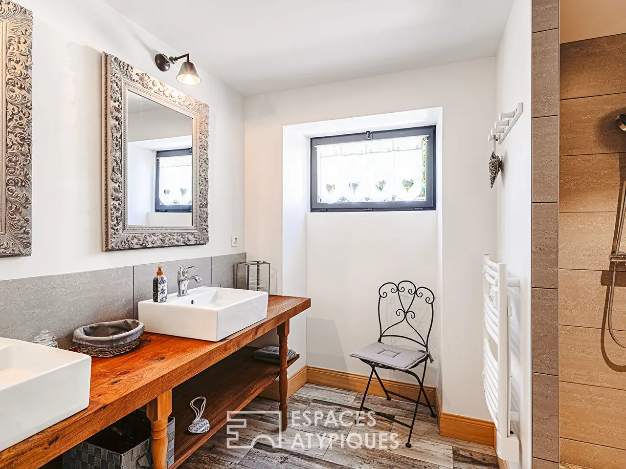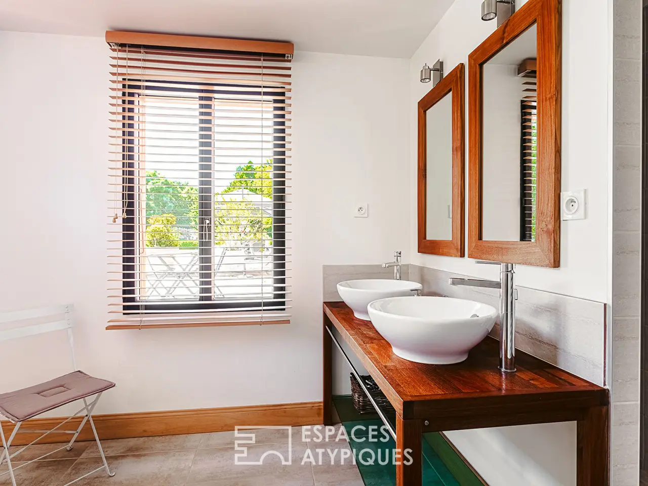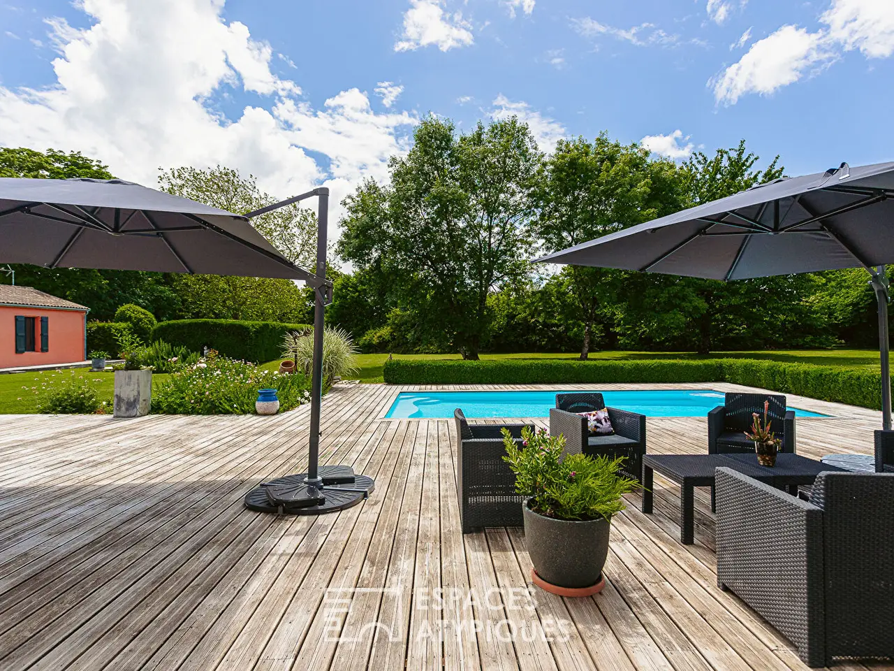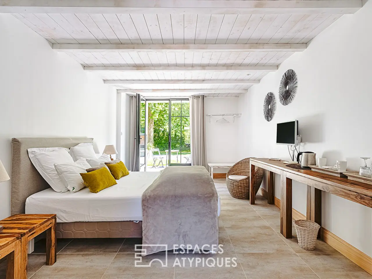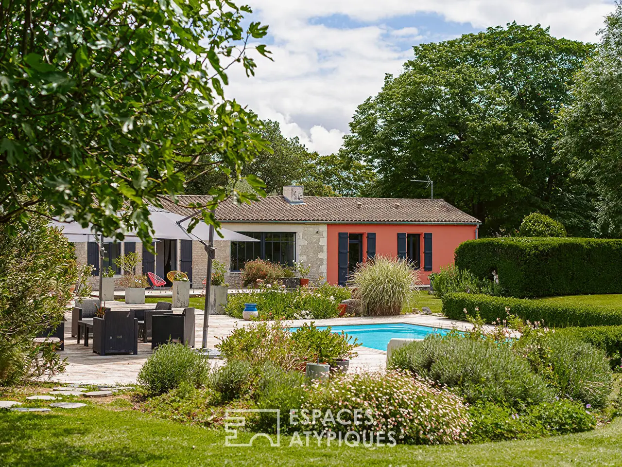 EXCLUSIVE ATYPICAL SPACESLocated in the town of Aigrefeuille-d'Aunis on a magnificent wooded plot, this exceptional property benefits from a calm and green setting just 15 minutes from the beach, and 20-25 minutes from La Rochelle. Made up of an old barn of approximately 337 m2, and a former artist's studio of approximately 98 m2, this complex forms an intimate enclosure facing its wooded park, its terraces and its swimming pool.The first buildings dating from 1583, the whole was completely renovated 10 years ago to benefit from modern comfort while maintaining an authentic atmosphere. The property now offers three guest rooms and a high-quality gite.On the barn side, facing south, an extraordinary living room of approximately 180 m2 will delight lovers of large volumes and brightness. A first lounge area takes place in front of an imposing stone fireplace mantle, while the second is more discreet to enjoy the library or the musical instruments. The kitchen area, for its part, is organized around a large central wooden island.Preserved for charm, the old stone mangers complete the decoration. Taking advantage of the volume, an office is nestled in the heights of this living room:. From the kitchen, a hallway with numerous cupboards leads to a large private bedroom upstairs.This suite of approximately 34 m2 benefits from its bathroom and dressing room. A cellar and a scullery complete this private area. Accessible from exterior terraces, three magnificent independent suites complete the ground floor of the barn.Each of them benefits from impeccable finishes with walk-in shower, double sink, and view of the park. Note that these rooms could communicate again with the private part (old configuration of the premises).Facing west with its workshop bay facing the garden, the former artist's studio is today divided into two parts.The first is a gite of approximately 53 m2 with living room-kitchen, bedroom, extra bed and bathroom. Like the guest rooms, it also benefits from its private terrace. The second part is for private use with two bedrooms and a bathroom for an area of approximately 33 m2, making it possible to create a new gite or accommodate loved ones. In the park, a first reception area allows parking for numerous vehicles. In this space, a garden shed/workshop offers plenty of storage capacity.Once there, you just have to let yourself be carried away by your curiosity to discover this green setting with century-old trees:.Friendliness, charm, relaxation, are words that suit very well to this unique property just 15 minutes from the Surgeres TGV station. All amenities in the town of Aigrefeuille-d'Aunis are accessible on foot or by bike (schools, restaurants, supermarket, etc.)ENERGY CLASS: B / CLIMATE CLASS: A. Estimated average amount of annual energy expenditure for standard use, established based on energy prices for the year 2021: between EUR2,150 and EUR2,990REF. EALR1620Additional information* 9 rooms* 6 bedrooms* 6 shower rooms* Outdoor space : 6552 SQM* Parking : 15 parking spaces* Property tax : 3 636 €Energy Performance CertificatePrimary energy consumptionb : 92 kWh/m2.anHigh performance housing*A*92kWh/m2.an3*kg CO2/m2.anB*C*D*E*F*GExtremely poor housing performance* Of which greenhouse gas emissionsa : 3 kg CO2/m2.anLow CO2 emissions*3kg CO2/m2.anA*B*C*D*E*F*GVery high CO2 emissionsEstimated average amount of annual energy expenditure for standard use, established from energy prices for the year 2021 : betwee