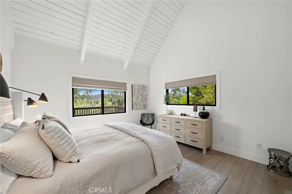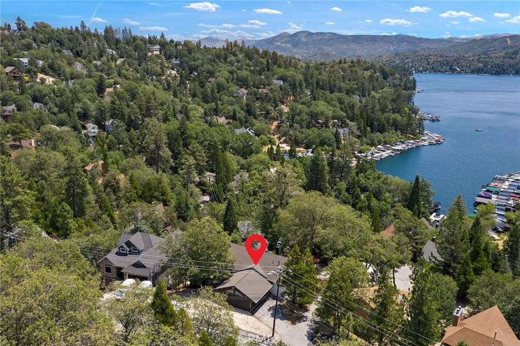 This stunning 4-bedroom, 3.5-bath mountain retreat combines modern upgrades with timeless lodge-style charm, offering captivating lake views from nearly every window. Thoughtfully remodeled in 2020-2021, the home features a bright open floor plan perfect for both comfort and entertaining. The main level showcases a dramatic great room with vaulted ceilings, expansive windows, recessed lighting, and a cozy gas fireplace that opens to a large entertainer's deck. The remodeled kitchen is a chef's dream with stainless steel appliances including a refrigerator, shaker-style cabinetry, pantry with pullout shelves, granite counters, peninsula with seating, and large windows framing the view. Two primary suites with spa-inspired baths--one on the main level and another on the lower level--provide privacy and flexibility, while two additional bedrooms and a spacious family room with a second fireplace and walk-out access to the lower deck with a swinging bench create the perfect retreat for family and guests. Outdoor living shines with two expansive decks crafted in durable Trek decking, ideal for gatherings, dining, or simply enjoying the mountain air and lake views. Additional highlights include dual HVAC and A/C systems with split thermostats, vinyl flooring throughout, inside laundry with washer and dryer, a finished pull-through two-car garage with automatic doors on both sides, and ample guest parking. Sold mostly furnished for a true move-in ready experience, this home is ideally located just above the trails of North Bay Cove with lake rights, peaceful morning walks, sunset strolls, and easy access off Bay Road with level parking. Just minutes from Blue Jay and Lake Arrowhead Village shops and dining, this exceptional property offers the perfect blend of modern amenities, mountain appeal, and lake lifestyle--whether as a primary residence, weekend escape.