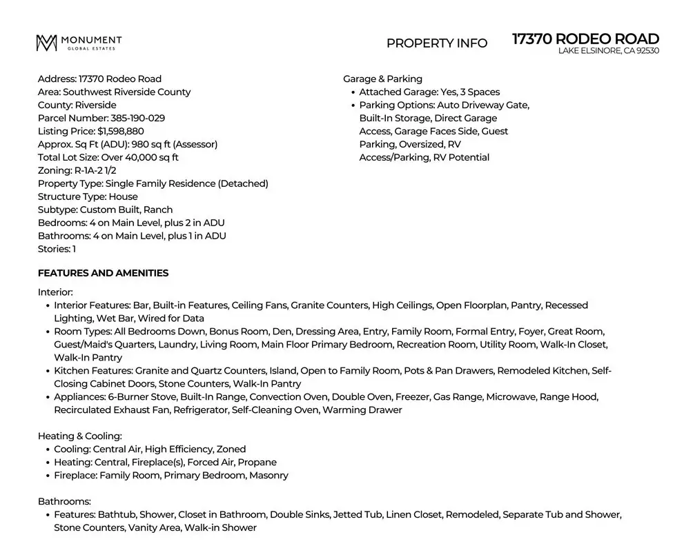 Welcome to 17370 Rodeo Road, a stunning ranch estate home nestled in the exclusive gated equestrian community of Rancho Capistrano near Rancho Mission Viejo. This brand-new luxury residence spans approximately 4750 sqft, plus a 650 sqft attached garage, and is set on a sprawling 2.3-acre lot. The open floor plan includes a separate dining room, family room, and great room with a modern fireplace and a vast wet bar, perfect for entertaining. The gourmet kitchen is a chef's dream, featuring granite countertops, open shelves, a commercial-grade Bertazzoni dual fuel stove, a large double farm sink, a custom island with a built-in microwave oven/convection oven and warming drawer, ample storage, and a walk-in pantry. The luxurious master suite boasts a gas fireplace, French doors with vineyard views, two large walk-in closets, and an elegant bathroom with double sinks, a jacuzzi tub, and a spacious walk-in shower. Three additional oversized bedrooms and three bathrooms provide ample space for family and guests. The expansive outdoor space offers endless possibilities, from building your dream equestrian facilities to creating organic gardens. Enjoy community and mountain horse trails, hiking, biking, and other outdoor adventures right at your doorstep. The location is ideal for equestrian enthusiasts, being strategically situated between two top AA-rated equestrian horse show grounds. Modern conveniences include super high-speed internet, wireless connectivity throughout, and smart home features. Additionally, the property includes a grandfathered-in, updated 975 sqft detached ADU with 2 bedrooms and 1 bathroom, perfect for rental income or accommodating guests or a caretaker. Rancho Capistrano is a serene and secure community, offering the best of equestrian and outdoor lifestyles amidst breathtaking scenery. Close proximity to gorgeous beaches and Lake Elsinore provides opportunities for water sports and fishing. Embrace the enviable ranch life you've always dreamed of at 17370 Rodeo Road. With its modern amenities, luxurious living spaces, and prime location, this home is a rare find in Southern California.