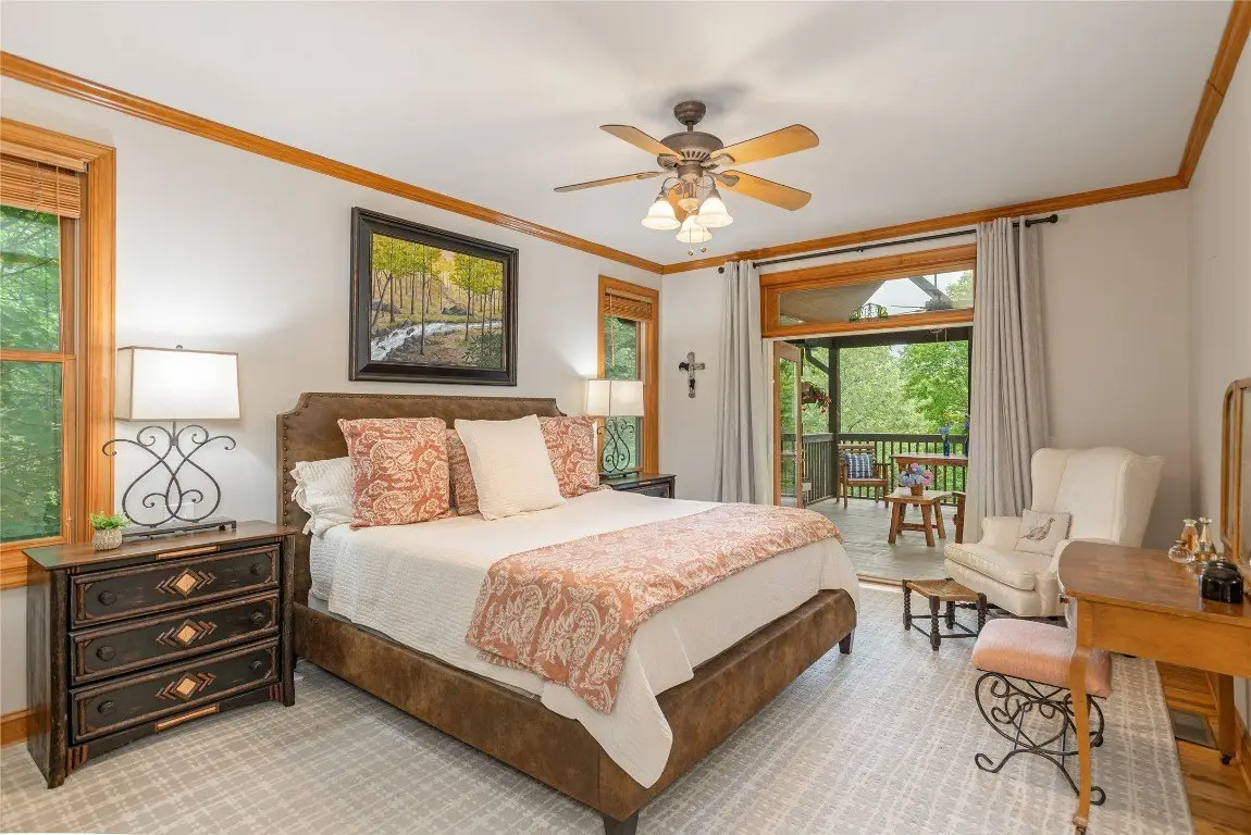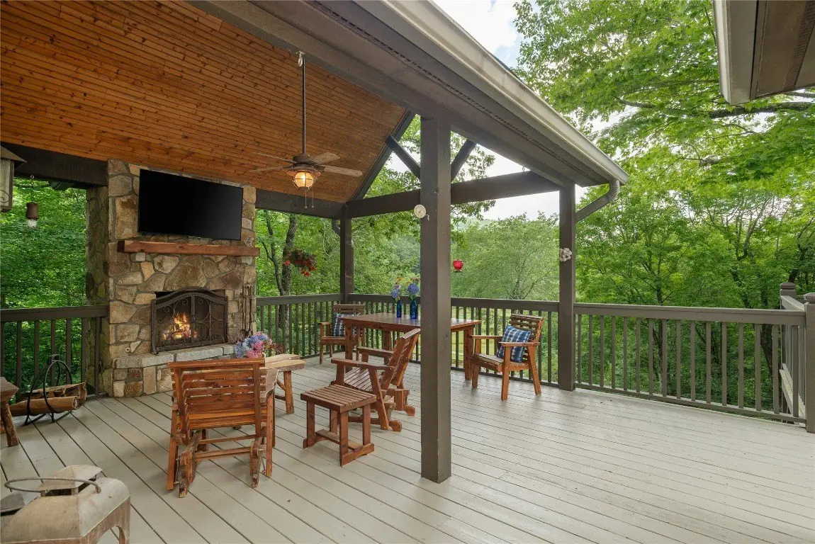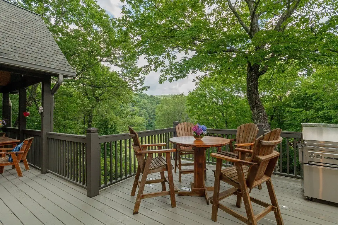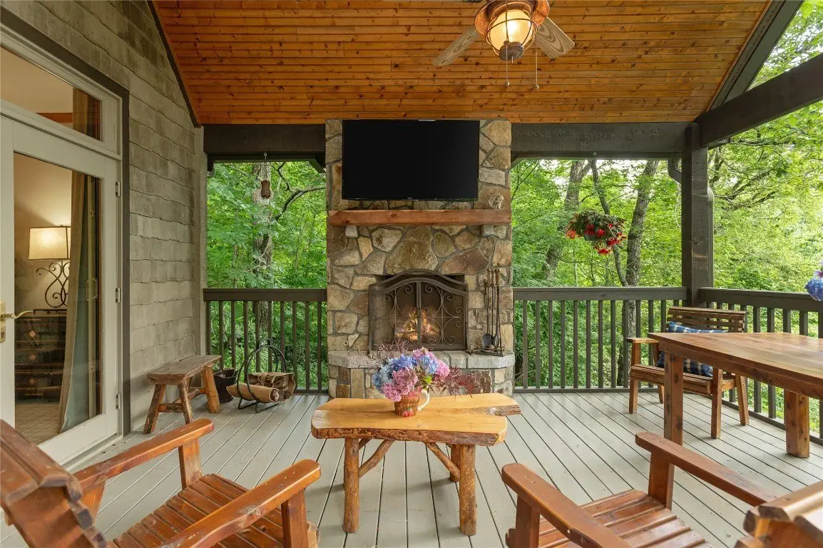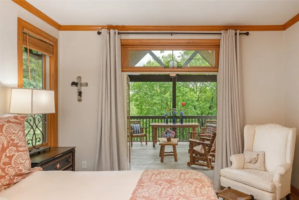 This one-of-a-kind, beautifully maintained four-bedroom, four-bathroom Arts and Crafts mountain retreat combines timeless craftsmanship with refined comfort, offering expansive golf course and mountain views from a prized location along the fifth green of the Lake Toxaway Golf Course. A private winding golf cart path leads from the home across a gentle stream and charming bridge directly onto the fairway, inviting peaceful excursions right from the backyard. The lushly landscaped entry, complete with a tranquil water feature, sets the stage for the serenity that defines this exceptional escape. Inside, custom details and quality finishes abound - a striking locust column and crown moulding as well as slate, oak, and ceramic tile flooring and a heated marble bathroom floor in the primary suite, which blends beauty and comfort. The main level features a vaulted ceiling entryway, a welcoming living room featuring a stone fireplace, an updated chef's kitchen with high-end stainless steel appliances, pot filler, ample counter space, a spacious laundry/mudroom, a comfortable guest suite, and a generous primary suite that opens to a covered Carolina porch with skylights and its own outdoor fireplace - perfect for cool evenings. Upstairs includes a private guest suite, additional living area, and a versatile bonus room. The lower level offers a cozy family room with a kitchenette and free-standing fireplace, a wine cellar, a light-filled flex room, a large guest suite, and a workshop. Outdoor spaces include open decks on both levels, a hot tub under the stars, and ample parking with a double garage - ideal for hosting family and friends. Located less than an hour from Asheville Regional Airport and close to the charming towns of Cashiers, Highlands, Sapphire, and Brevard, this home offers easy access to national forests, hiking trails, waterfalls, and endless adventure. An optional membership at Lake Toxaway Country Club provides golf, tennis, dining, fitness, pool, and private lake access. This exceptional retreat is more than a home - it's a lifestyle.