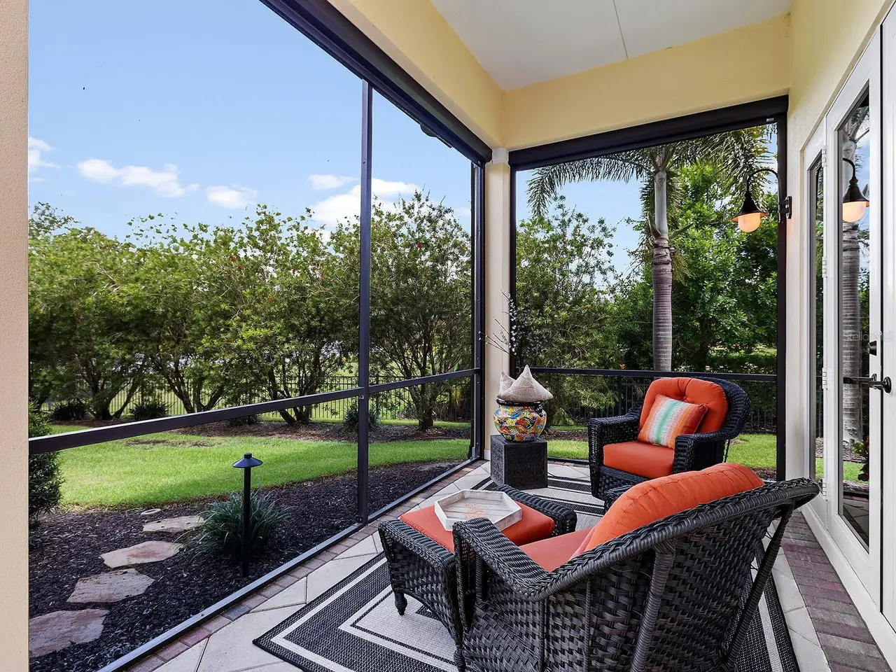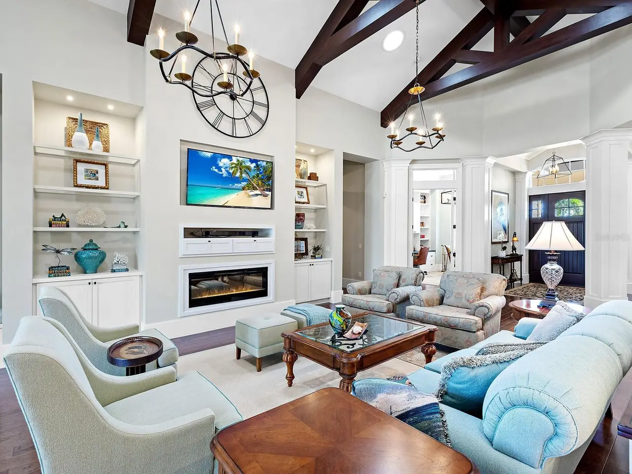 With stunning sunset views over the sparkling lake, this picture-perfect home in The Lake Club is truly a rare find in all of Lakewood Ranch! Built in 2016 is this completely custom home built by award-winning Nutter Custom Construction. Every detail in this residence has been meticulously selected for a luxurious yet functional lifestyle. Situated on 0.76 acres, this spacious lot affords you additional privacy, manicured landscaping, and over 80 feet of lakefront. In addition to the opulent upgrades inside, this home is outfitted with a rare METAL ROOF that offers up to 50 years of life, and IMPACT windows and doors throughout. From the spacious paver driveway surrounded by beautiful landscaping, you’re welcomed home to a charming front porch entry with Caribbean box railing and mahogany front door. The foyer invites you in with volume ceiling and custom painted wall to the open floor plan. The grand great room is truly the heart of the home and showcases vaulted ceilings with hand-stained wood beams, cozy electric fireplace, engineered hardwood flooring, custom built-in shelving, solar tubes for an abundance of natural light, and impact rated French doors to the lanai. Outdoors you’ll be immediately impressed with the western views of the lake, spacious gathering areas, custom ceilings, and colonnade screen enclosure. The heated pool and spa offers the ideal place to gather at one end around the gas firepit; or relax in the spa at the other end lakeside. Enjoy dinners alfresco from the outdoor kitchen expertly equipped with a Lynx grill, beverage refrigerator, and built-in ice chest cooler. Inside the chef will adore preparing meals in the gourmet kitchen complete with solid wood cabinetry including appliance bay and wine rack, quartz counters, central island with seating, and walk-in pantry with shelving. The high-end appliance suite includes a Jenn-Air paneled refrigerator, Wolf built-in microwave and wall oven, KitchenAid warming drawer, Miele dishwasher, and Bosch induction cooktop with flex bridge burners that make cooking a breeze. Dine in the formal dining room with designer chandelier, or in the casual dinette with built-in cabinetry. When you’re ready to end the day in relaxation, retreat to the primary suite with vaulted ceiling, dual custom walk-in closets, separate seating area, and private lanai with remote-controlled shades. Your primary bath is a sanctuary with dual split vanities, limestone tile, walk-in shower with bench, soaking tub, and private courtyard. Guests will enjoy their own luxe accommodations in the second primary bedroom with private en-suite bathroom and walk-in closet that is ideal for long-term guests or could be used as a bonus room; or the two additional guest bedrooms with walk-in closets and jack & jill bathroom. Rounding out this one-of-a-kind residence is a study with custom built-in shelving and desk, laundry room with plentiful storage, mudroom entry with 3 closets, and guest powder bathroom. Don’t forget about the oversized 3-car garage with fans to keep cool, custom storage cabinetry and workbench, and air-conditioned Florida basement perfect for storage. The Lake Club is an exclusive premier, gated community with a Grande Clubhouse, restaurant, pool, tennis, pickleball and more.