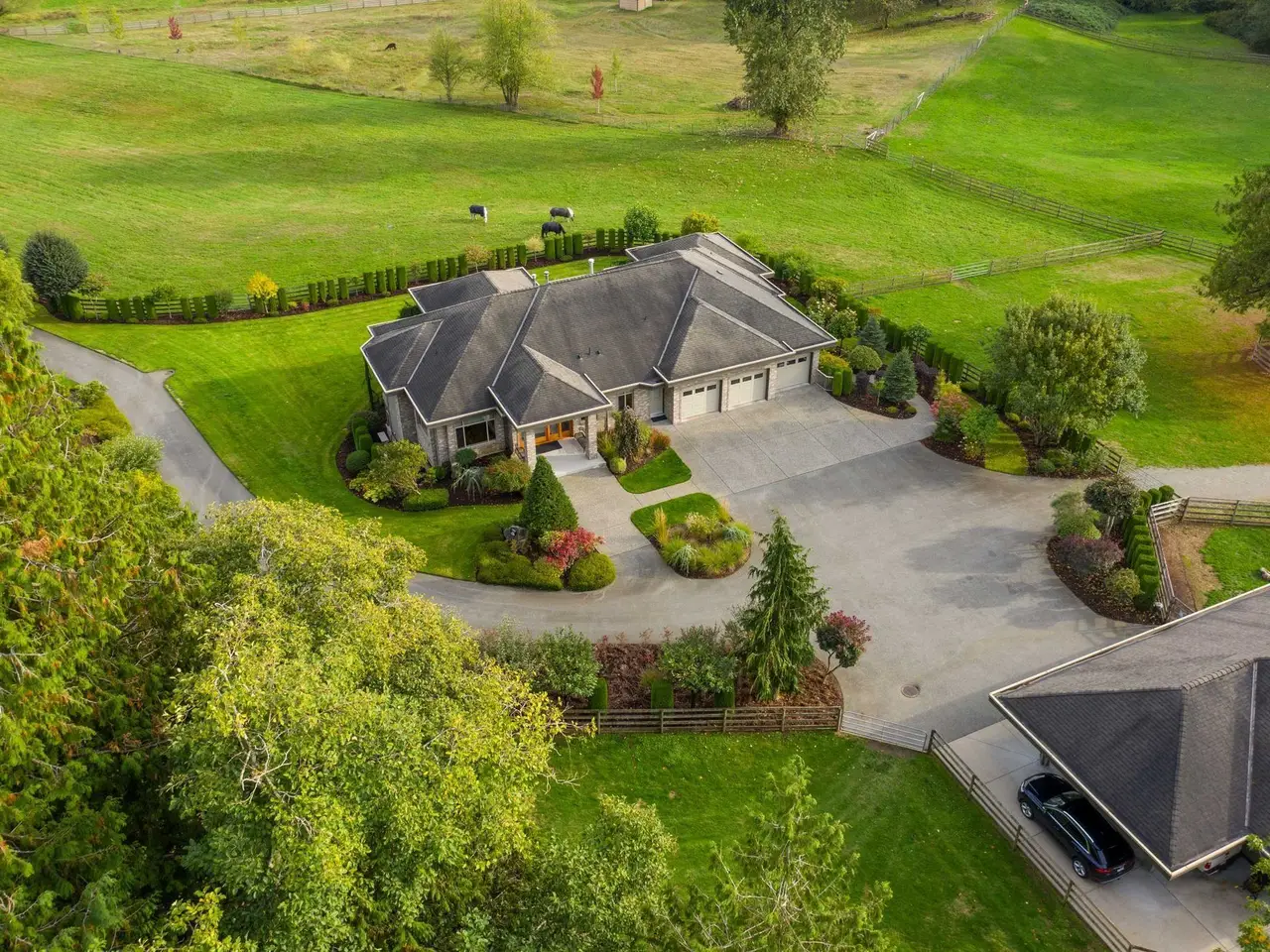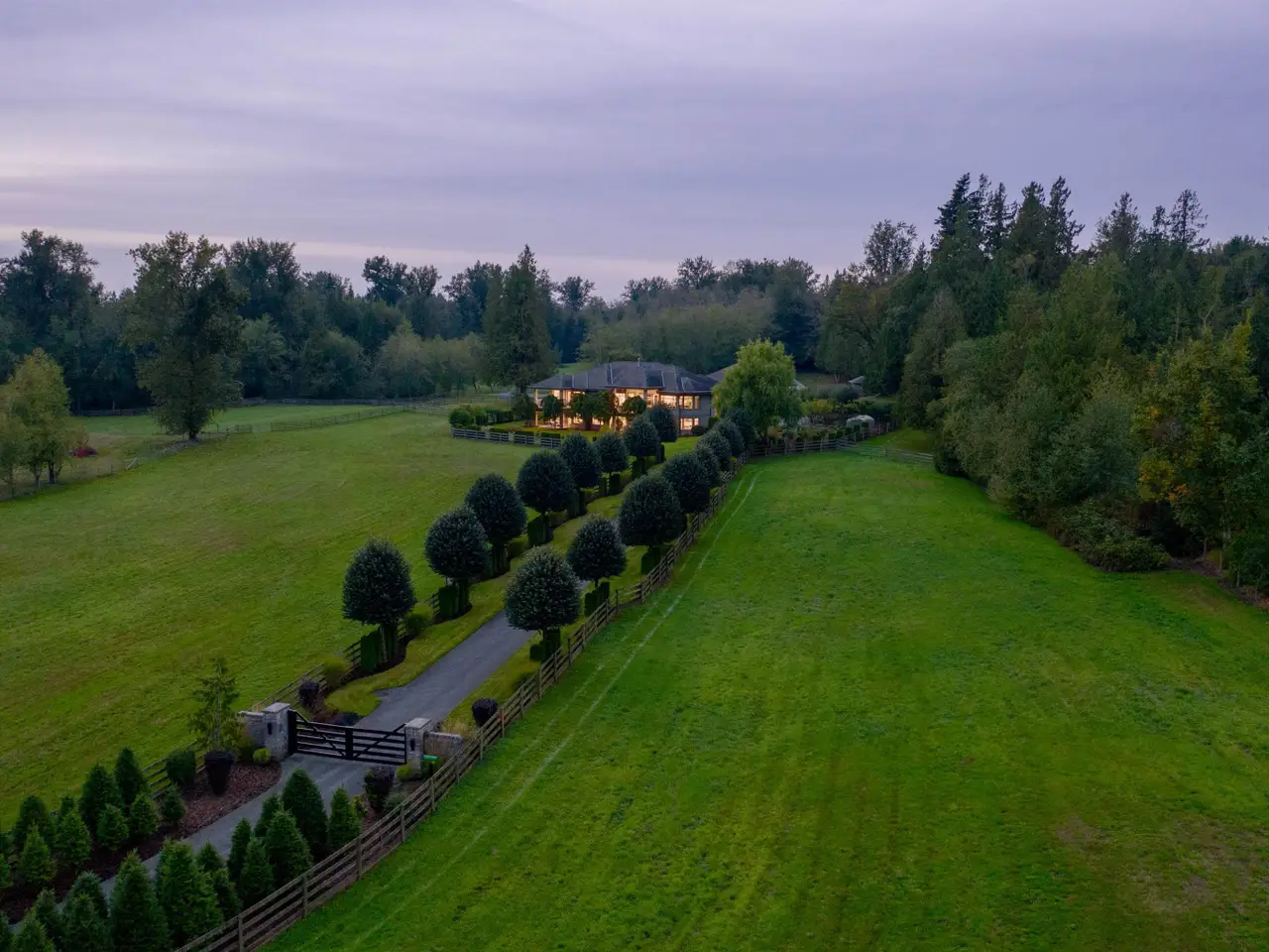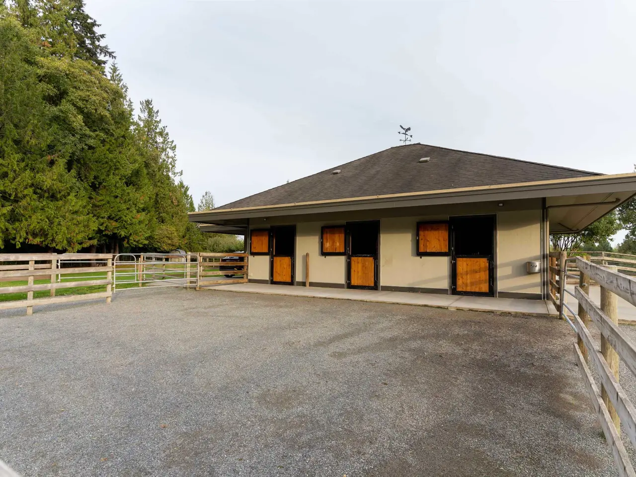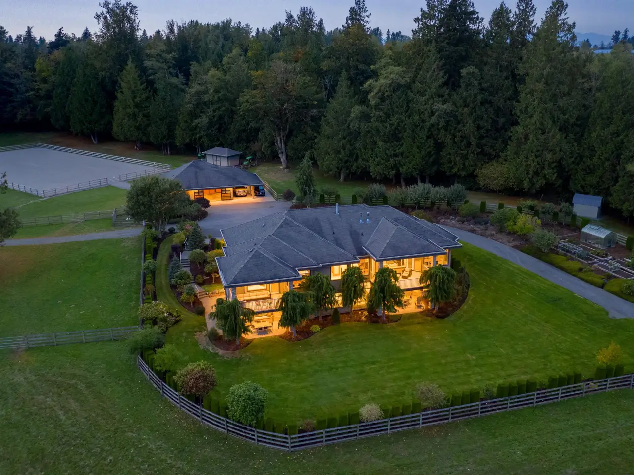 Outstanding 28.39-acre Equestrian Estate, 1000’ tree-lined commercial grade driveway with dual automated gates. Highlights include a boutique 3-stall barn, Olympic-sized outdoor arena, rolling grass pastures, and 4 km of private riding trails. The fully renovated 6412 SF, 6-bed, 6-bath home offers 10’ ceilings, two luxury kitchens, spa-inspired baths, gym, and stunning Mount Baker views. Property includes irrigated lawns, fenced paddocks, hay fields, fruit trees, and organic gardens. A rare opportunity for turnkey country living, with first class equestrian facilities.