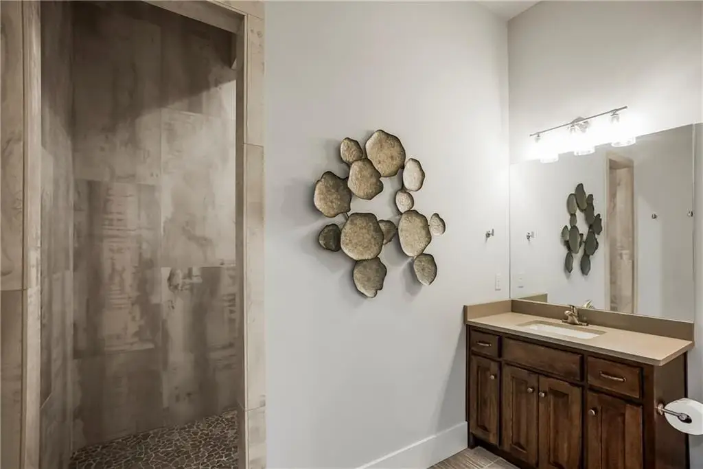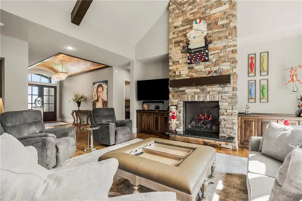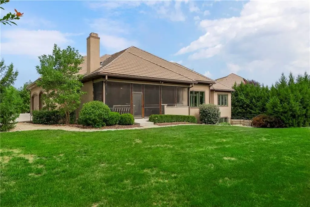 This fabulous custom home built by Starr Homes sits nestled on a wonderfully landscaped and private cul-de-sac lot in Leawood's highly sought Highlands Creek Subdivision. The open concept spacious main floor features vaulted ceilings, a cozy fireplace and gorgeous views of your private treed backyard. The kitchen features a stunning under-lit granite island, Thermador appliances and a large breakfast/dining area that opens to a fabulous lanai with built-in grill, fireplace and gas heater offering a wonderful extension of the indoors great for entertaining or just enjoying your private backyard. You'll find a fabulous primary suite on the main floor with a spa-like primary bath with large walk through double shower, adjacent laundry room and large walk-in closet. One additional bedroom on the main currently used as an office walks out to the lanai along with a large pantry, mud room and 1 1/2 additional baths can also be found on the main. The stunning lower level with 11' ceilings walks out to a spacious patio and features a full bar, wine cellar, rec/media room and 23x17 HD golf simulator. Three large bedrooms with private baths and plenty of storage space complete the lower level. This home has so much to offer with a 4-car side-entry garage with epoxy floors that is wired for an EV charger. At 5,848 finished sq ft and an overall sq ft of 7,869 and complete with an elevator and zero entry from the garage, this home truly offers something for everyone!