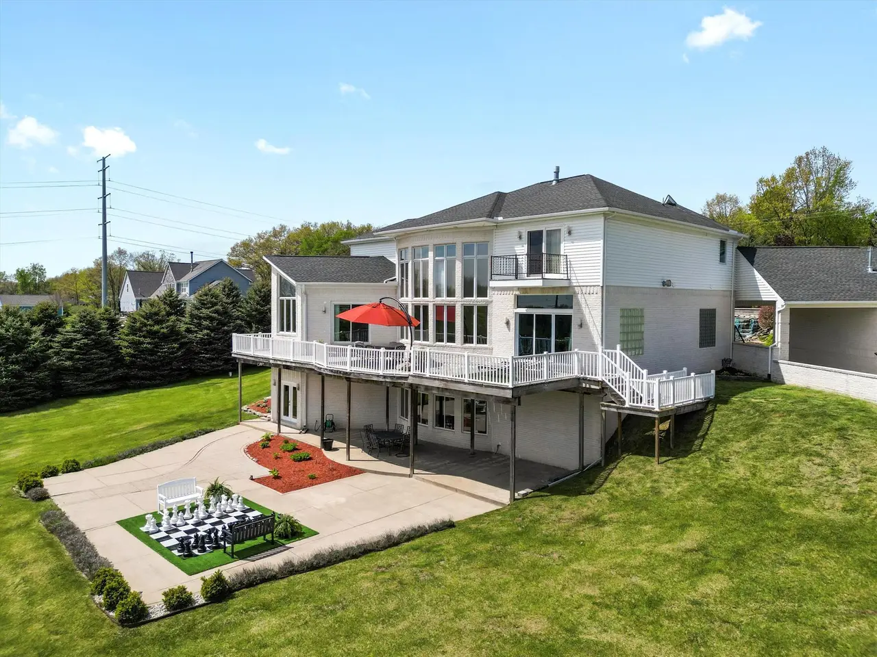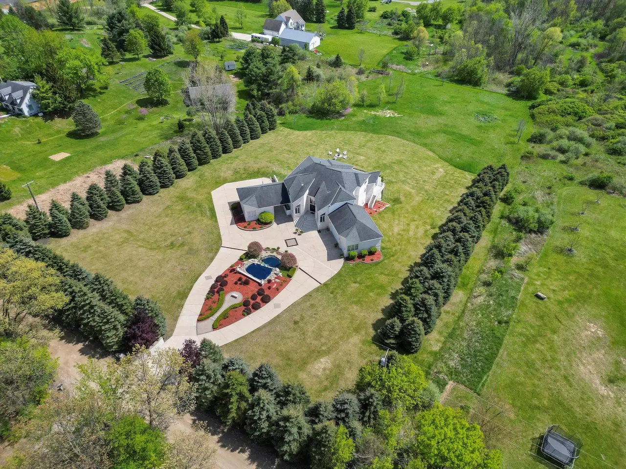 Contemporary Modern estate on 3+ private acres in Addison Township. This spacious home offers 5 bedrooms, 4 full baths, and 1 half bath, including two primary suites—one on the main floor and one on the second level. Open floor plan with clean lines and abundant natural light. The home features a 5-car garage setup with a separate 2-car and 3-car garage. A circular driveway with a water fountain feature provides an elegant entrance. Enjoy outdoor living on the expansive deck that spans the entire back of the home, overlooking a serene property with 100 planted pine trees for added privacy and beauty. The finished walk-out basement includes a home gym, game room, second kitchen, and full bathroom, offering flexible living and entertaining options. Located in a quiet, natural setting yet convenient to Lake Orion, Rochester, and area amenities. This property combines modern style, function, and seclusion.