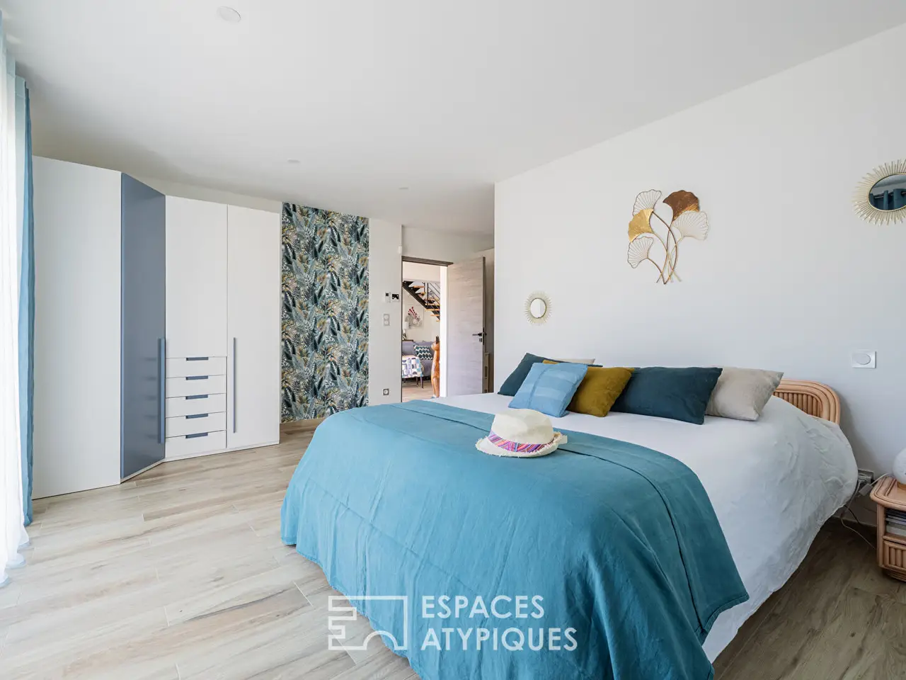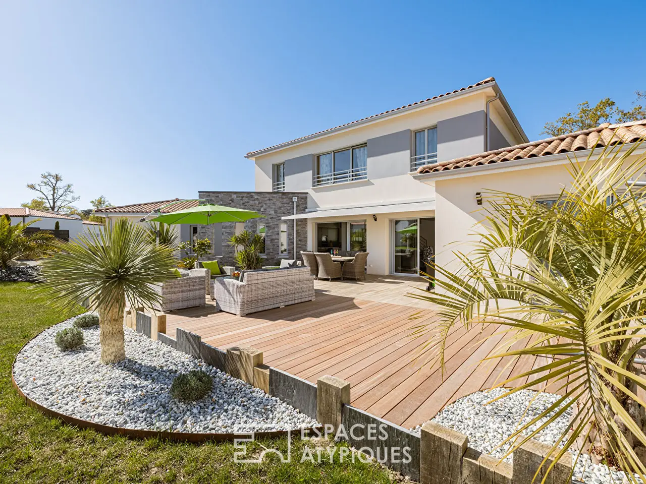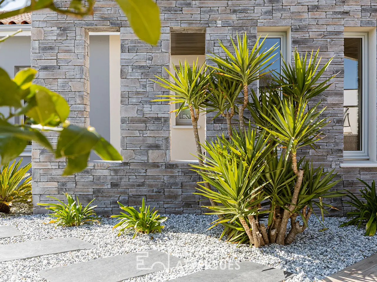EXCLUSIVE ATYPICAL SPACESLocated in a privileged environment in Les Mathes-La Palmyre, this contemporary villa of approximately 192m2, completed at the end of 2023, is spread over a plot of more than 1000m2 within a luxury private residence comprising only seven properties. It benefits from a seaside resort open to the Atlantic, renowned for its fine sandy beaches lined with maritime pines and the 8000 hectares of the La Coubre forest, a permanent invitation to relax, swim, and escape into nature.Upon entering, a reception dressing room and guest toilet set the tone. The custom-made kitchen, designed by MOBALPA, seduces with its central island, the true heart of the home where lively conversations and culinary moments mingle. A utility room-pantry and a separate laundry room with direct access to the garage complete this functional space. The living room, with an area of approximately 64 m2, facing south-east, bathed in light thanks to its large bay windows, offers a pleasant atmosphere.Its dining area extends the indoor-outdoor atmosphere from the first rays of the sun. The master suite, facing the terrace, offers a real cocoon with its large dressing room and spacious private bathroom, complete with integrated toilet. Finally, an office, easily transformed into a bedroom, opens onto a terrace, revealing interesting development prospects. The staircase rises lightly to reveal, upstairs, a living space with a view overlooking the garden and its terrace below, converted into a lounge-library area. This sleeping area includes two comfortable bedrooms, one of which is a suite.The first has a closet-dressing room, while the second offers a real relaxation area with a living room equipped with a convertible sofa, completed by a bedroom with a dressing room.An elegantly designed shared bathroom serves these two bedrooms and is accompanied by a separate toilet for added comfort. Ideally located in the heart of a carefully landscaped setting, where plants, borders and creations skillfully blend wood and slate, it extends towards an elegant terrace ready to accommodate a jacuzzi, a spa (arrivals pending) or even a swimming pool, the plot being buildable. In fine weather, a summer lounge and a dining area are installed under the awning, offering a friendly and refined setting. Equipped with the latest technologies and a home automation system including heated floors, it offers absolute comfort.An elegant and soothing place, sheltered from the hustle and bustle, located just 1 km from La Palmyre beach and 1.5 km from the market and shops.Whether as a primary or secondary residence, this villa reveals a privileged living environment, where serenity and the sweetness of life take on their full meaning.ENERGY CLASS: A / CLIMATE CLASS: A. Estimated average amount of annual energy expenditure for standard use, established from 2021 energy prices: between EUR520 and EUR750.REF. EALR2169Additional information* 6 rooms* 4 bedrooms* 1 bathroom* 1 bathroom* 1 floor in the building* Outdoor space : 1000 SQM* Parking : 1 parking space* Property tax : 1 318 €Energy Performance CertificatePrimary energy consumptiona : 42 kWh/m2.yearHigh performance housing*42kWh/m2.year1*kg CO2/m2.yearA*B*C*D*E*F*GExtremely poor housing performance* Of which greenhouse gas emissionsa : 1 kg CO2/m2.yearLow CO2 emissions*1kg CO2/m2.yearA*B*C*D*E*F*GVery high CO2 emissionsEstimated average amount of annual energy expenditure for standard use, established from energy prices for
