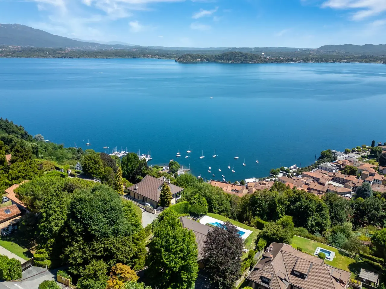 In a panoramic and private location on the hills of Lesa, we offer for sale a modern villa with breathtaking lake views, surrounded by a private park of about 3,700 sqm. The property is located in one of the most exclusive residential areas of Lake Maggiore, a few kilometers from the center, in an ideal location for those seeking tranquility, privacy and a representative residence. Main features of the villa on the mezzanine floor: - Main floor all on one level, ideal for enjoying the integrated convenience of space. - Large living room with panoramic windows overlooking the lake, connected to the dining area - Eat-in kitchen with adjacent workspace/den area - Master bedroom with en suite bathroom - Second master bedroom with en suite bathroom and walk-in closet - Courtesy bathroom for guests Ground floor: - Large tavern with fireplace - Third bedroom with en suite bathroom - Additional kitchenette, ideal for guests or staff - Study, technical rooms and various storage spaces (laundry, storage, etc.) Exterior and amenities: - Private pool with sunbathing area - Panoramic terraced garden of about 3,700 sq. m. - Pergola with wisteria ideal shaded area to create a barbecue adjacent to the pool and lake view terraces - Double covered garage and large porphyry-paved courtyard - Irrigation system, outdoor lighting, automatic gate, alarm system. This villa for sale in Lesa is perfect as a first home or vacation residence. The commanding location offers spectacular views of Lake Maggiore, while the spacious interior and exterior spaces make it ideal for families as well.