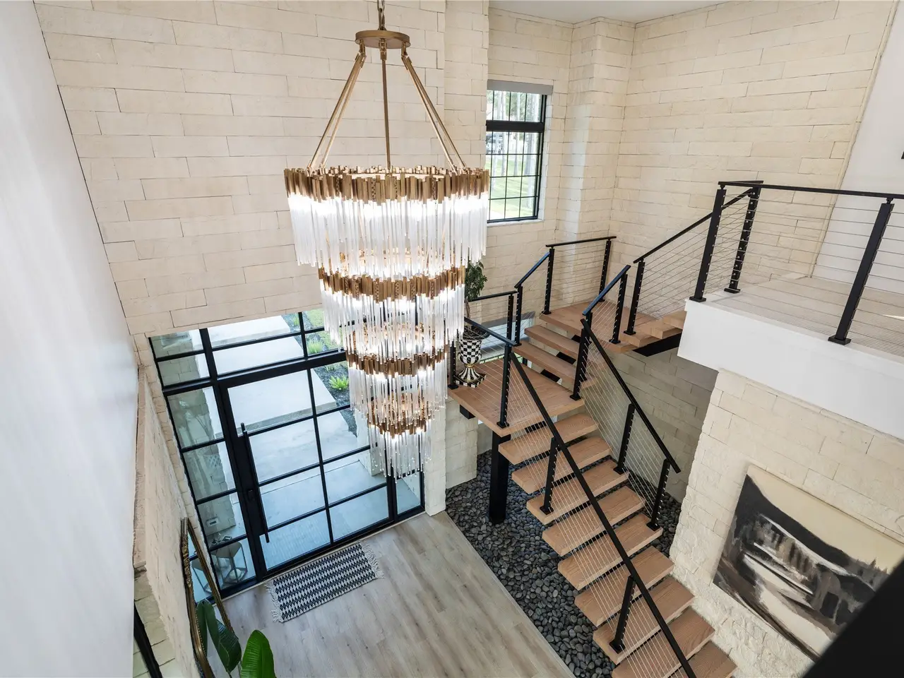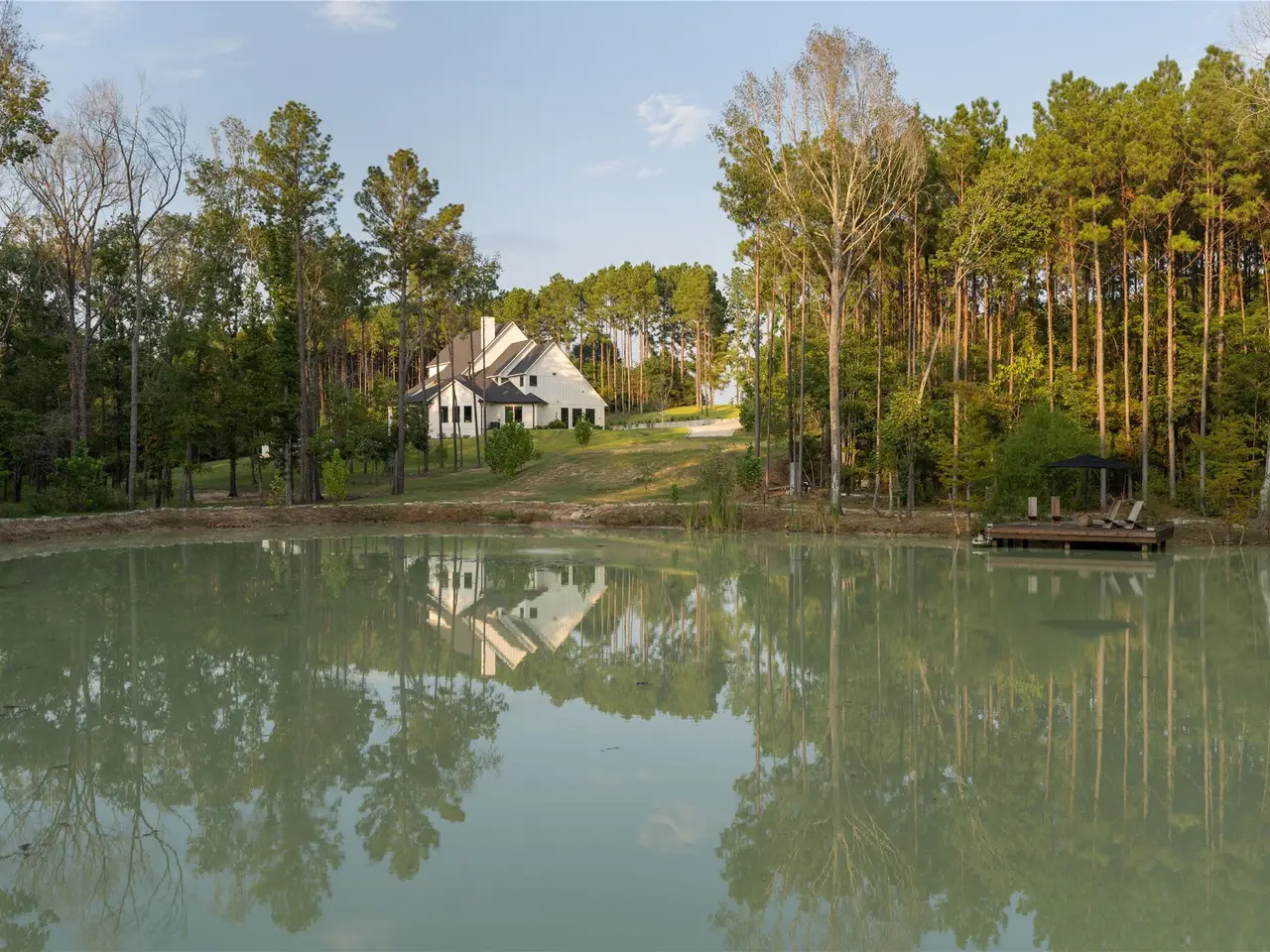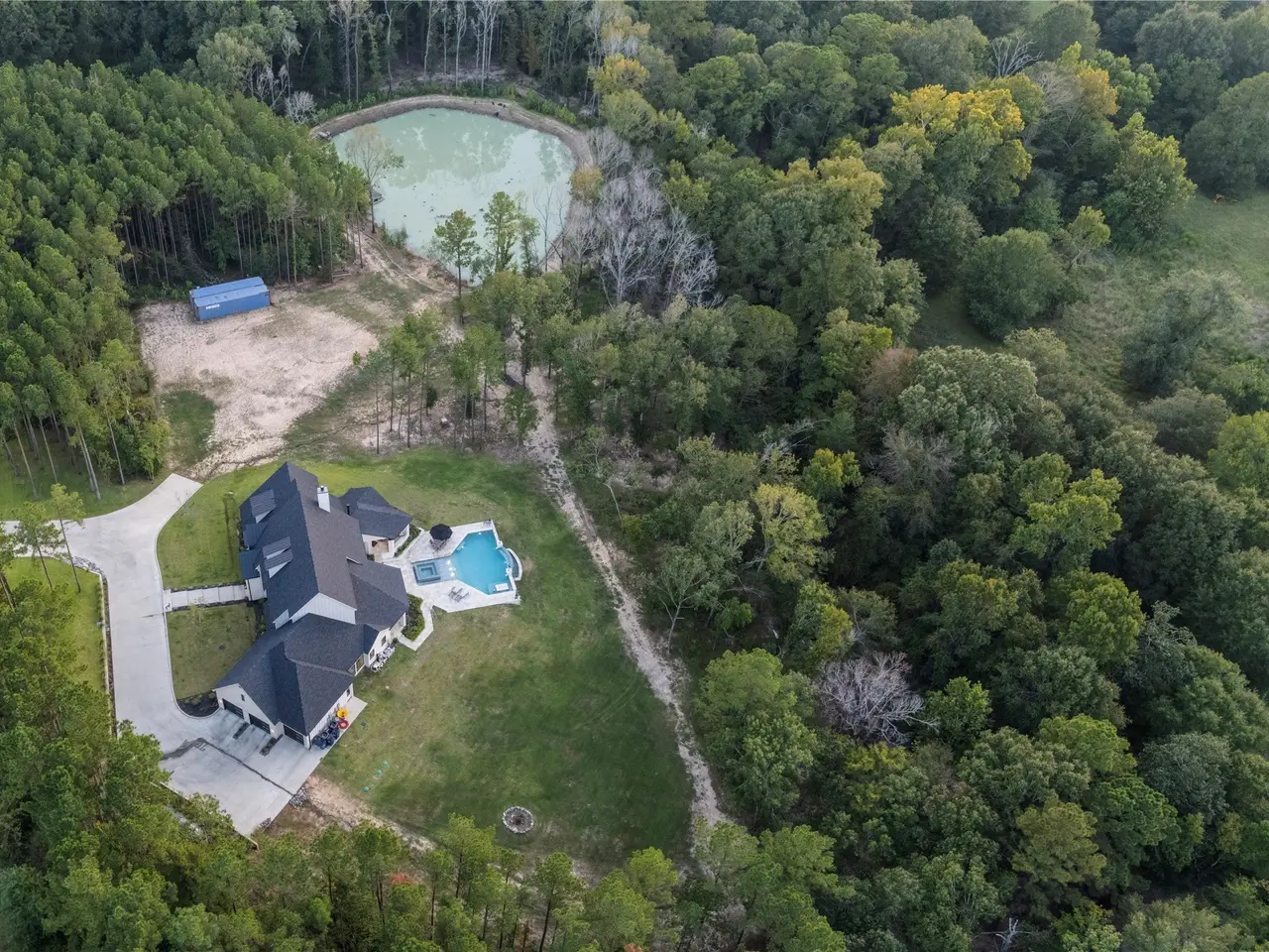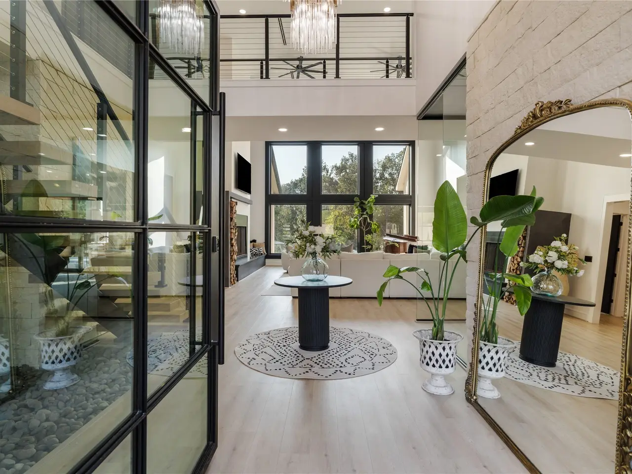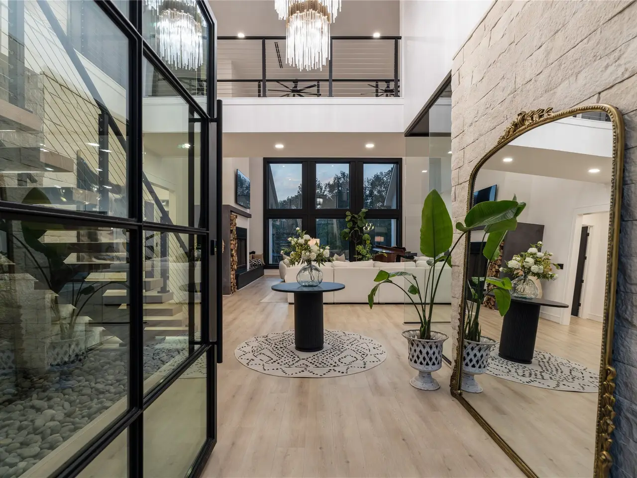 Step into a world of refined luxury, natural beauty, and architectural brilliance on 6.2 private, wooded acres. This custom estate welcomes you with an 11-ft glass pivot door, a dramatic chandelier, and soaring 26-ft ceilings. Floor-to-ceiling windows blur the line between indoors and out, offering breathtaking treetop views. The chef’s kitchen is a masterpiece—quartz countertops, Café commercial appliances, and a full butler’s pantry with ice maker and beverage fridge. The primary suite is your personal sanctuary, featuring a fireplace, a private wellness center, and disappearing glass doors that open to an infinity-edge pool. A sleek glass-partitioned office balances modern design with serenity. Enjoy a stocked pond, media room, two utility rooms, smart home technology, and a lighted custom staircase. Gas appliances, two private wells, and a whole-home water filtration system complete this extraordinary retreat. Every detail speaks luxury. Every moment feels like escape.