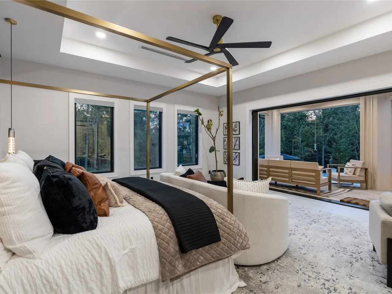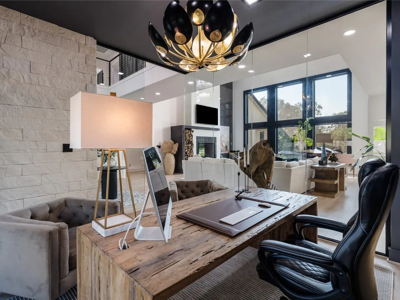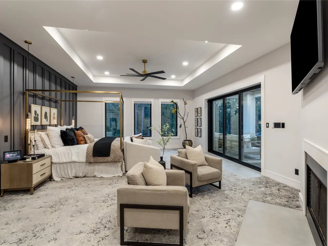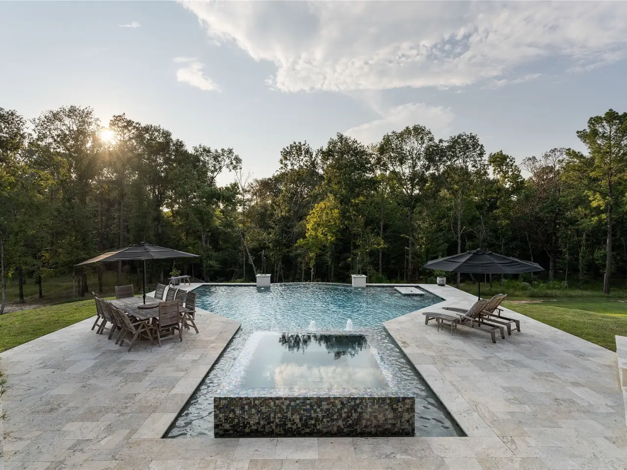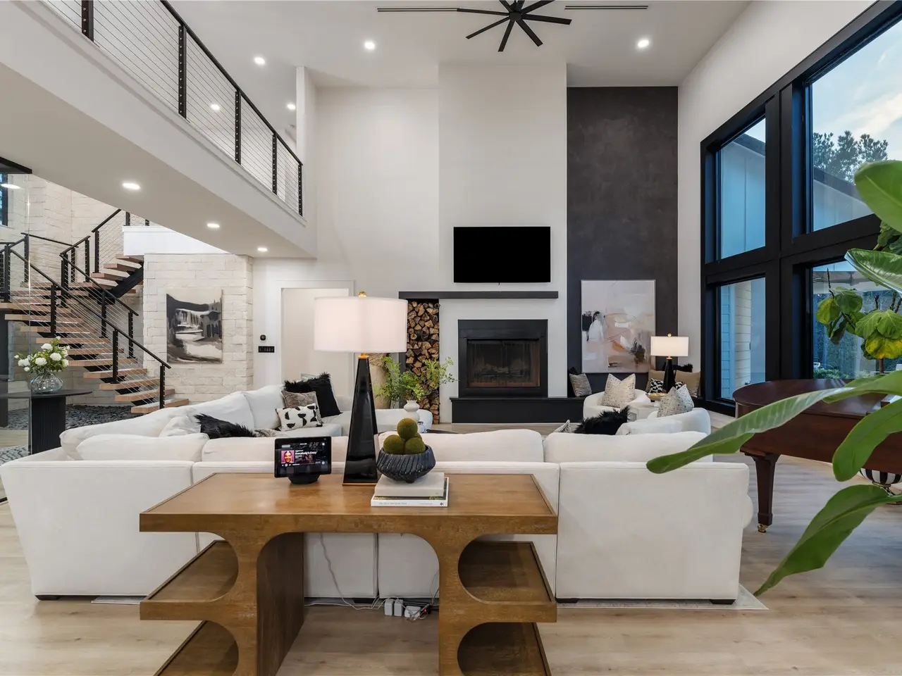 Step into a world of refined luxury, natural beauty, and architectural brilliance on 6.2 private, wooded acres. This custom estate welcomes you with an 11-ft glass pivot door, a dramatic chandelier, and soaring 26-ft ceilings. Floor-to-ceiling windows blur the line between indoors and out, offering breathtaking treetop views. The chef’s kitchen is a masterpiece—quartz countertops, Café commercial appliances, and a full butler’s pantry with ice maker and beverage fridge. The primary suite is your personal sanctuary, featuring a fireplace, a private wellness center, and disappearing glass doors that open to an infinity-edge pool. A sleek glass-partitioned office balances modern design with serenity. Enjoy a stocked pond, media room, two utility rooms, smart home technology, and a lighted custom staircase. Gas appliances, two private wells, and a whole-home water filtration system complete this extraordinary retreat. Every detail speaks luxury. Every moment feels like escape.