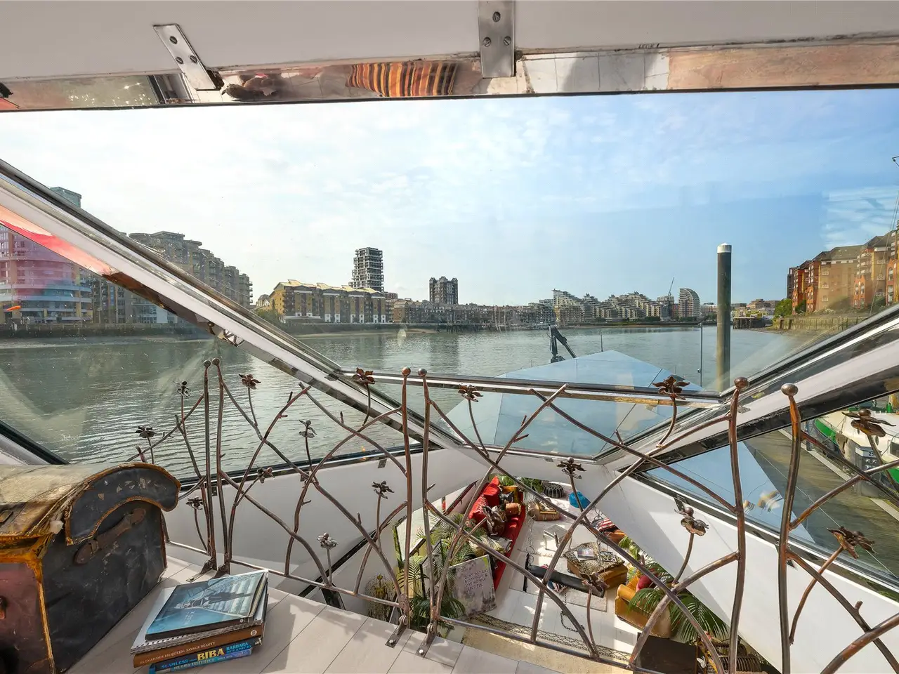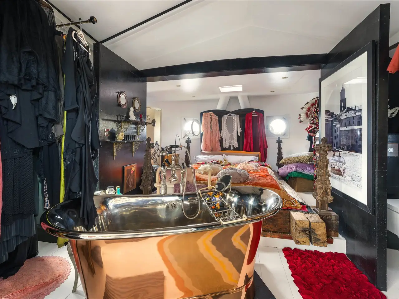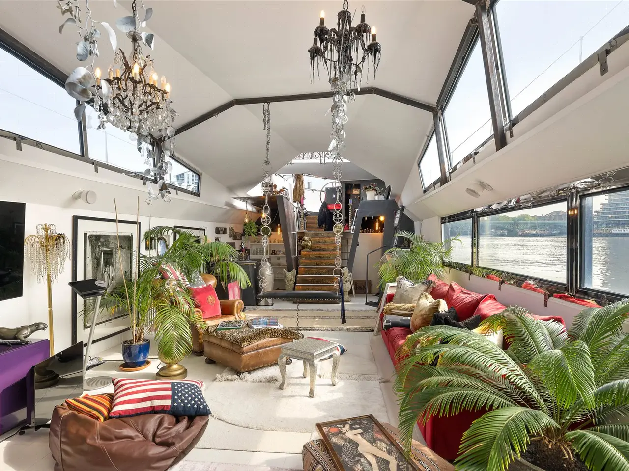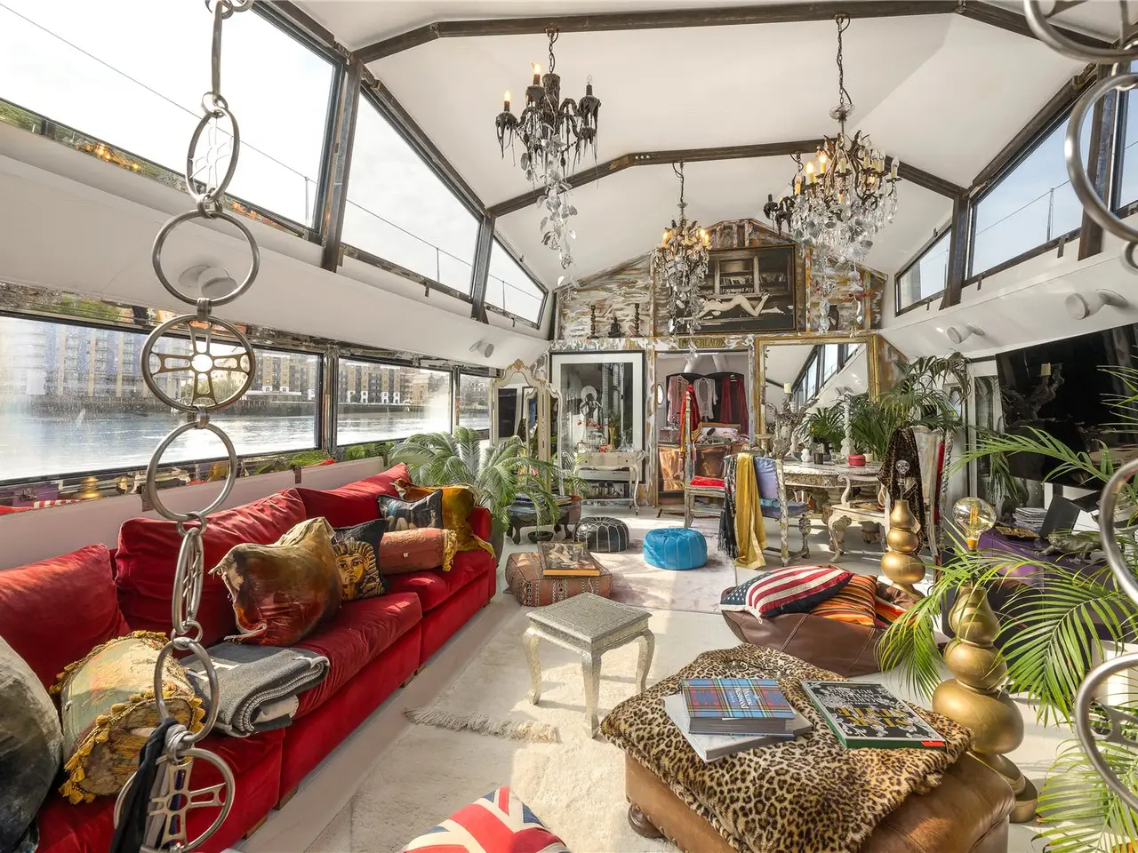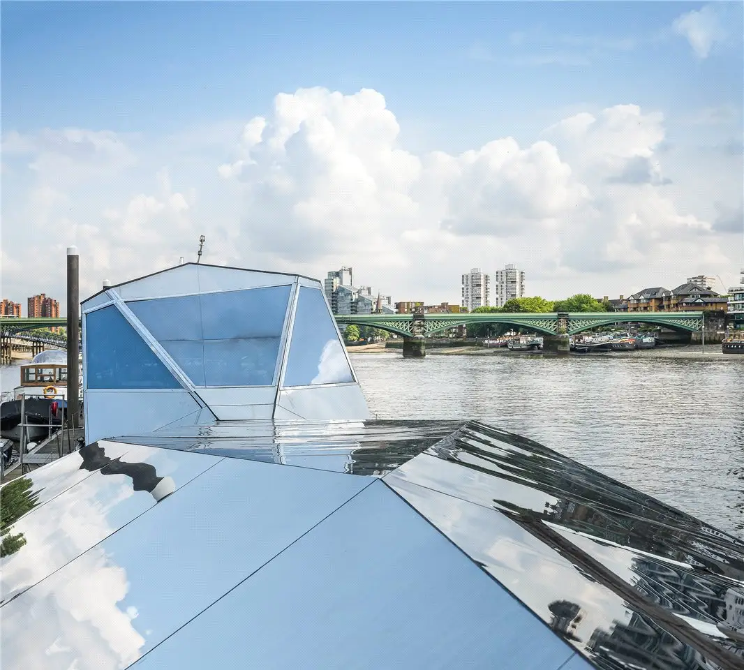 A pioneering 25 metre freehold houseboat; sculpted by artist Cyril de Commargue with its striking polyhedron mirrored exterior as his “Fluxland” project on a reimagined 1950's Dutch grain barge and now delivering sumptuous, light filled and bohemian interiors of 1,688 square feet / 156.9 square metres with ceilings up to 3.69 metres.