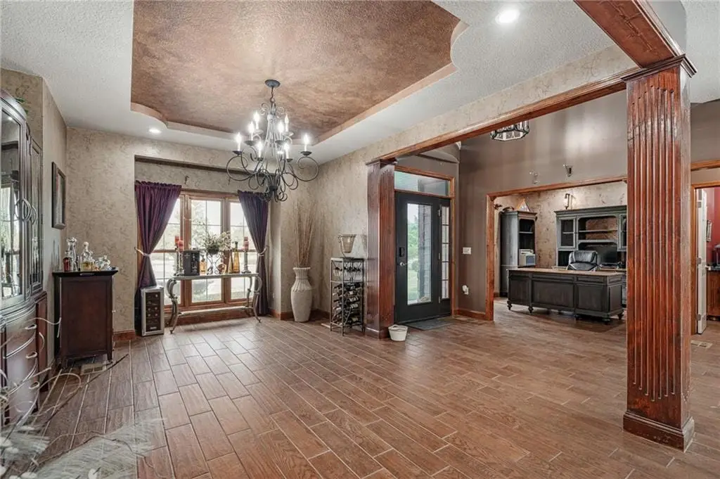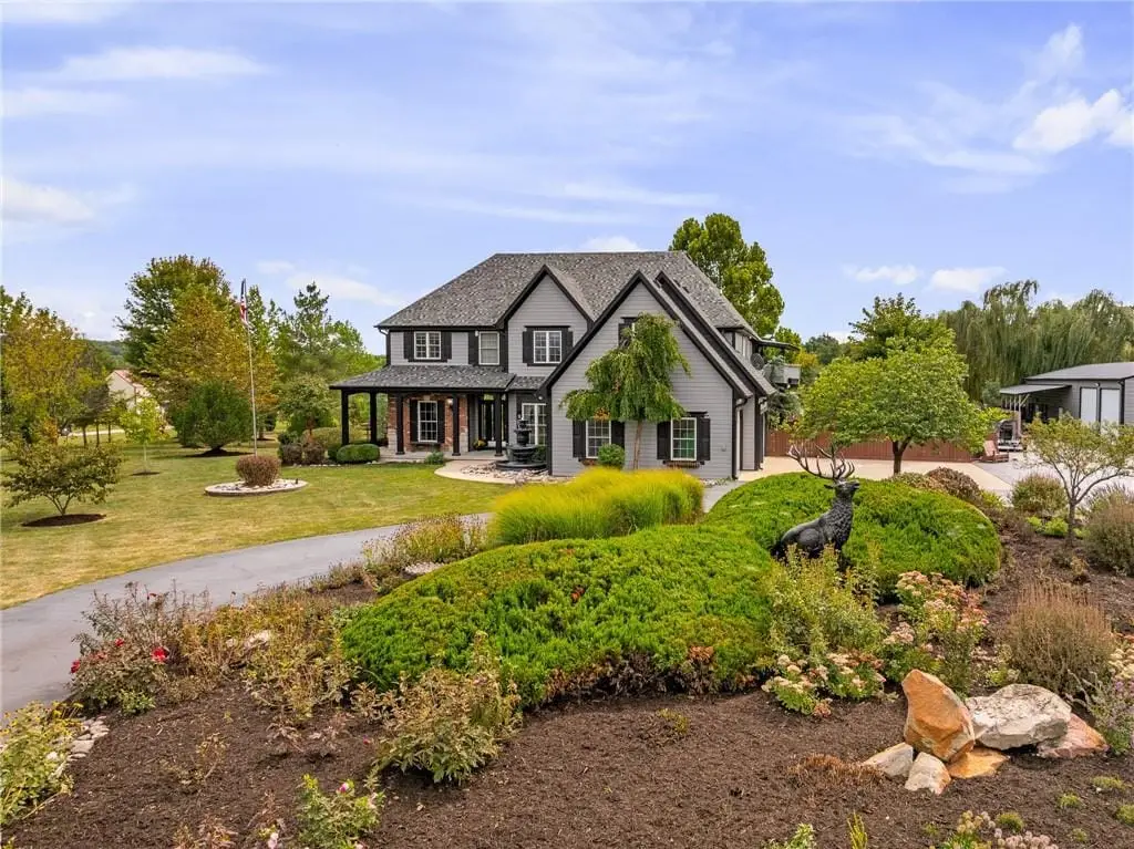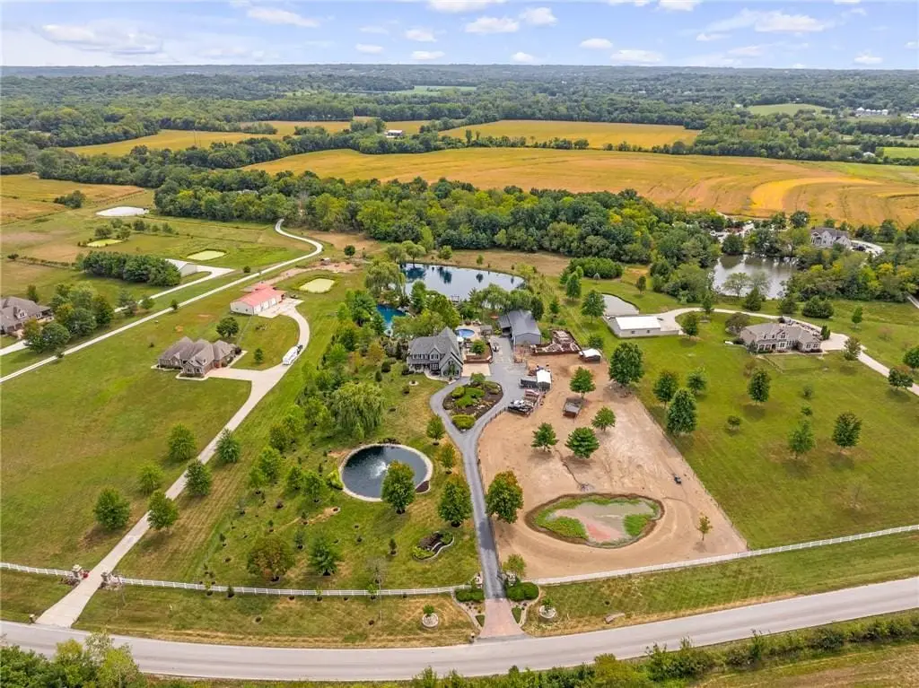Unmatched in character and amenities, this gated 5-acre Lone Jack property is designed for those who love to entertain, live outdoors, and need space for a home-based business. The grounds are extraordinary, with two large ponds - one offering a sandy beach, dock, playhouse with hurricane deck, and zip line, the other showcasing a dramatic 12-foot stone waterfall. Multiple weeping willows surround the water, creating a picturesque, park-like setting. Outdoor living is unbelievable with a swimming pool, outdoor shower, festive poolside bar, basketball court, striped parking for nine cars, multiple firepits, fountains, and extensive landscaping and unique trees. A huge raised-bed garden with drip irrigation and automatic watering, vintage 1950s merry-go-round, playground and pergola framed with wisteria over the water complete the retreat. The 2006-built two-story home offers quality and comfort with hard surface flooring throughout the main level, five fireplaces, formal dining, office, and a hearth room/kitchen with island seating for five, Viking six-burner cooktop. French doors open to a fenced dog yard with pergola and hibachi grill. Upstairs, four bedrooms each enjoy private baths; the oversized primary suite boasts a fireplace, sitting area, private covered balcony with mini split, and a massive walk-in closet. The walkout lower level is built for gathering, with a theater, arcade, full bar, non-conforming fifth bedroom, full bath, and access to a saloon-style patio with hot tub and firepit. Complete set up for livestock and farm animals with fenced pen, multiple shelters and duck pond. The property also includes a new outbuilding with concrete floor, two large overhead doors, built-in compressor, and plumbing for living quarters - ideal for equipment storage, hobbies, or running a business. Meticulously maintained and set on blacktop, this one-of-a-kind estate combines resort-style living with everyday functionality - an entertainer’s paradise inside and out.