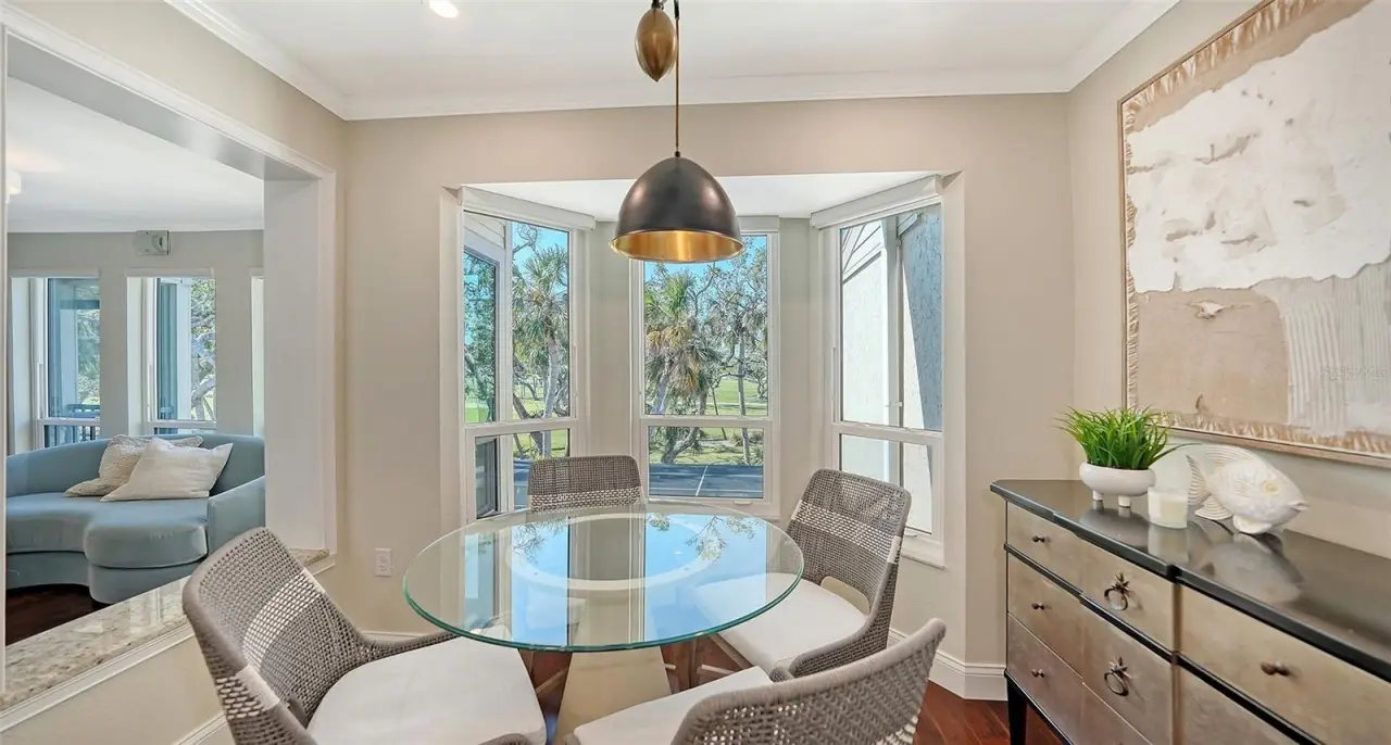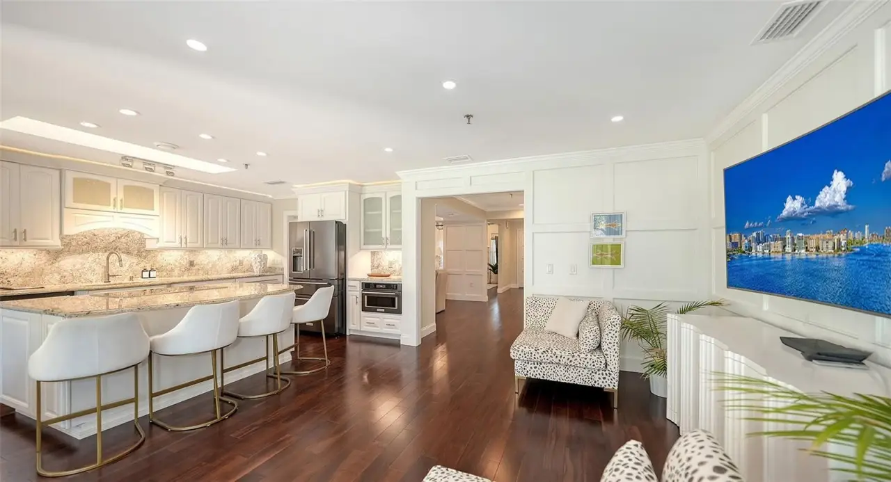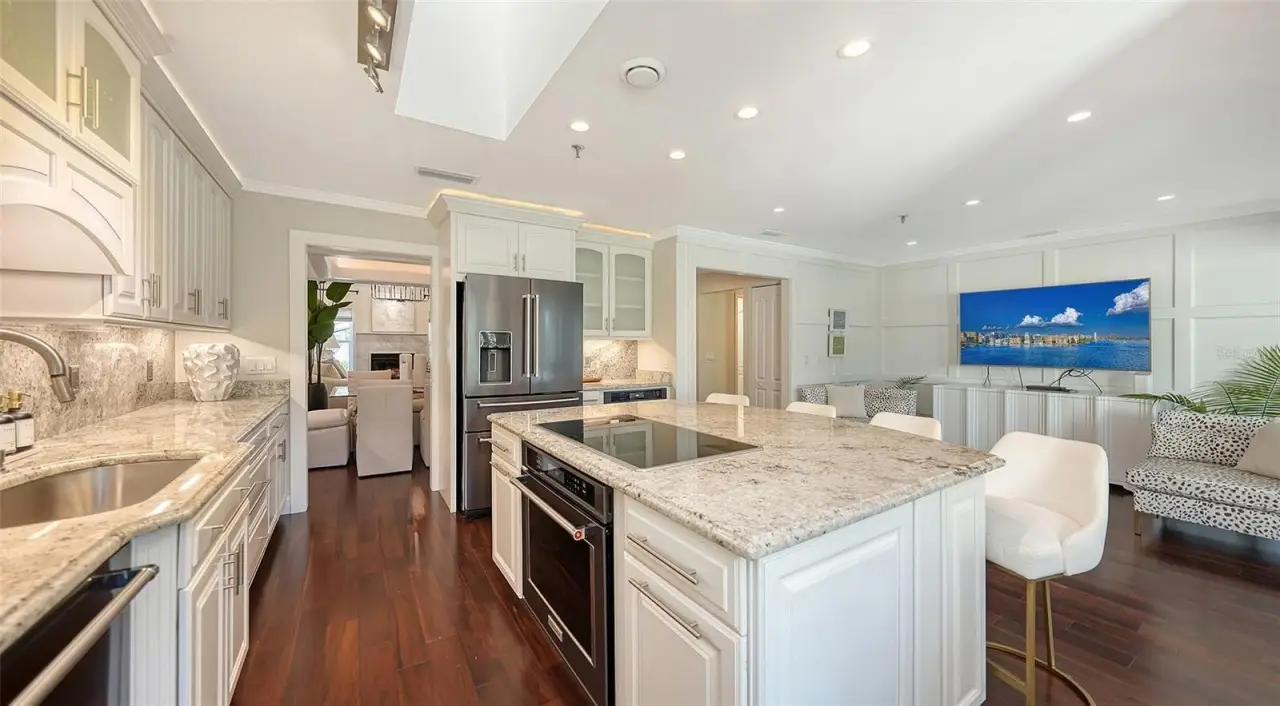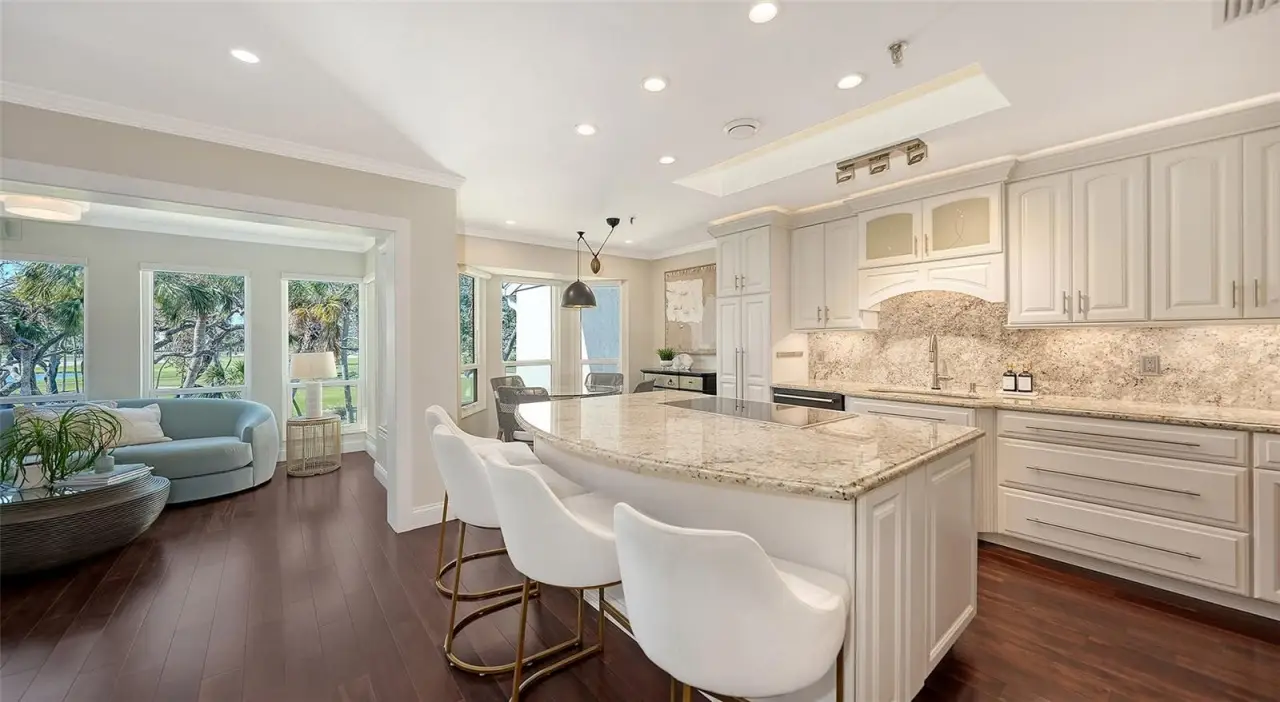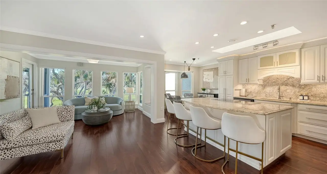 Discover this exquisitely renovated, fully furnished 3-bedroom, 2-bath home in the friendly 'Harbour Oaks' section of the prestigious Bay Isles community on Longboat Key. With just under 2,000 square feet of living space, this residence perfectly combines luxury, comfort, and convenience. This home has been meticulously designed with high-end finishes by an interior designer, offering a sophisticated aesthetic throughout, featuring custom wood paneling, recessed lighting, engineered wood floors, Stark wool carpet in the primary bedroom, and custom draperies. The 2020 upgraded kitchen features premium stainless-steel appliances and an induction range. Additional thoughtful design elements include cove lighting in the dining room and a wood-burning fireplace with custom Carrera Marble surround. The lanai with a motorized no-see-um bug screen overlooks the Longboat Key Club Harbourside Golf Course, providing breathtaking and comfortable sunset views framed by beautiful trees and lush greenery. For safety, durability and financial peace of mind, this gorgeous second floor residence features recently upgraded high-impact sliders and windows, plus community-wide new roofing and siding. Located in the gated Bay Isles community with 24/7 security, this home is within walking or biking distance to the private and newly renovated Bay Isles Beach Club, the Longboat Key Club Moorings Marina and Portofino restaurant, the Longboat Key Club Pickleball and Tennis Courts, Publix, CVS, as well as to the new Longboat Key St. Regis, which offers exceptional dining options and the vibrant St. Regis Monkey Bar, now open to the public. This remarkable turn-key property with a beautiful community pool and spa offers a rare opportunity to embrace the unparalleled Longboat Key lifestyle. Don't miss the chance to make it your own.