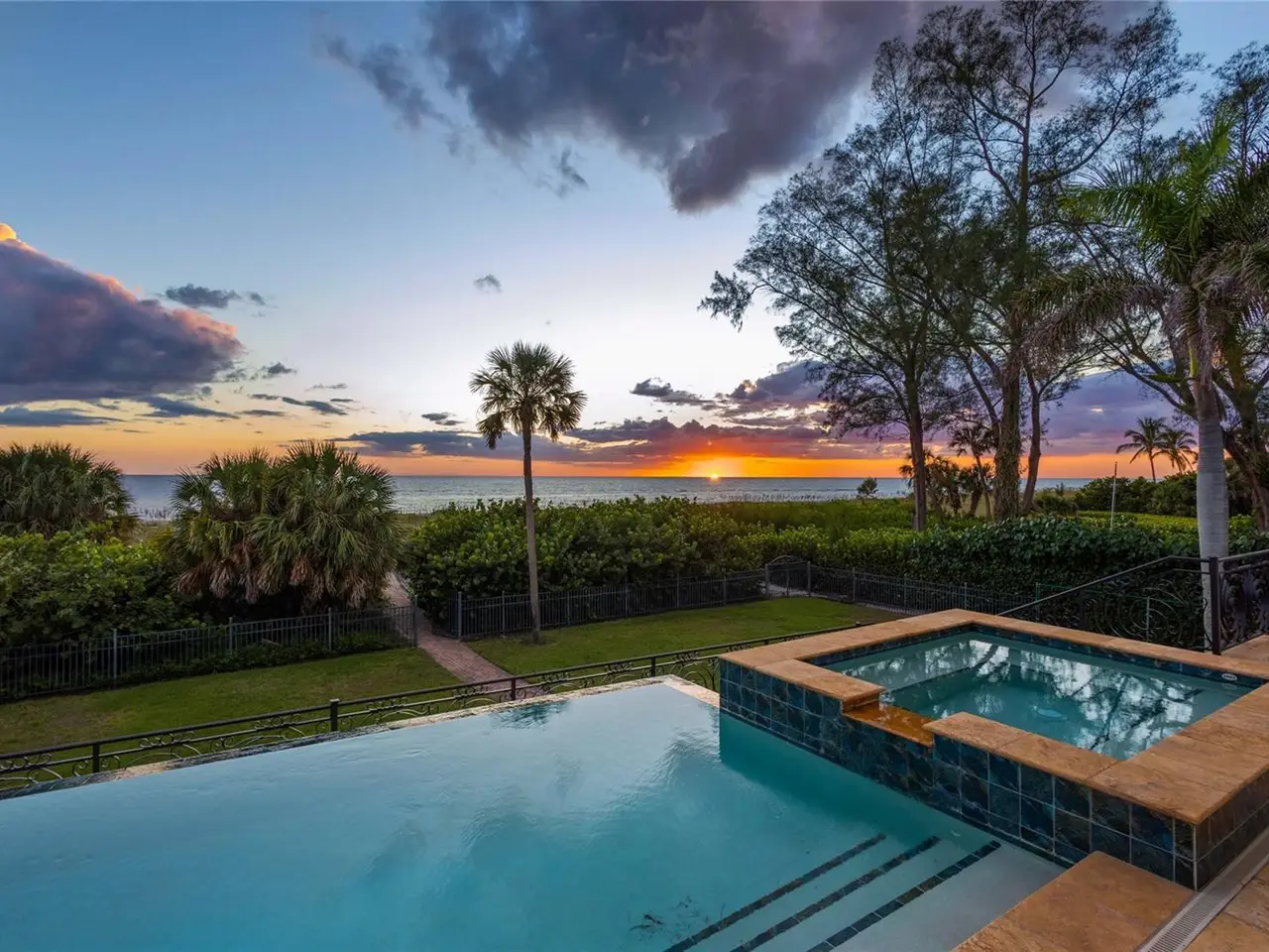 Experience the ultimate in beachfront living with this extraordinary 1.6-acre estate on Longboat Key, offering a rare 156 feet of direct frontage along the Gulf of Mexico. Embrace breathtaking water views and spectacular sunsets from every room and multiple balconies. The grand living room features soaring cathedral ceilings and dramatic walls of glass that frame the elevated pool deck with an infinity-edge pool, spa, and endless Gulf views beyond. A private, gated entrance and stately drive lead to a dual staircase entry, setting a tone of sophistication upon arrival. Inside, neutral finishes throughout the approximately 5,600 square feet of living space provide an easy canvas for personalization. Recent upgrades, including a fully modernized electrical system with enhanced lighting, a new HVAC system, an updated dining room, freshly painted interiors and exterior railings, refinished balconies, high-efficiency washers and dryers, and a state-of-the-art entertainment system ensure the home is up-to-date in both style and technology. Garage space under the home can accommodate up to nine vehicles. This solidly built concrete block home did not sustain any damage from recent storms. Don't miss this opportunity to own this exceptional beachfront retreat, offering breathtaking views, serene privacy, and refined luxury. The canal side property with boat lifts and dock directly across the street is also for sale offering the opportunity to own both properties beachside to bayside.
