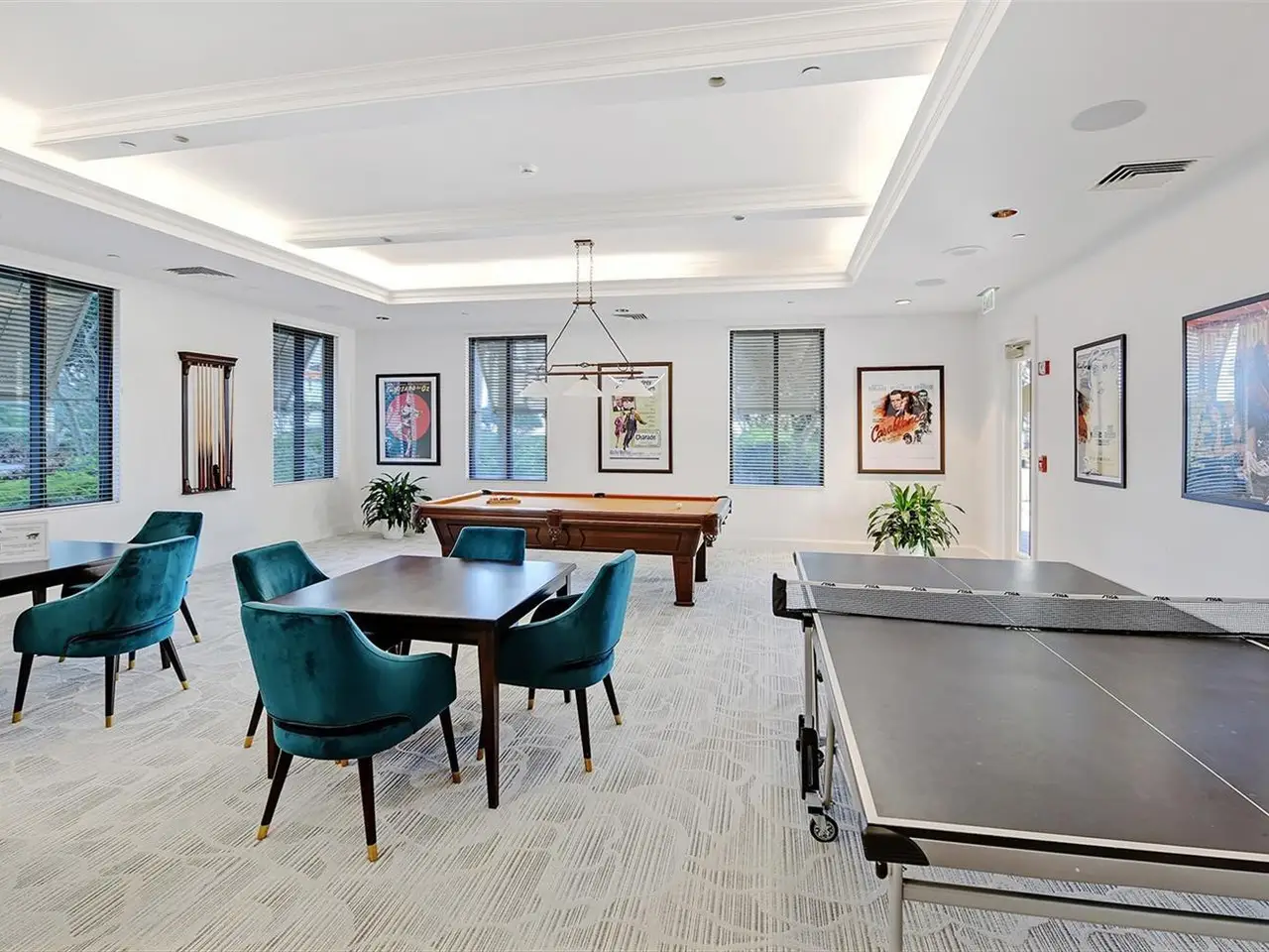 A library, billiards room, and firepit