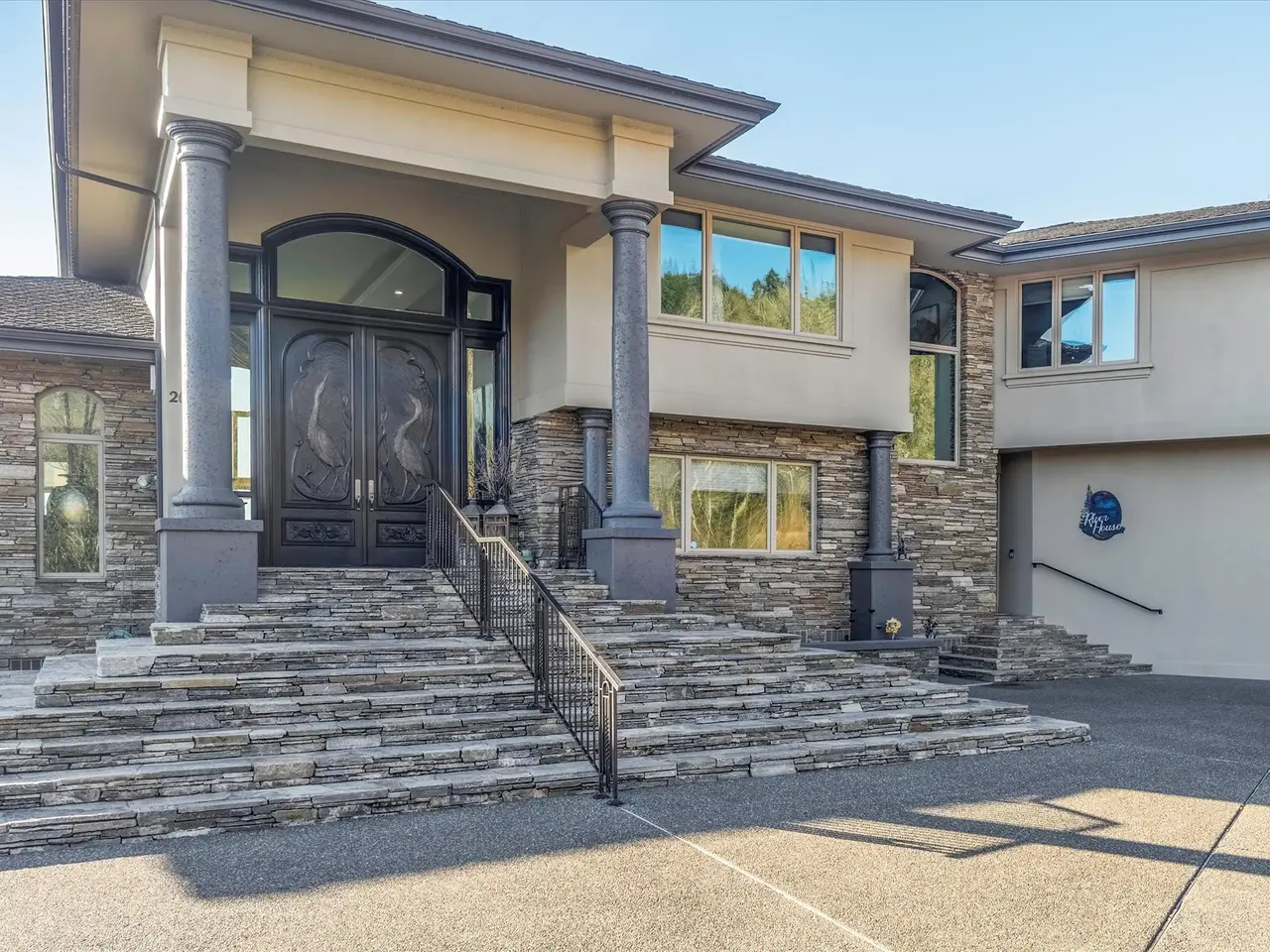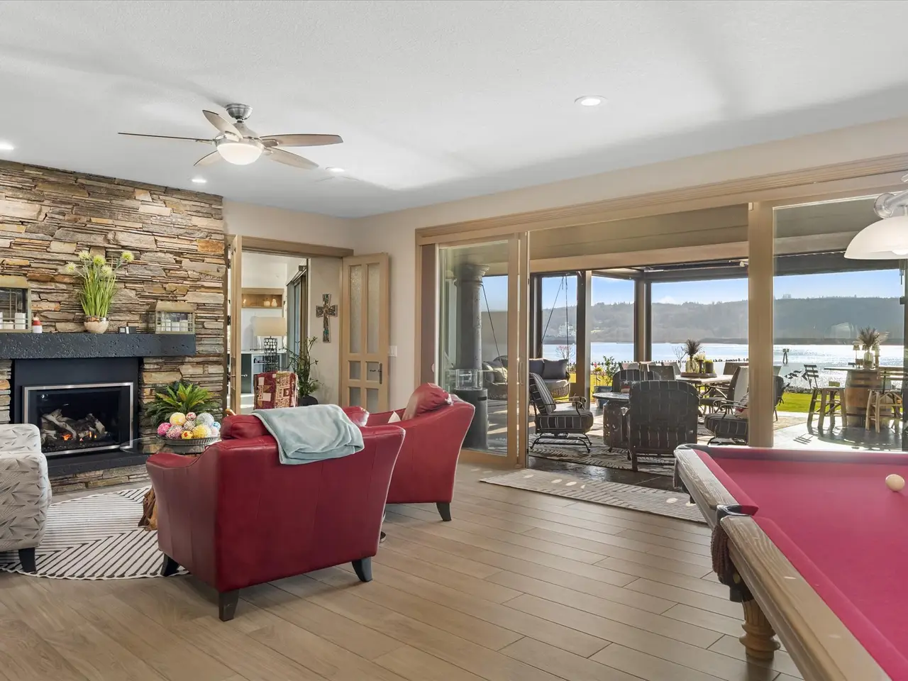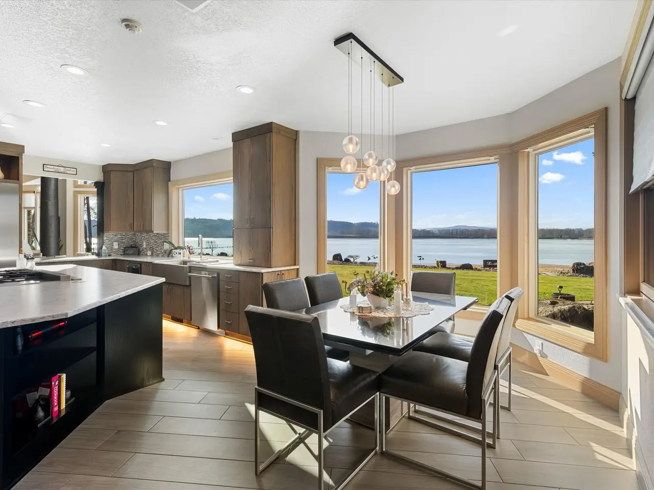 Stunning waterfront estate offers an unparalleled lifestyle, with 16 acres of privacy surrounded by water on three sides. Over 1,000 feet of sandy Columbia River beach and breathtaking views from nearly every room in the 7,280 sq ft home. Picturesque boardwalk leads to the 80-ft long boat dock, ideal for water adventures. Completely remodeled open kitchen is a chef’s dream with 3 ovens, quartz counters, and so much more. River front gazebo is perfect for hosting large gatherings with a full kitchen and the option to enclose-complete with playground, gas fire pit and more. 4 bedrooms, office, 2 versatile flex rooms and 5 bathrooms. Primary suite is an oasis of comfort you'll never want to leave. Garage parking for at least 10 cars and an RV.