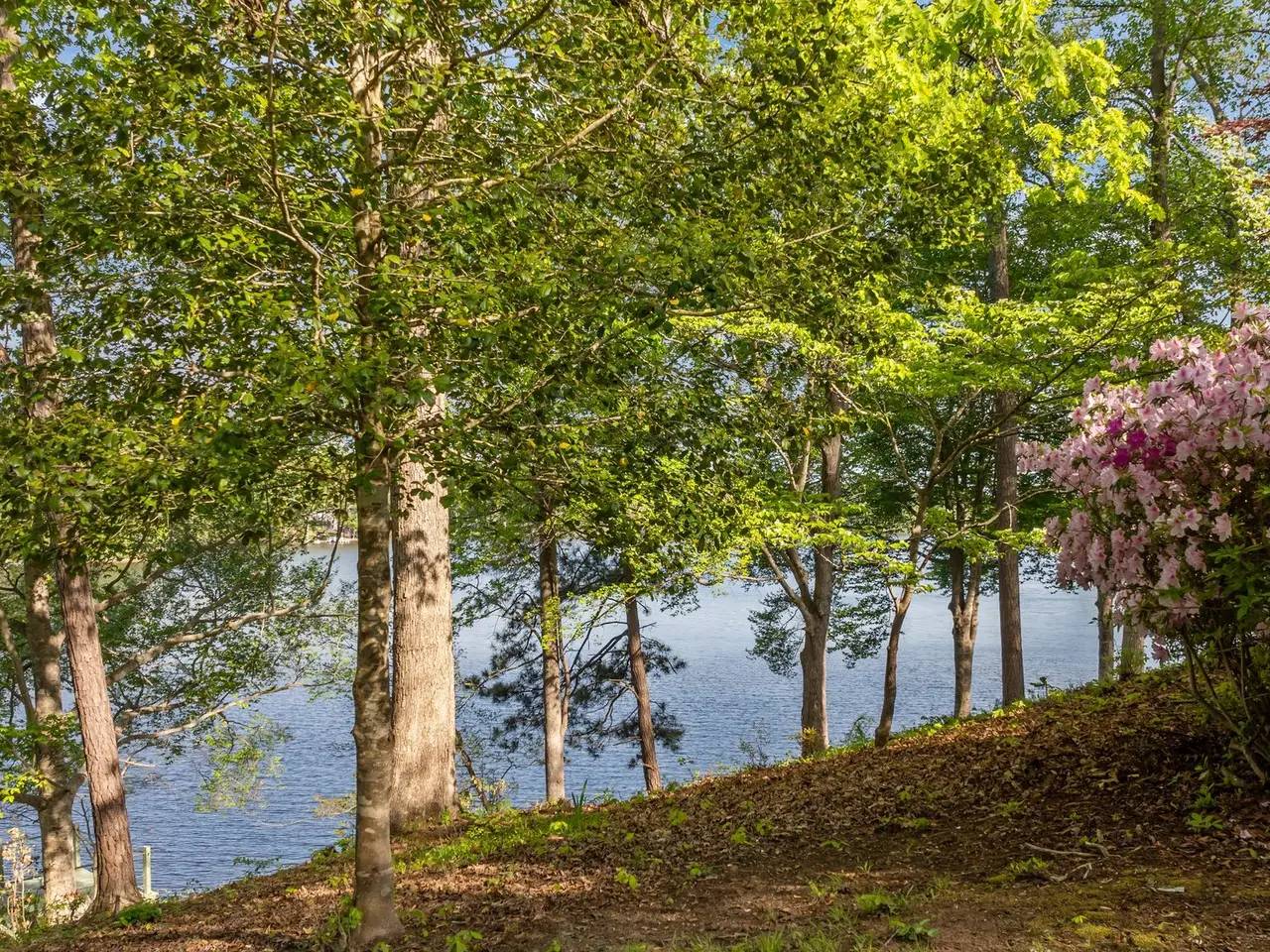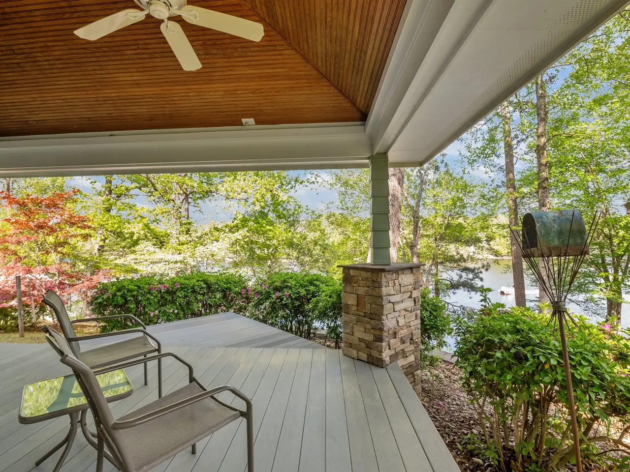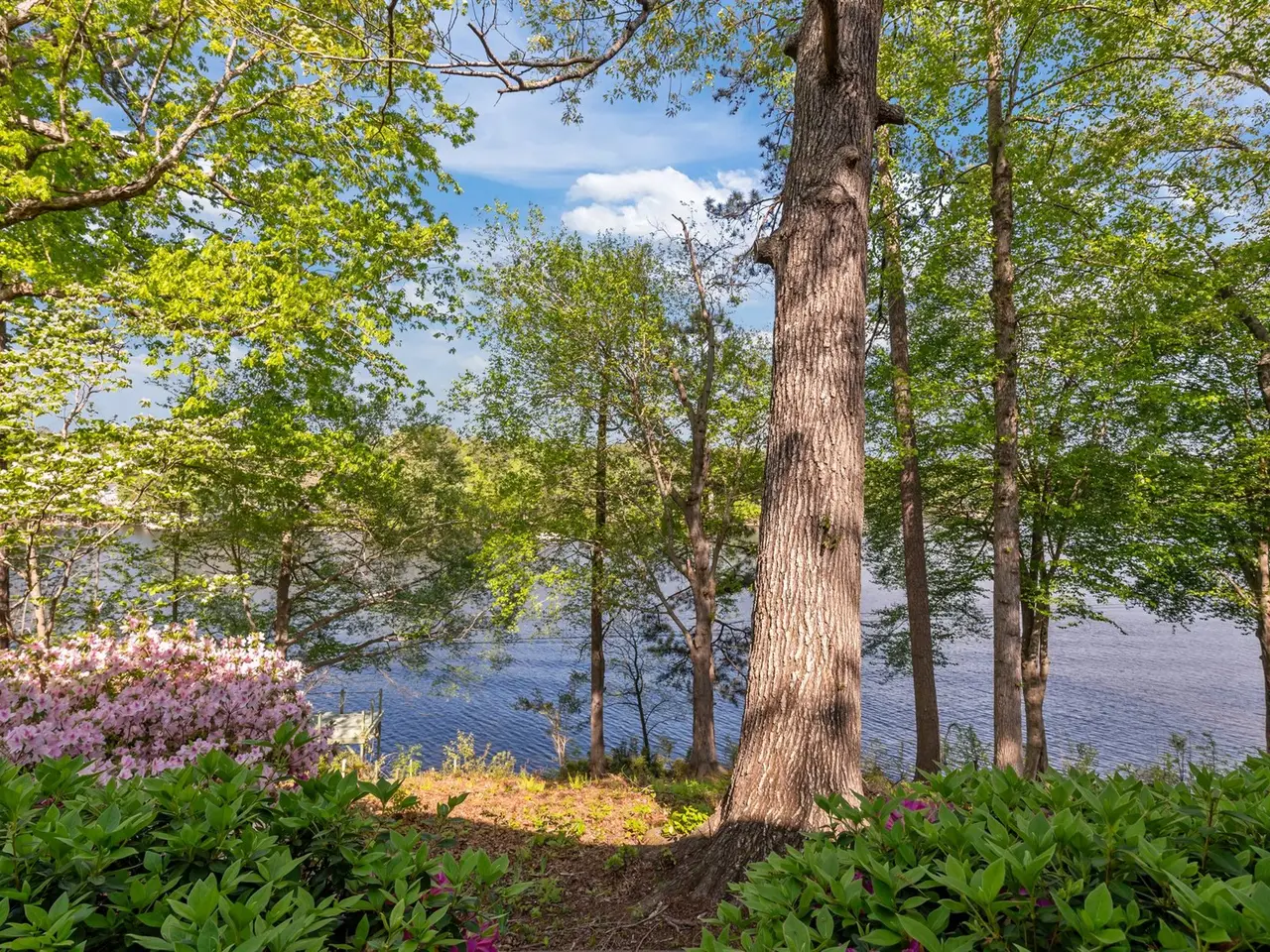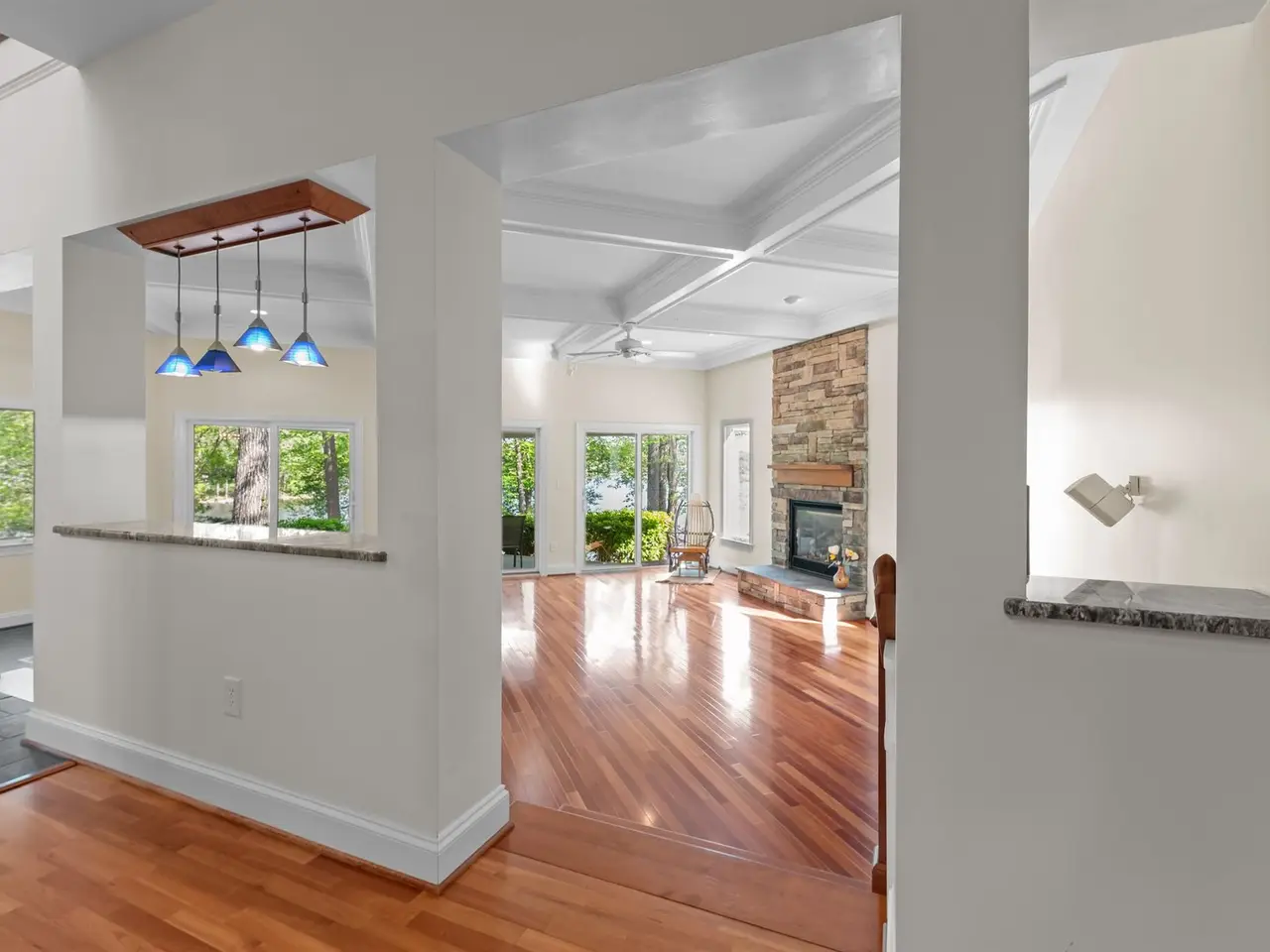 Waterfront living at its finest with this gorgeous 4-bedroom, 3-bathroom home situated on a beautifully landscaped expansive 1-acre lot! Enjoy panoramic lake views from so many rooms, just incredible! The grand living room features a stacked stone fireplace, and a breakfast area, complete with coffered ceilings, Anderson windows, and custom millwork galore. The spacious layout includes two main floor Bedrooms, one with an ensuite full Bathroom, a formal Dining room, a Home Office, as well a large Laundry room with ample storage cabinets. Upstairs you'll find two additional Bedrooms offering room for everyone. Outdoors, the property is a gardener's dream, with vibrant landscaping and serene lakefront vistas. The detached 1100 square foot Workshop with multiple rooms, two mini-split HVAC systems, and an additional third-car garage bay offers incredible space for billiards, hobbies, a playroom, and plenty of areas for storage.Additional highlights include a Brand-New Roof (2025) on both the Home and the detached 1100 square foot Workshop. All of this and it's in close proximity to the community entrance. Located in a gated community with top-tier amenities like boating, fishing, beaches, pickleball, and access to The River Golf Club just minutes away. Each residence also includes two free golf memberships!