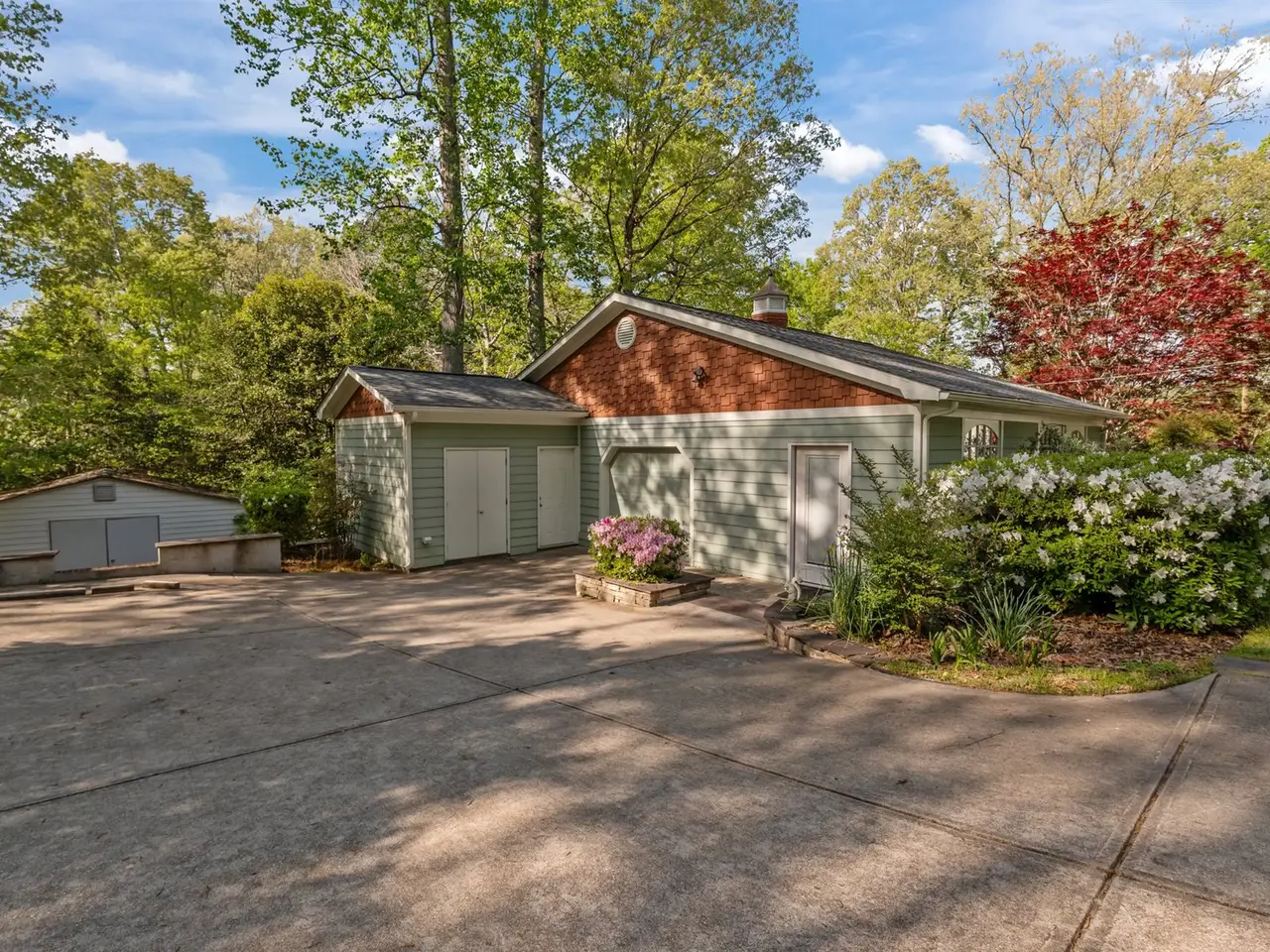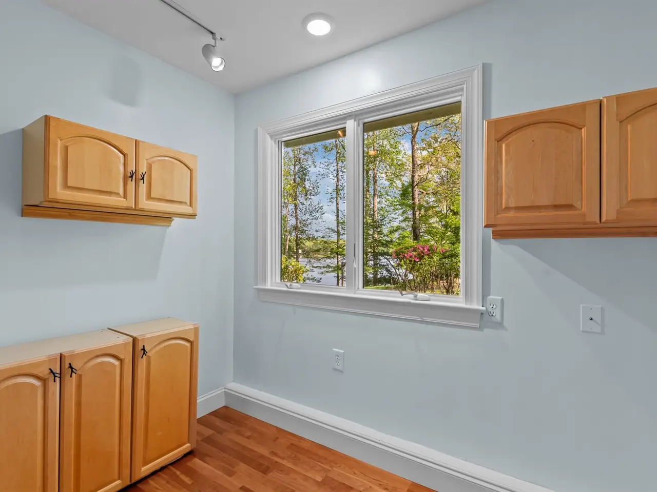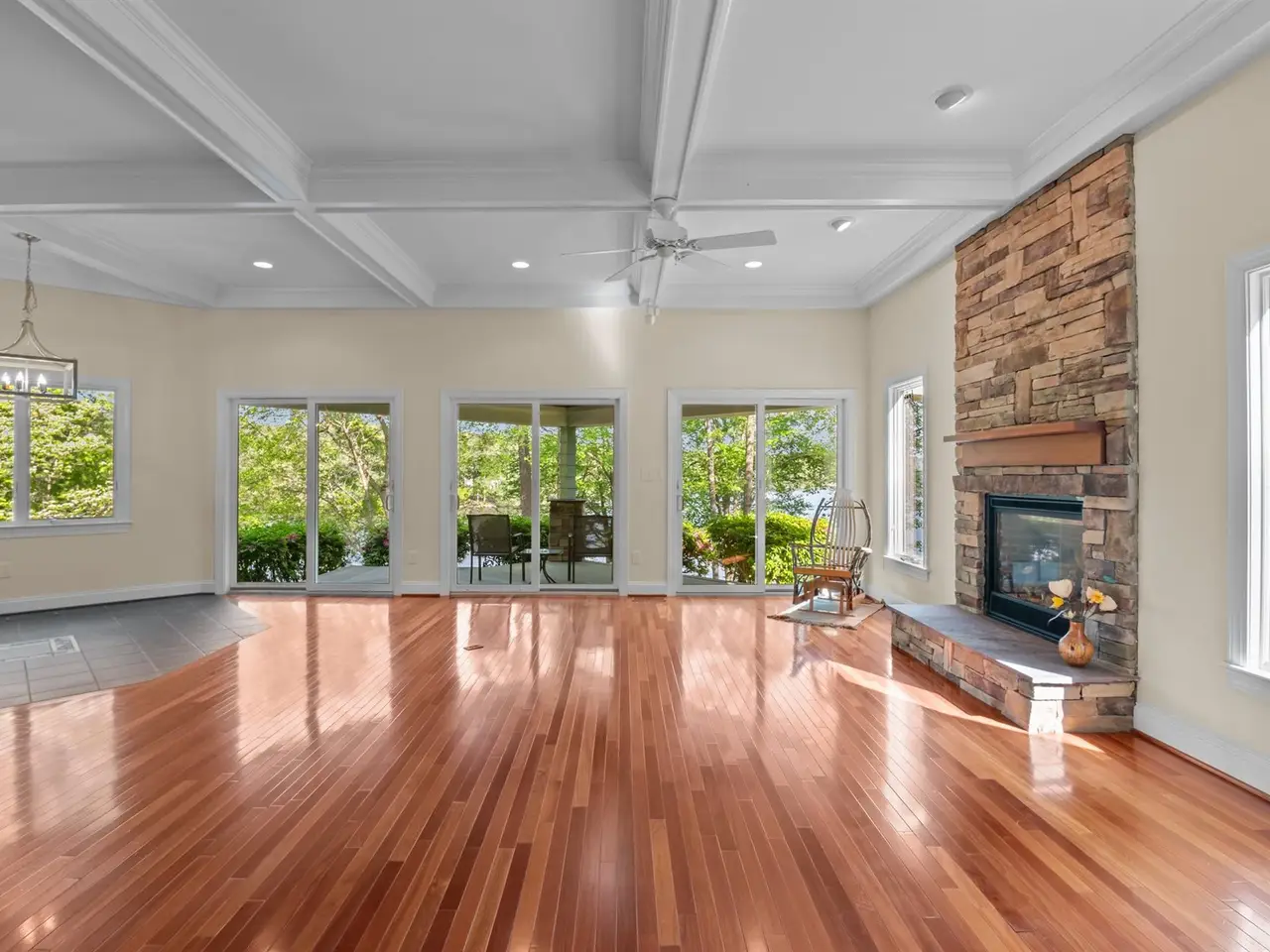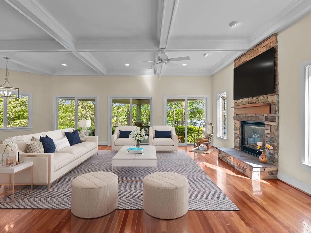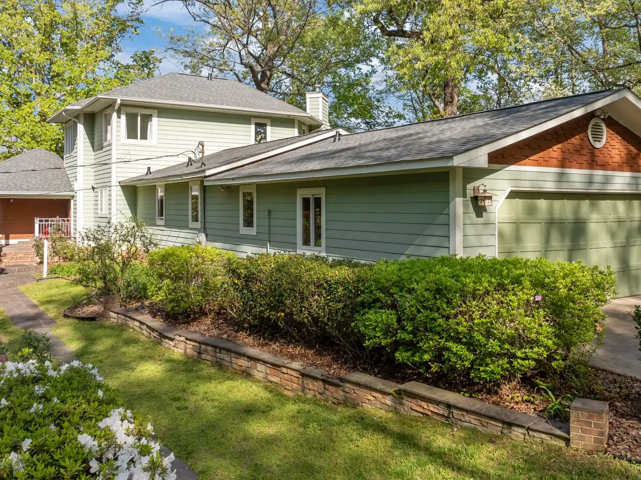 Waterfront living at its finest with this gorgeous 4-bedroom, 3-bathroom home situated on a beautifully landscaped expansive 1-acre lot! Enjoy panoramic lake views from so many rooms, just incredible! The grand living room features a stacked stone fireplace, and a breakfast area, complete with coffered ceilings, Anderson windows, and custom millwork galore. The spacious layout includes two main floor Bedrooms, one with an ensuite full Bathroom, a formal Dining room, a Home Office, as well a large Laundry room with ample storage cabinets. Upstairs you'll find two additional Bedrooms offering room for everyone. Outdoors, the property is a gardener's dream, with vibrant landscaping and serene lakefront vistas. The detached 1100 square foot Workshop with multiple rooms, two mini-split HVAC systems, and an additional third-car garage bay offers incredible space for billiards, hobbies, a playroom, and plenty of areas for storage.Additional highlights include a Brand-New Roof (2025) on both the Home and the detached 1100 square foot Workshop. All of this and it's in close proximity to the community entrance. Located in a gated community with top-tier amenities like boating, fishing, beaches, pickleball, and access to The River Golf Club just minutes away. Each residence also includes two free golf memberships!