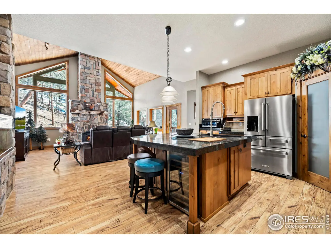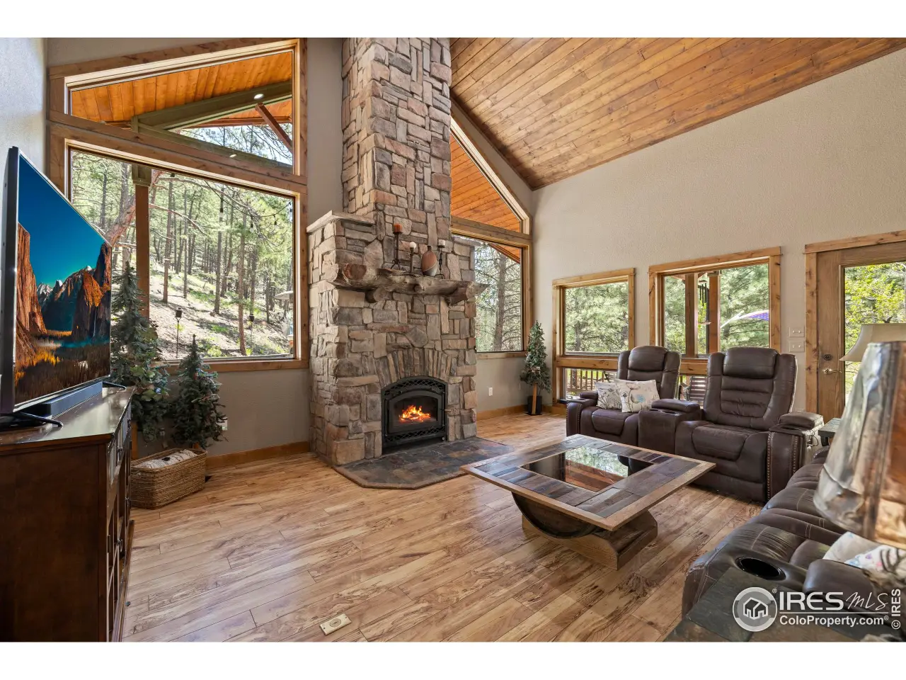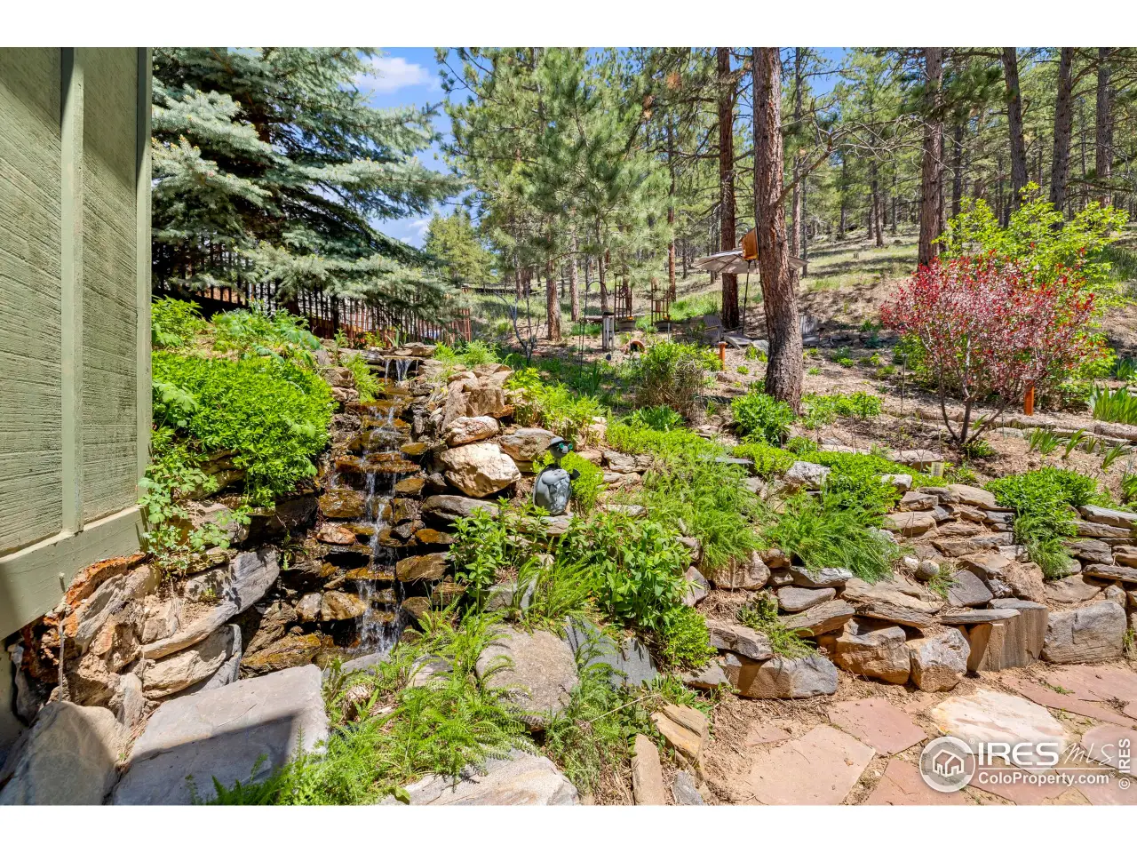 Remarkable custom-built residence nestled on almost 38 acres & within a 450-acre private wildlife conservation easement, offering an extraordinary blend of luxury & natural beauty. The heart of this home features a stunning 2-story great room with a wood stove, adorned with tongue and groove ceiling, creating an impressive architectural statement. The gourmet kitchen showcases high-end appliances & opens to the great room filled with abundant natural light streaming through large windows bringing the forest right into the living room. The spacious primary bedroom suite provides a private balcony retreat, complemented by a luxurious bathroom featuring a walk-in shower, 6-foot soaking tub & water feature. A versatile loft space off the primary bathroom serves perfectly as an office or additional living area. Outdoor living reaches new heights with a wraparound deck, complete with a step-in hot tub surrounded by a serene waterfall & koi pond. There is lovely outdoor space with a separate driveway that can easily accommodate a horse barn, while a charming bridge crosses a seasonal stream, adding to the property's enchanting atmosphere. Additional upgrades include: new boiler heating system, brand new carpet, some new interior paint, a 12 x 16 shed, custom closets, in-floor radiant heat, RV dump station, storage above the garage attic, & an almost 1200sf garage which could fit up to 4 vehicles & all your toys. The home's thoughtful design includes 3 bedrooms, 3 bathrooms, with the option to create a 4th bedroom in the upper floor loft/exercise room. Located near Ramsay-Shockey Open Space & just 20 minutes to the city of Loveland, this property presents possibilities for hosting weddings and events. With only a road association HOA, this sanctuary combines privacy with accessibility, offering a truly distinctive Colorado living experience. Property has been pre-inspected and is in top-notch shape! Recent hail storm in July 2025- Seller will replace roof prior to closing.