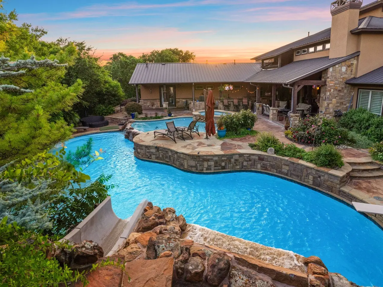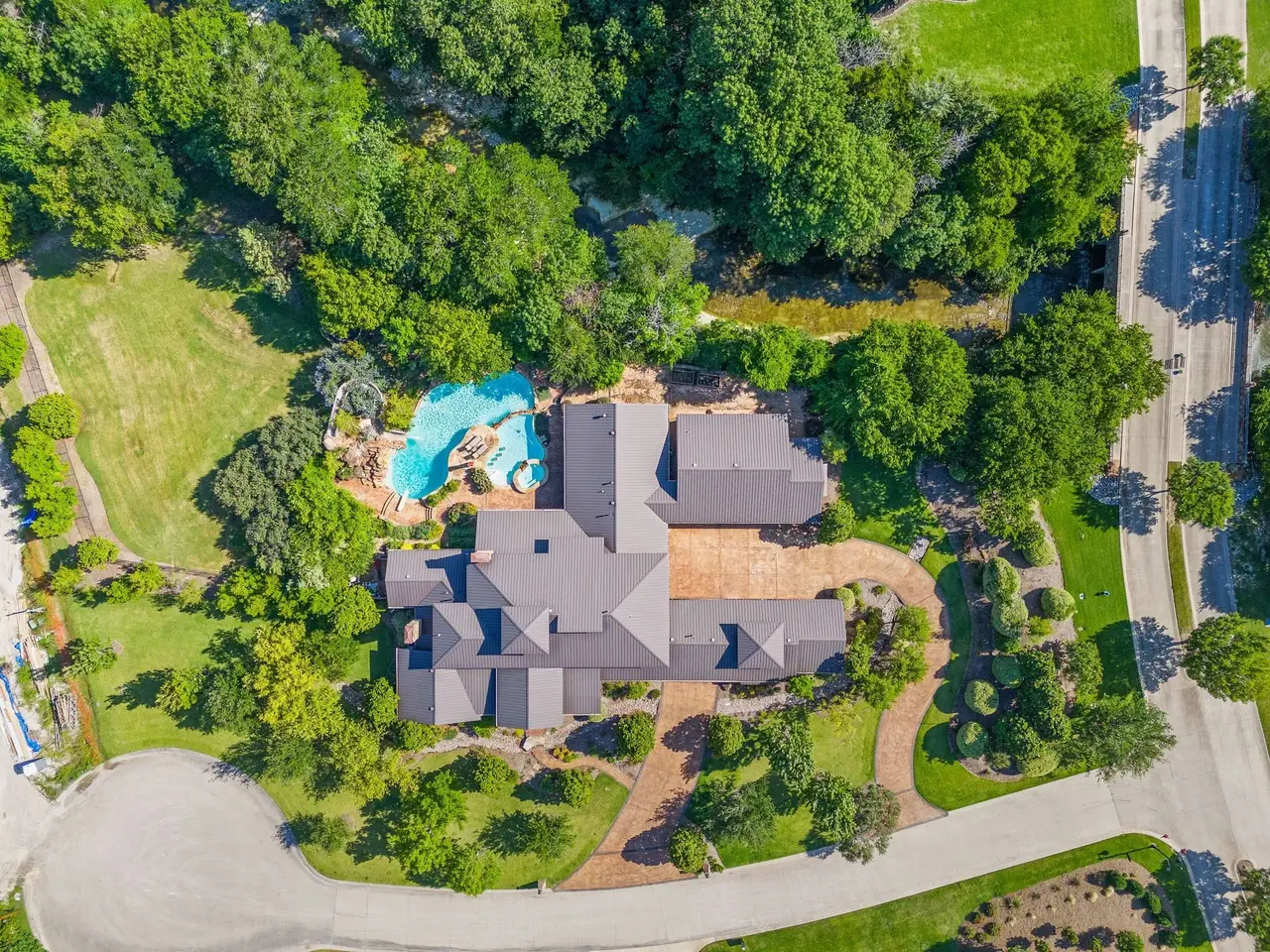 Experience this rare 2.19 acre creek lot and luxury home with rich southwestern and traditional character, a custom built estate by McCollum & Associates in the desirable Lucas, TX. The Creeks of Forest Grove is a gated community, offering extreme privacy and quietness, zone to the exemplary Love Joy ISD schools. Every detail of this high end home has been thoughtfully designed and meticulously crafted to offer both grandeur, warmth, and structural integrity. The heart of the home is the gourmet kitchen, boasting copper sinks, Wolf and Miele appliances, custom decorative panel cabinetry and more. Host unforgettable gatherings in the formal dining room, featuring a gorgeous chandelier, crown moulding, and oversized baseboards. Keep it casual in the oversized breakfast nook with arched stone details and a secondary stairwell, adding a touch of architectural charm. And don't miss your very own wine room underneath the stairs. The living room is an entertainer's dream with soaring ceilings, and a dramatic floor-to-ceiling stone fireplace. The bonus game room downstairs exudes a rustic aesthetic, complete with nailed down hand scraped hardwood flooring, a custom bar with ice maker, beer tap, and a third impressive stone fireplace. For movie nights and game days, the media room offers a built-in projector with screen and ambient sconces. Step outside to your private retreat, a resort-style backyard featuring a 90,000-gallon salt water pool with slide, three waterfall features, and hot tub. Make some core memories in the outdoor kitchen, unwind by the wood-burning fireplace under the covered patio, and enjoy sunsets framed by native Texas landscaping. There's more, with a 7 car garage, you'll never be short of space and storage, especially with it being 25 deep and oversized heights, plus the garage has its very own storage room that has AC. Don't miss out on unmatched craftsmanship, timeless design, and resort-style living in this one-of-a-kind North Texas luxury home.