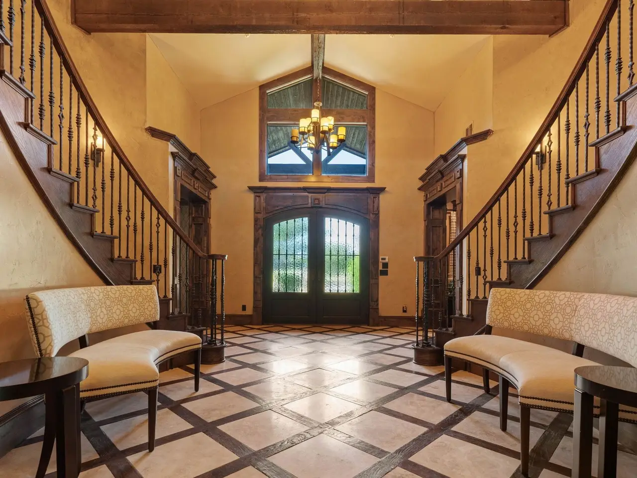 • Dramatic floor-to-ceiling stone fireplace in living room