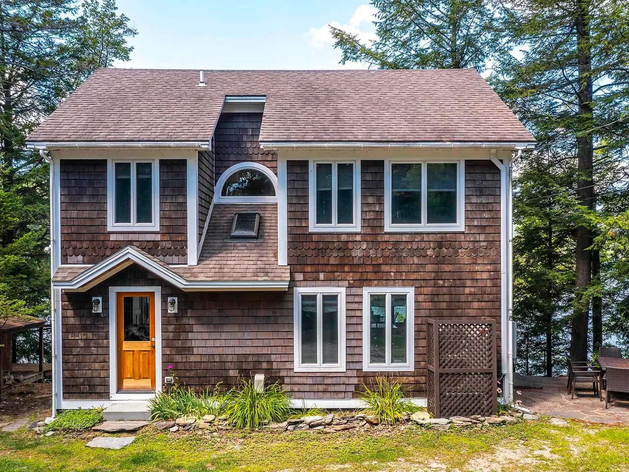 Red Bridge Road on Lake Rescue is an extremely coveted location on the lake. Facing North, this four-bedroom home capitalizes on the views with a wall of glass in the open living/dining/kitchen area. The sliders open onto a deck that spans the lake side of the house and extends the living area outdoors. The floor-to-ceiling stone fireplace in the living area offers many cozy winter days. The living room on the middle level also opens up to the expansive patio space with outdoor fireplace and plenty of room to add a hot tub! Additional common room or TV/game area can be found on the upper level of the home. The primary bedroom is also on the upper level with its own balcony and unobstructed views of the water. There is so much room to relax in this home with three living areas and the extra work room, two bedrooms on the upper level, one bedroom on the main level and bedroom on the lower level as well! Deep water dockage is in place and waiting for your water toys. Updates include the kitchen and bathrooms, as well as beautiful pine wood floors throughout all three levels of the home. This property is very special with beautiful space inside and out, for all seasons! Sold unfurnished. Appliances included. Taxes are based on town assessment. Visit the Okemo real estate community today.