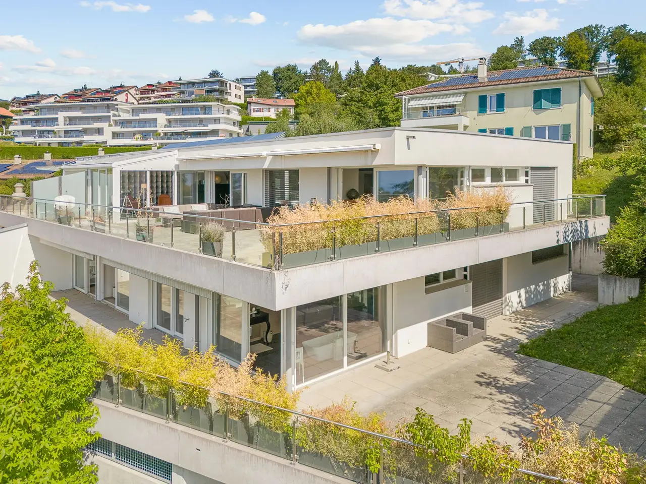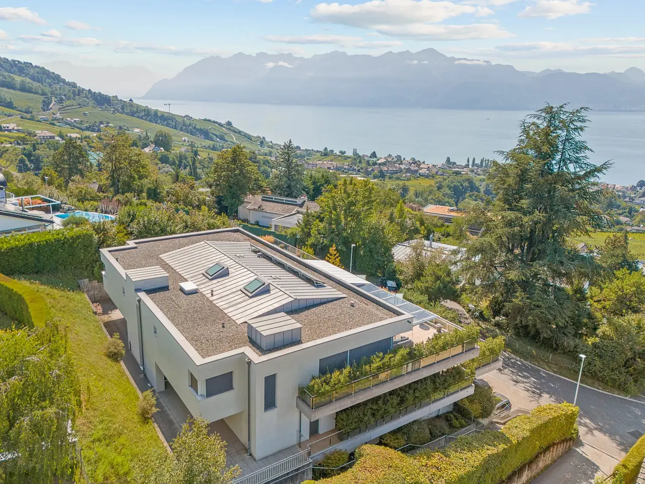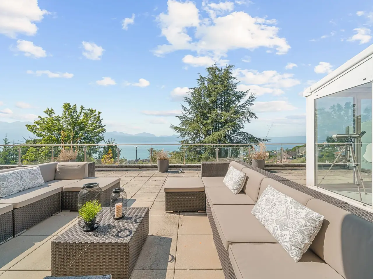 Discover this duplex penthouse apartment, located in a prestigious residence composed of two apartments. This exceptional property, spread over two floors, offers breathtaking views of Lake Geneva, blending modernity and elegance in an idyllic setting. The first level, spanning 136 sqm, opens onto a vast 180-sqm terrace, perfect for enjoying the stunning lake & Alps panorama. This level features four bedrooms, including two en-suites. The master suite is a true invitation to relaxation, with an open bathroom equipped with a shower and hammam, separate toilets, and a spacious walk-in closet. The second suite also has its own shower room and WC. Two additional bedrooms, an extra dressing room, and a bathroom with a shower and separate WC complete this floor. The second level, covering 160 sqm, is distinguished by its vast, light-filled living room, extended by a winter garden with direct access to a 107 sqm terrace wrapping around the floor. An elegant and functional open-plan kitchen seamlessly integrates with the dining area in this convivial living space. This floor also includes an en-suite bedroom with a shower room and separate WC, a guest WC, and an entrance with a cloakroom. The apartment benefits from four indoor parking spaces and a private garage (in addition), and two 12.5-square-meter cellars, providing generous storage space. A bright and elegant entry hall leads to the lift from the garage. The apartment benefits from Minergie-certified construction, ensuring high energy performance and a healthy living environment. For added convenience, central vacuuming is installed throughout the entire space. Additionally, the geocooling system provides natural and eco-friendly cooling during summer.