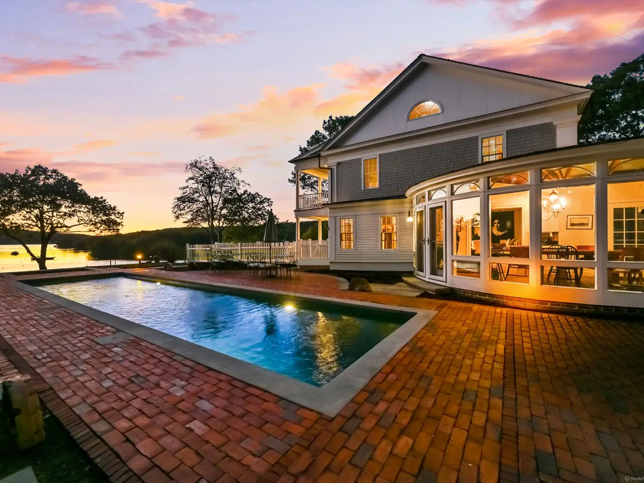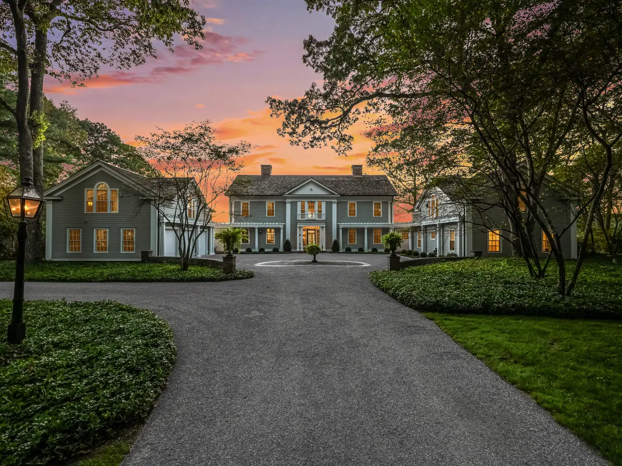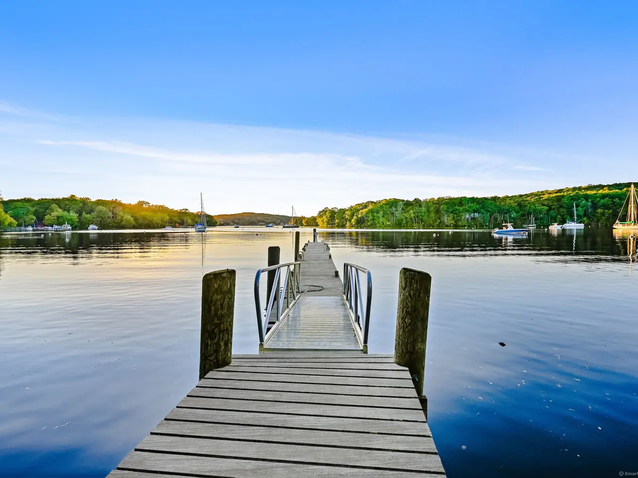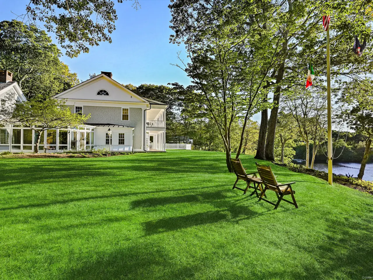 Architect-designed and inspired by Palladio's symmetry and Mount Vernon's timeless colonial grace, the essence of classic balance, symmetry, and luxury. A center-columned portico anchors the perfect proportion between two grand wings, while the interiors reveal artistry at every turn-gleaming wood floors, custom millwork, and walls of windows framing Hamburg Cove's deep-water yacht basin-where sails and yachts drift across shimmering water lusters reflecting a symphony of mystical moorings that capture what is widely considered the most breathtaking panorama on the Cove. Two magnificent semi-rotunda sunrooms at each end bathe the space in natural light, blending formal entertaining and cozy private havens that are elegant yet casual and comfortable. The chef's kitchen features a large center island and commercial-grade appliances. Two primary suites-one on each level. A large guest apartment rests over three of the six garages. The finished lower level includes a gym, billiards, and a kitchen. Landscaped grounds embrace a hardscape-wrapped pool, private expansive lawns, and stone walls-all overlooking a nightly display of fiery sunsets. The property includes one of the deepest private docks in this area-and beyond-with direct access to the Connecticut River and Long Island Sound. This remarkable waterfront residence combines architectural elegance, coastal serenity, and a setting of rare natural beauty-an extraordinary lifestyle between Boston and New York.