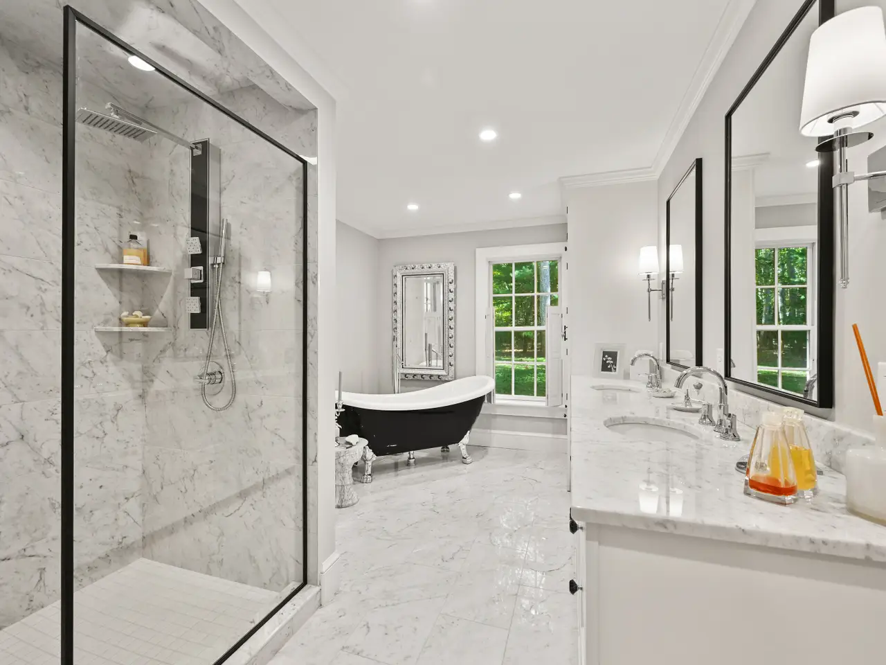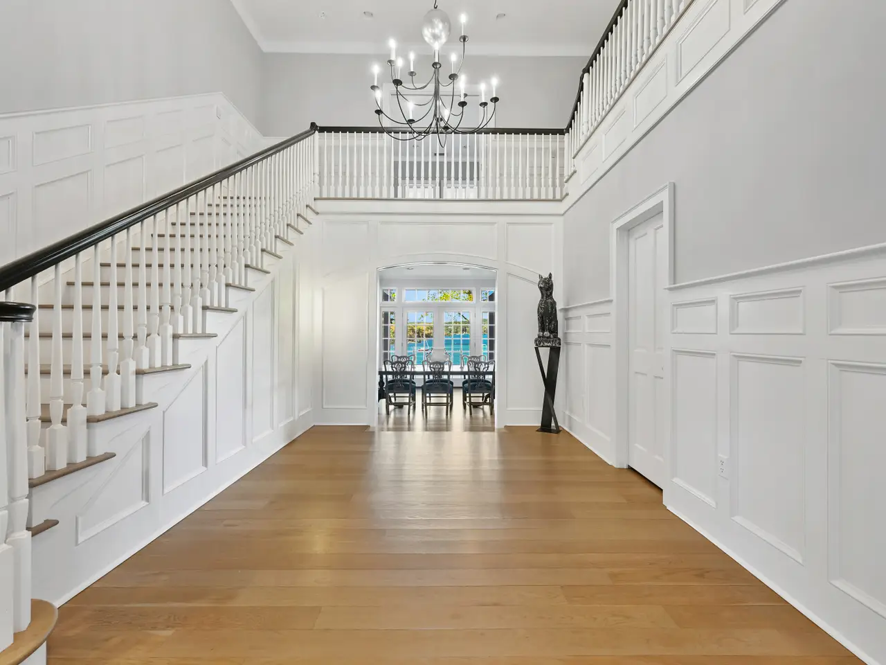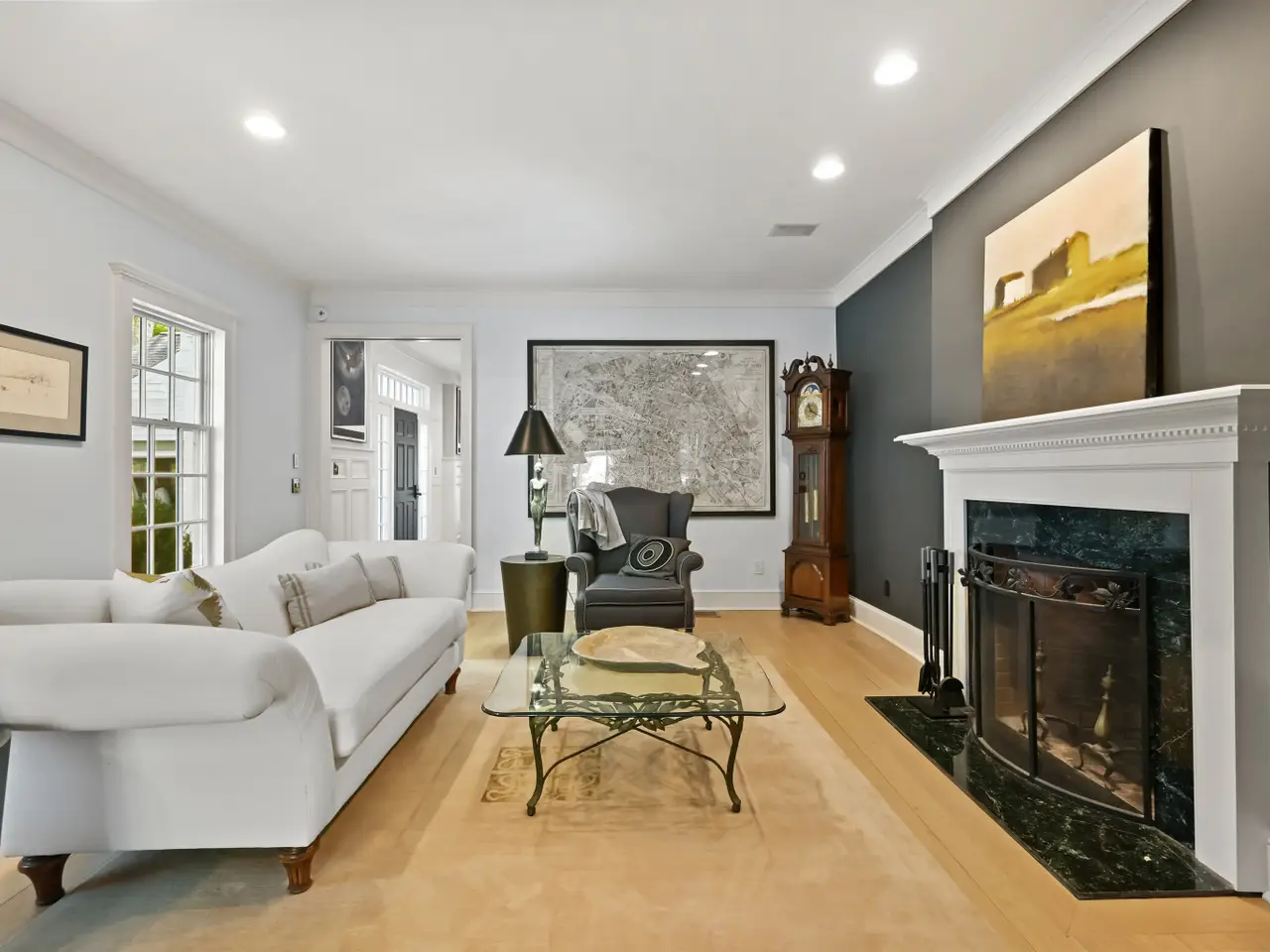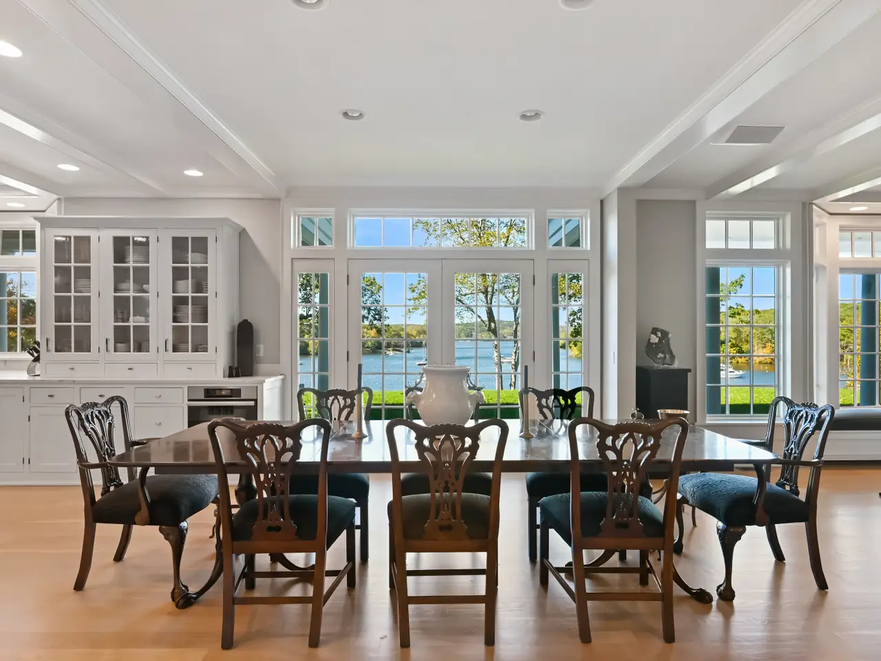 Architect-designed and inspired by Palladio's symmetry and Mount Vernon's timeless colonial grace, the essence of classic balance, symmetry, and luxury. A center-columned portico anchors the perfect proportion between two grand wings, while the interiors reveal artistry at every turn-gleaming wood floors, custom millwork, and walls of windows framing Hamburg Cove's deep-water yacht basin-where sails and yachts drift across shimmering water lusters reflecting a symphony of mystical moorings that capture what is widely considered the most breathtaking panorama on the Cove. Two magnificent semi-rotunda sunrooms at each end bathe the space in natural light, blending formal entertaining and cozy private havens that are elegant yet casual and comfortable. The chef's kitchen features a large center island and commercial-grade appliances. Two primary suites-one on each level. A large guest apartment rests over three of the six garages. The finished lower level includes a gym, billiards, and a kitchen. Landscaped grounds embrace a hardscape-wrapped pool, private expansive lawns, and stone walls-all overlooking a nightly display of fiery sunsets. The property includes one of the deepest private docks in this area-and beyond-with direct access to the Connecticut River and Long Island Sound. This remarkable waterfront residence combines architectural elegance, coastal serenity, and a setting of rare natural beauty-an extraordinary lifestyle between Boston and New York.