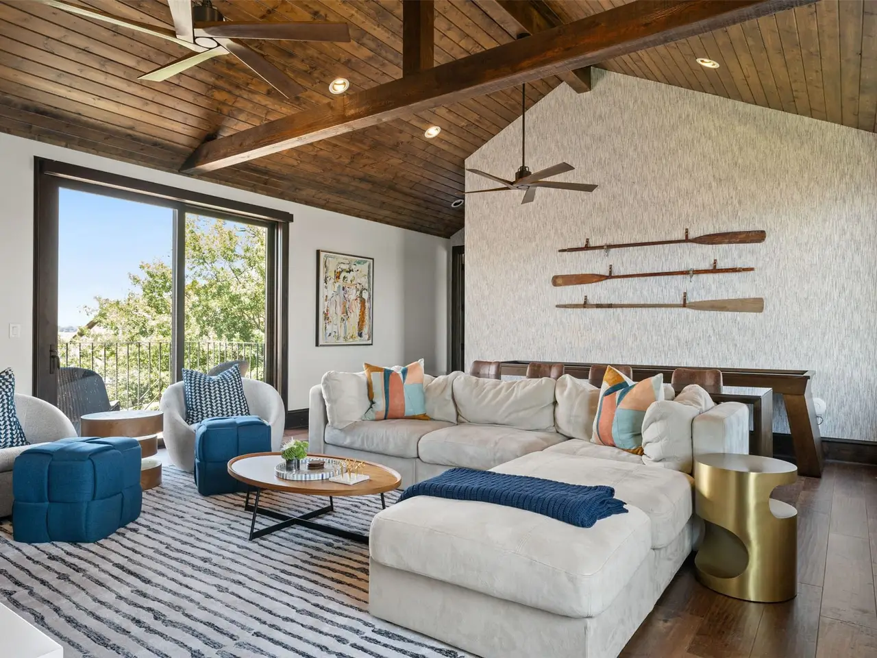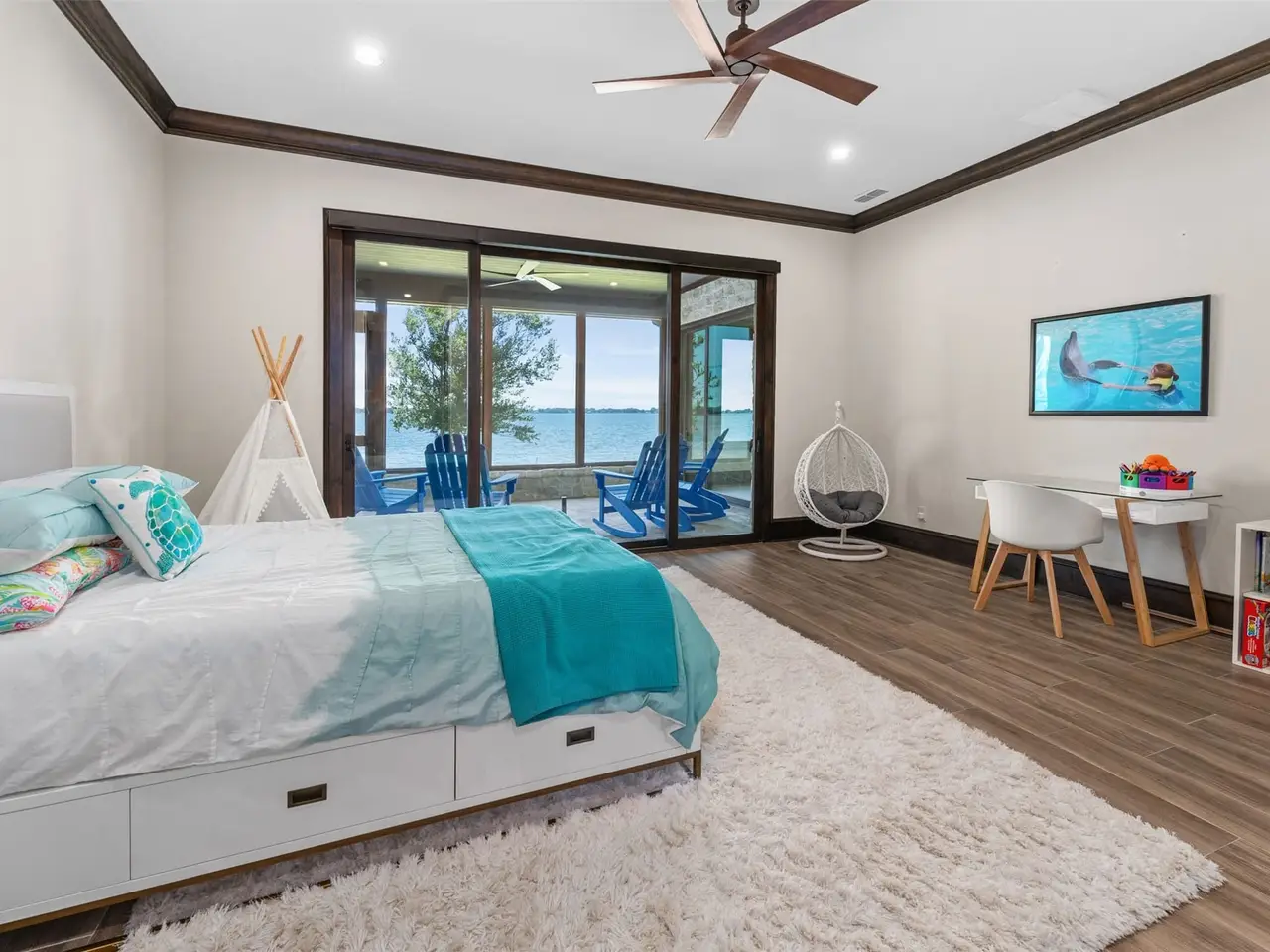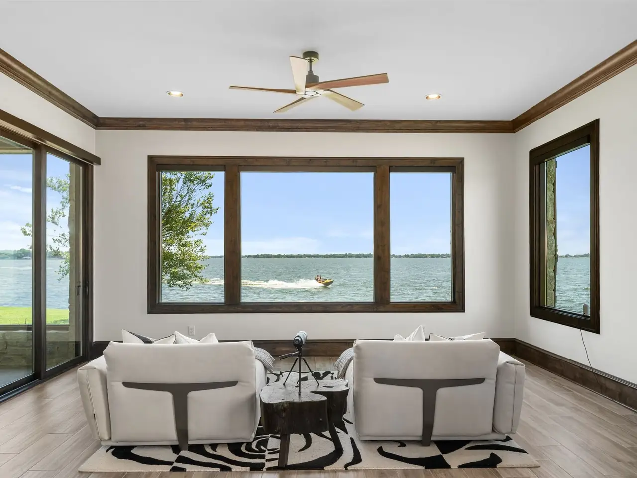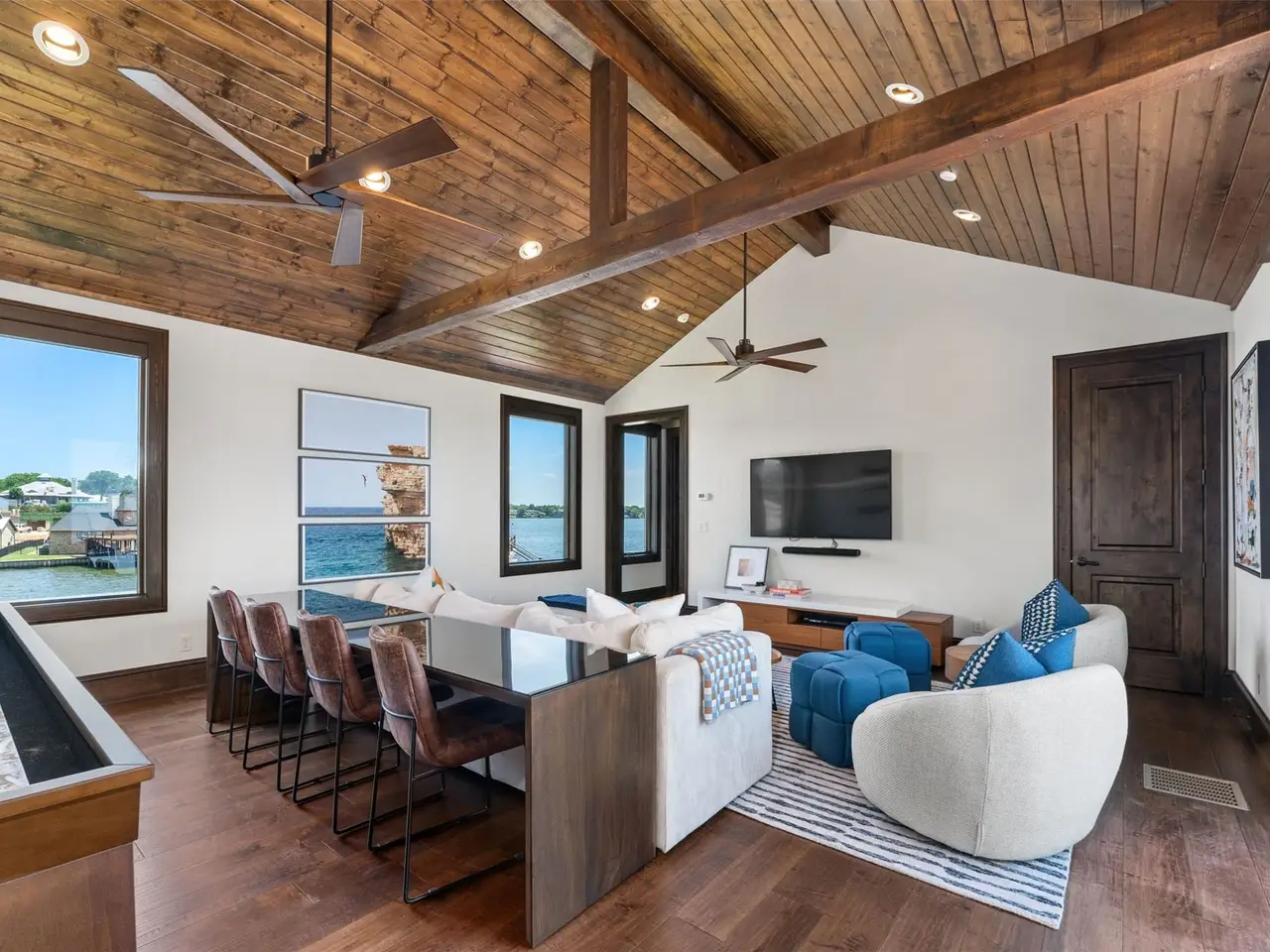 This is the benchmark by which all other Cedar Creek Lake homes are measured - contemporary in design with thoughtful use of space for every activity: five bedrooms, six baths - lake views from every room, a large primary bedroom with waterside sitting area, his and hers primary bathrooms, guest bedrooms with ensuites and enclosed waterside access, divided living area with two-sided fireplace, chef's kitchen with elegant, intimate dining, a game room, an exercise room, waterside lounging and recreation area with fireplace, completely wired for sight and sound, with a full-house 35K emergency generator, two tankless water heaters, three-zoned air conditioning, a saferoom, three-car garage with golf cart door, tri-level boat house with three lifts, water and electricity, and wired for electric gate - oh yeah, and over 350 wide open waterfront feet!