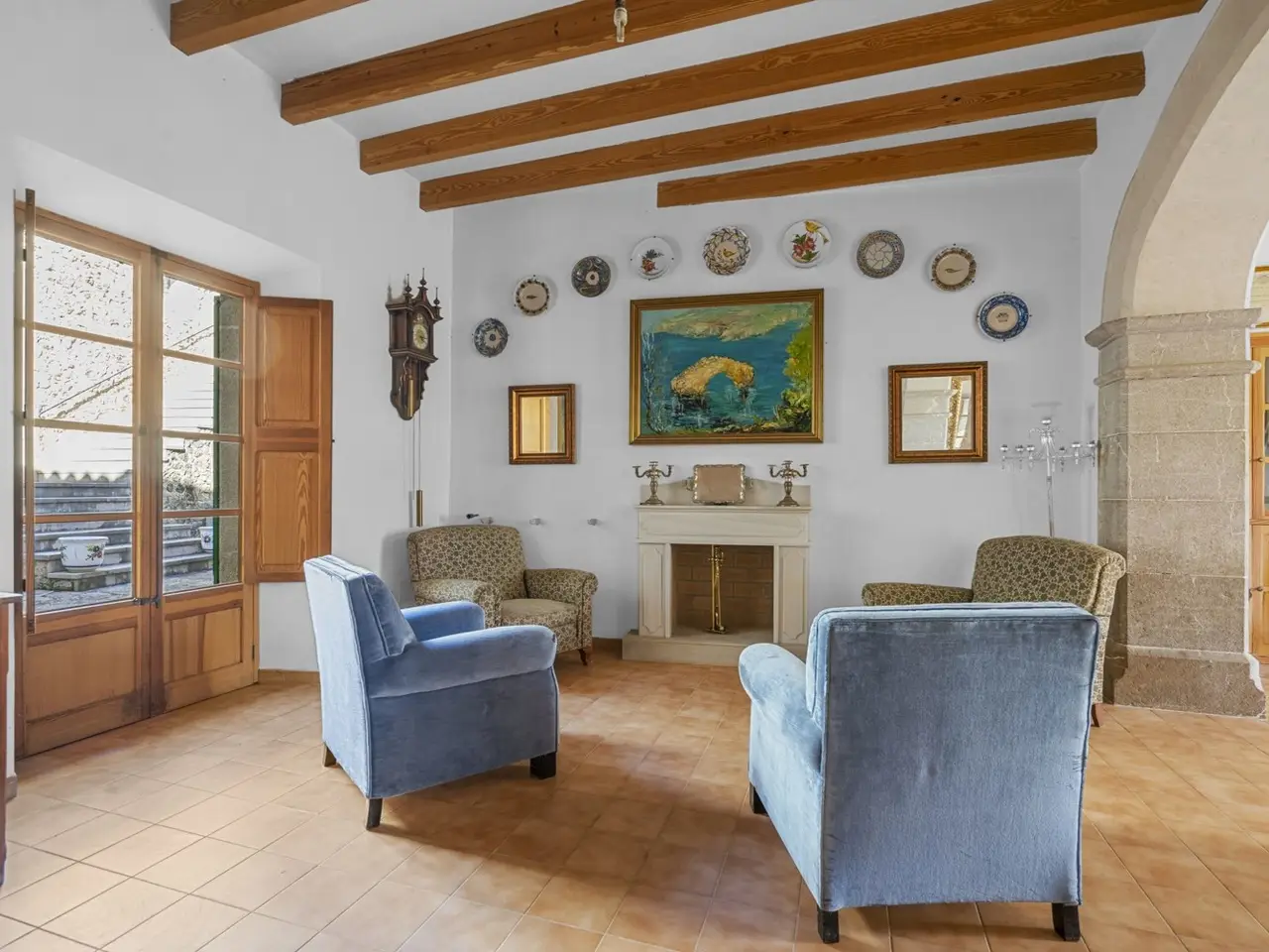 This historic townhouse, originally built in the 14th century, offers a rare opportunity to immerse yourself in a piece of history. With a living area of approximately 274 m² and a plot area of approximately 1362 m², this well-maintained property is located in the center of Mancor de la Vall. The house comprises a total of seven rooms, including six bedrooms and four bathrooms. Solid natural stone walls, traditional wooden beam ceilings, tiled and stone floors, a fireplace and an antique olive oil press give the building its authentic character and historical charm. The ground floor offers spacious rooms with direct access to a central courtyard, which is equipped with its own well. Several smaller buildings within the property house garages for up to four cars and various utility rooms. The property is equipped with oil heating. A garden, which is located across the street, is surrounded by large natural stone walls and shady trees. This additional plot offers plenty of space for creative design options and has the potential to become a highlight of the property with new ideas. This offer will appeal to those looking for a unique residence that is both a retreat and an expression of a bygone era. Position Mancor de la Vall is located in the heart of the Serra de Tramuntana, about 215 m above sea level, and has retained the original charm of a small village in a valley surrounded by mountains. In addition to Mancor, the municipality also includes the hamlets of Biniarroi, Massanella and Biniatzent. Of particular architectural interest are the parish church of Sant Joan Baptista and the chapel of Santa Llúcia, which were first mentioned in 1358. It is worth taking a walk to the chapel to enjoy the beautiful views of the village and the mountains. Here you can also admire several houses with interesting architecture, such as Can Marquesí, Son Simó, Cas Vellaco or Turixant. The latter is now a hotel with a restaurant. In November the Fira del Esclata-sang i la Muntanya (Mushroom and Mountain Festival) is held. Mushrooms are the stars of the festival, especially the esclata-sang, which is a key ingredient in many of the island's autumn gastronomic specialties, and it is an excellent opportunity to buy all kinds of artisan products and try delicious mushroom dishes in the restaurants and bars. Palma is about 35 km away. Surrounded by mountains, Mancor de la Vall offers hikers the opportunity to discover an unspoilt landscape of great beauty. equipment - Fireplace - Oil heating - Tile and stone floor - Antique olive oil press - Patio with well - Garages for 4 cars - Garden across the street parking space 1 x garage Other Information We generally recommend having the building law situation checked by a specialist lawyer. All information is based exclusively on information provided by the owner or client. We do not guarantee that the information is complete, correct or up-to-date. The brokerage fee is borne by the seller. Taxes incurred on the purchase, notary and land registry costs are to be borne by the buyer.