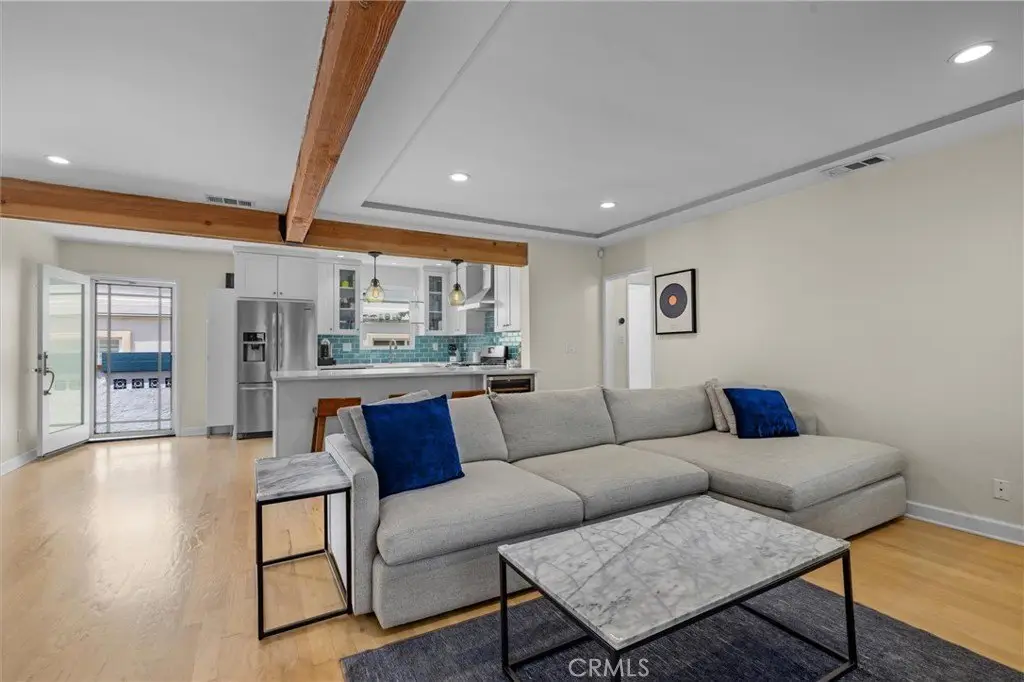 Coastal charm meets modern comfort in this light-filled 3 bed, 2.5 bath home nestled in the heart of the Tree Section of Manhattan Beach. Thoughtfully designed for both everyday living and relaxed entertaining, this home welcomes you with an airy living room featuring vaulted wood-beamed ceilings, rich hardwood floors, and a cozy wood burning fireplace, perfect for cool coastal evenings. The open-concept kitchen is a showstopper, bathed in natural light and accented by marble countertops, bar seating, a farmhouse sink, stainless steel appliances, a wine fridge, and a bold teal tile backsplash. A side door offers easy access to the private backyard, seamlessly connecting indoor and outdoor living. To the right, two generously sized bedrooms share a beautifully renovated full bathroom. To the left, you’ll find a convenient powder room, a dedicated laundry area with hookups, and the spacious primary suite. French doors open to the side patio, while the spa-like en-suite features a dual sink vanity, stylish tile flooring, and ample closet space. The backyard is an entertainer’s dream, complete with a custom putting green and room for al fresco dining or weekend BBQs. The home also includes an oversized 2-car garage, offering plenty of storage and space for beach gear, bikes, or a home gym setup. Located moments from award-winning schools, downtown shops and restaurants, and world-class surf, this home offers the best of beachside living.