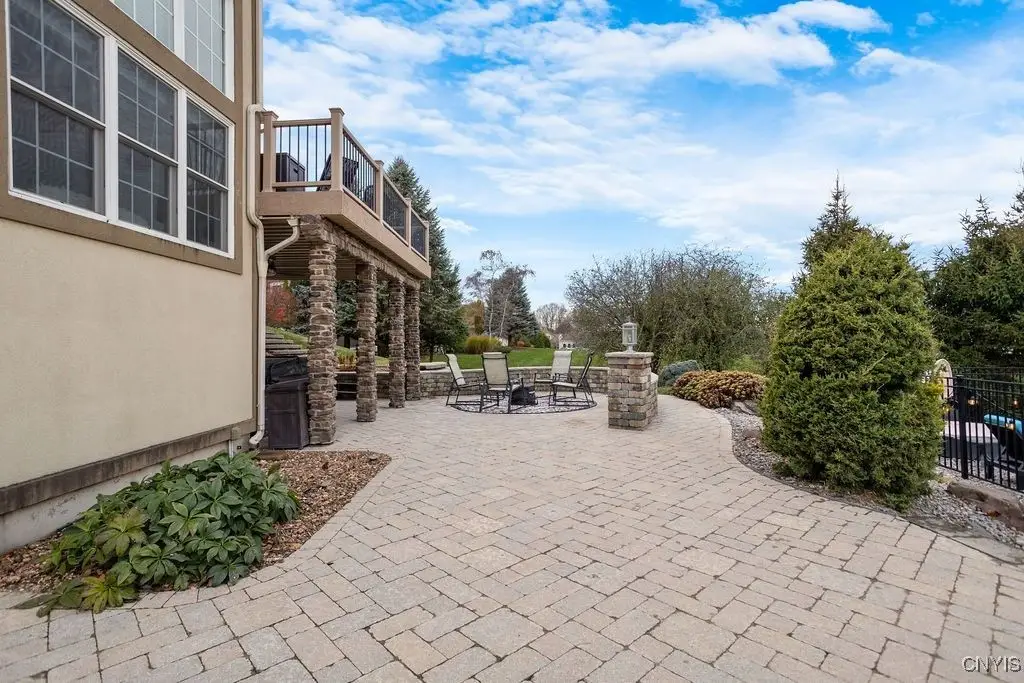 Dramatic Fendt Transitional Colonial with exceptional curb appeal. A grand foyer welcomes you into a formal living room featuring a fireplace and a full wall of custom cabinetry, perfect for display and storage. The spacious dining room opens to a custom cherry kitchen boasting a massive granite island, breakfast bar, pot filler, and walk-in pantry, truly a chef's delight with abundant storage throughout.The kitchen flows seamlessly into a great room filled with natural light from oversized windows and a cozy fireplace. A back staircase leads to the upper level, which offers three bedrooms including a guest suite, a convenient laundry room with generous storage, and a luxurious primary suite featuring two walk-in closets (one with a California Closet system), dual sinks, extensive built-ins, and an oversized layout.From the kitchen, an open sitting area overlooks the lovely backyard. Another staircase leads to a completely finished walkout basement, featuring a large recreation room, theater room with eight reclining tiered seats, stereo projector, built-in speakers, and heated floors. There's also a game/music room, a bedroom/exercise room, and a full bathroom, bringing the total finished living space to approximately 4,800 square feet. Outdoor living is just as impressive, with two levels of decking, the upper deck perfect for seating, and the lower patio designed for superb entertaining, complete with a fireplace pit, pizza oven, wine chiller, grill, and an 8-foot granite table (included). All this overlooks a beautiful in-ground pool and backyard.This home truly has it all, luxury, comfort, and space. You'll want to make this your permanent home!