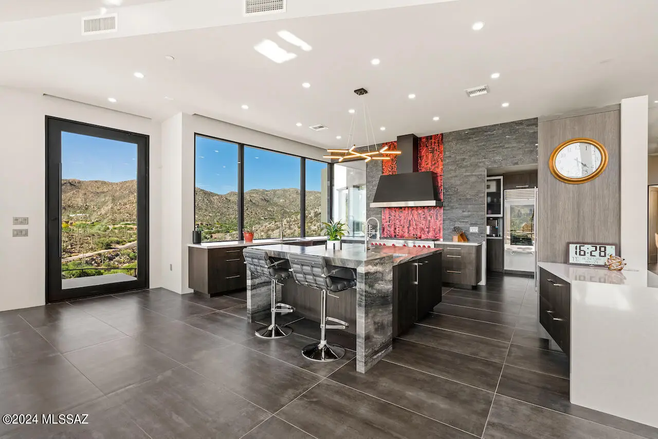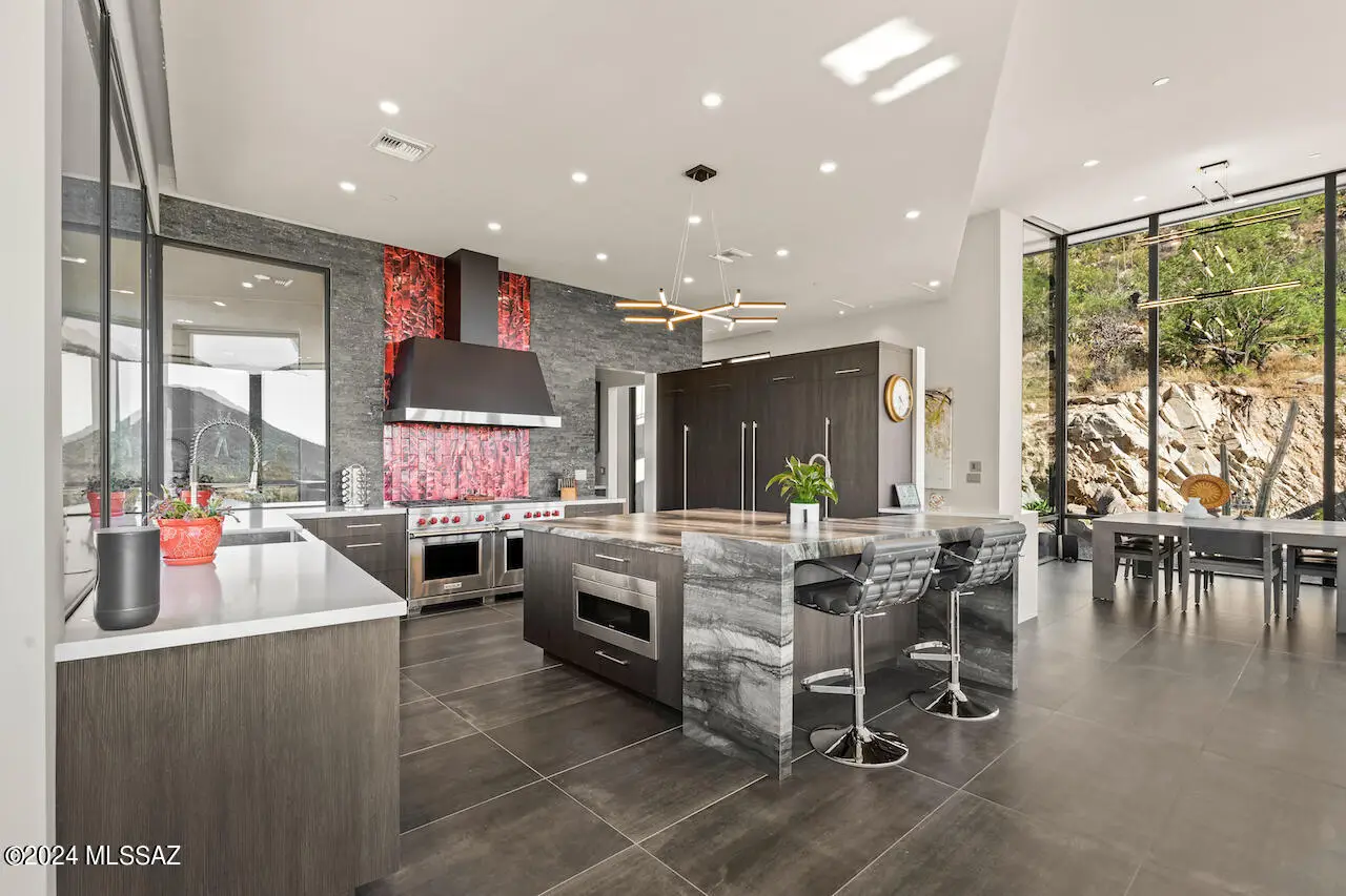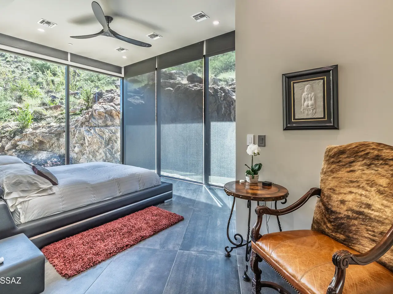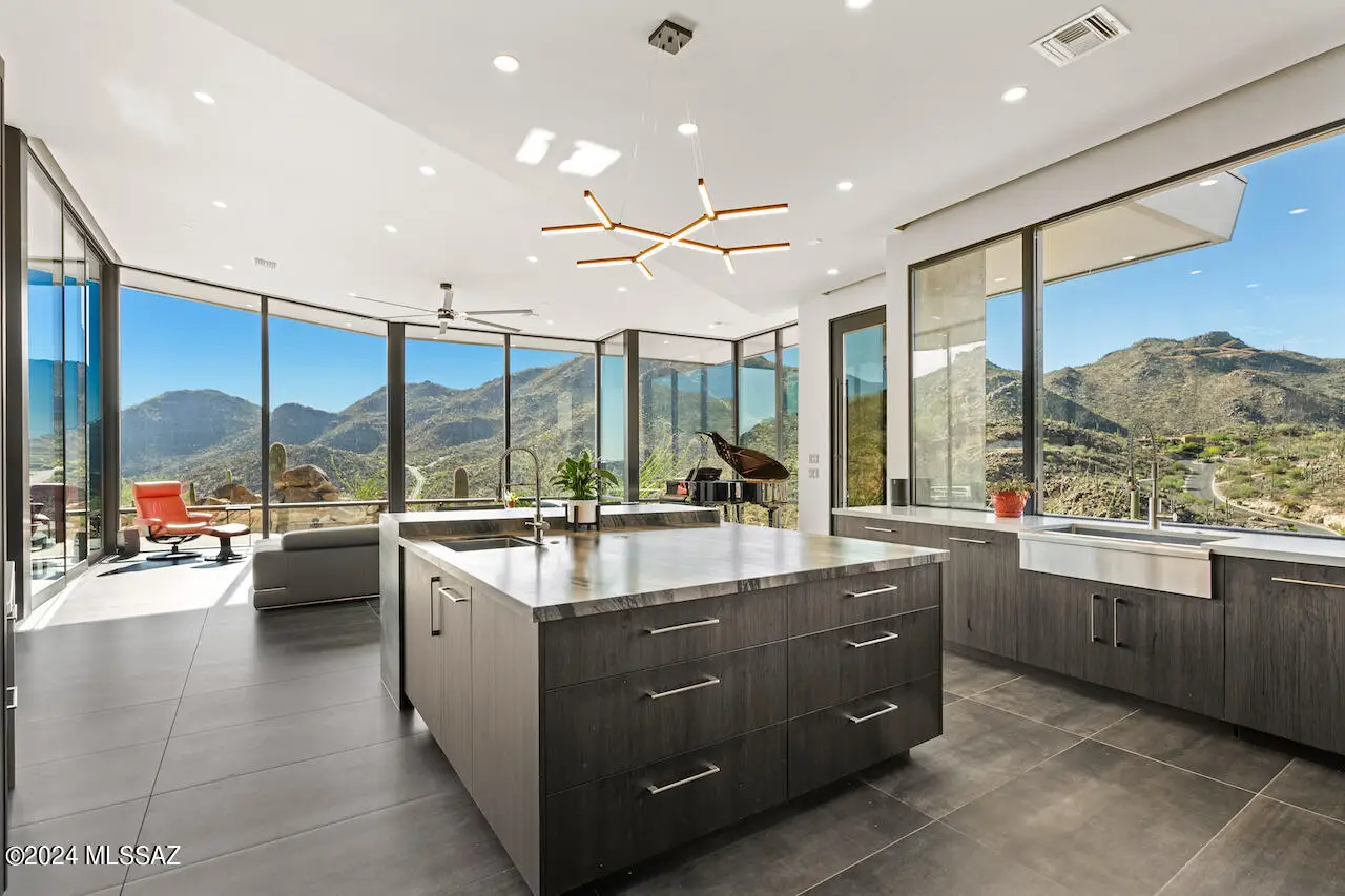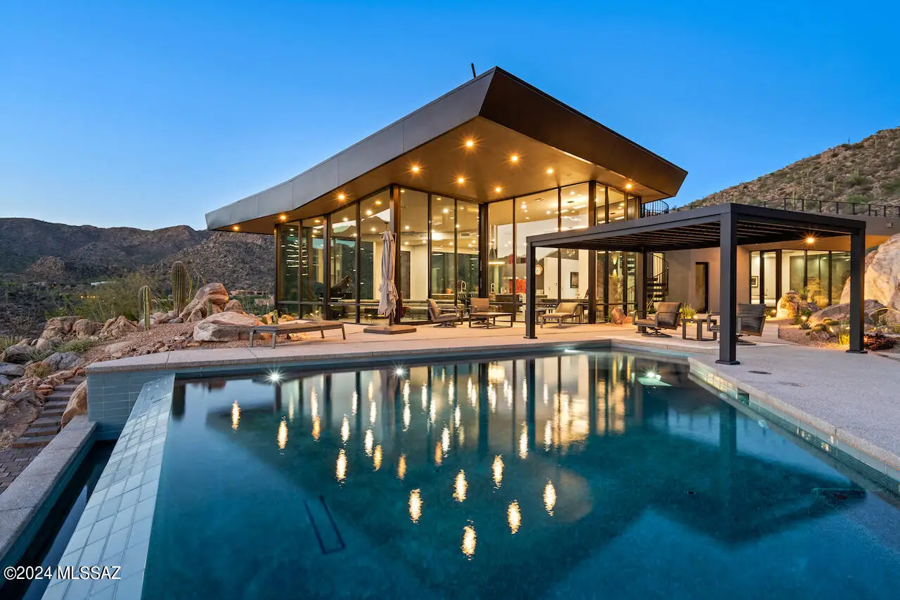 Come visit this custom Desert Modern residence within the man-gated community of Canyon Pass at Dove Mountain. Situated on a gentle rise above other neighboring homesites, this 9+ acre residence is positioned within large Sonoran Desert rock outcroppings providing unobstructed views in all directions. The 'open floor plan' was designed by Mark Soloway w/high ceilings + oversized floor to ceiling glass panes. The residence provides unlimited views yet creates a feeling of privacy and exceptional solitude. High end finishes throughout this custom masterpiece include Subzero/Wolf appliances, Lutron shades and comes fully furnished including a baby grand piano, artwork and electronic accessories. A stylish glass pneumatic elevator provides access to and from the lower level which contains