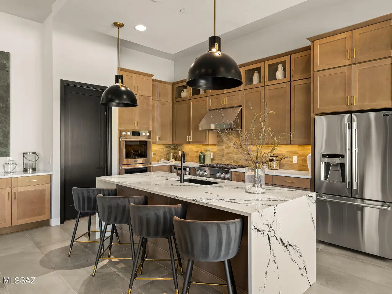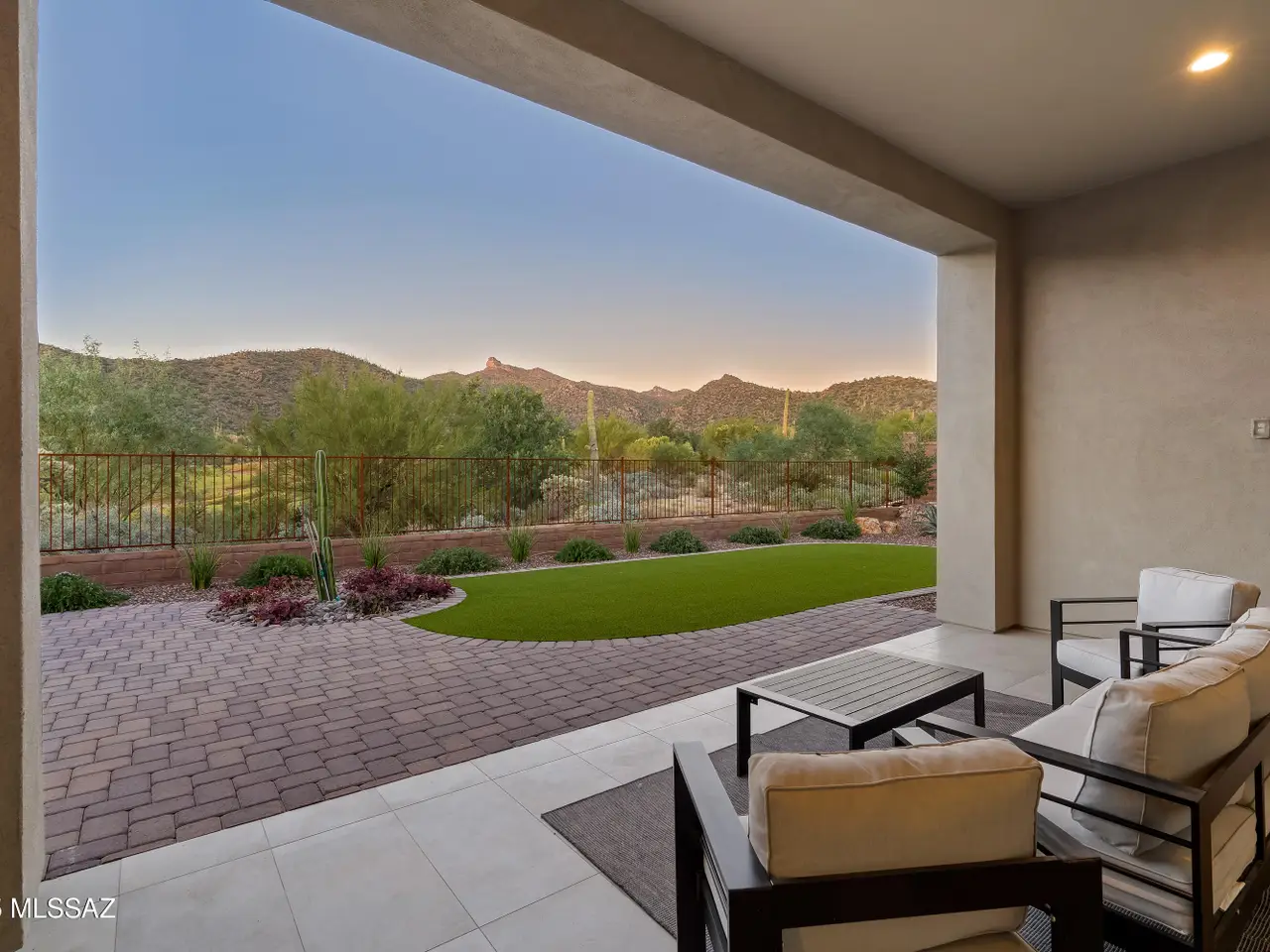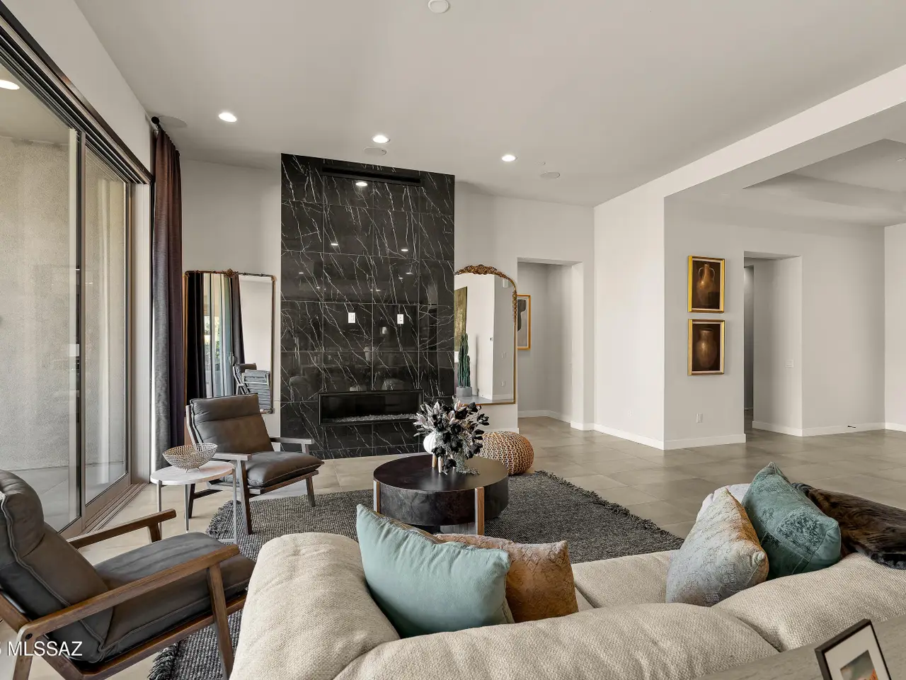 Located in the gated community of Boulder Bridge Pass, this former Acacia model by Fairfield Homes offers luxury living on the Dove Mountain Golf Course. The home features three spacious bedrooms, each with its own en suite bath, plus a dedicated office and a versatile teen retreat. The elegant great room centers around a gorgeous fireplace, soaring 12-foot ceilings, and a multi-panel sliding door that opens to a private covered patio. The gourmet kitchen boasts quartz countertops, a large island, and premium stainless steel appliances, along with a generous pantry featuring walk-in storage. The primary suite captures breathtaking mountain and golf course views and includes a spa-inspired bath with high-end finishes. The modern exterior with stone accents complements the Tortolita Mountain backdrop, while the low-maintenance yard offers turf and a built-in barbecue perfect for outdoor entertaining. Additional highlights include a three-car garage and designer finishes throughout.