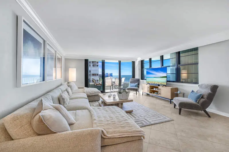 Experience luxurious beachfront living in this 3-bedroom, 3-bath residence at Summit House on Marco Island. This south-side, front-facing unit offers a wraparound balcony with breathtaking sunrise-to-sunset views of the Gulf of Mexico and beach. The open floor plan features a spacious kitchen with custom cabinetry, granite counters, and a built-in wet bar with wine cooler. The primary suite includes his-and-her closets with custom built-ins, a large bath with dual vanities, and walk-in shower. Two expansive guest suites each offer en suite baths and space for two queen beds. Additional highlights include impact windows and sliders, accordion shutters, tile flooring throughout, abundant storage with multiple closets, a walk-in storage room inside the unit, and a private storage area near the elevator. Summit House provides a private path to the beach and resort-style amenities including a pool, spa, fitness center, social room, bike storage, and grill area, plus plenty of covered parking for owners and guests.