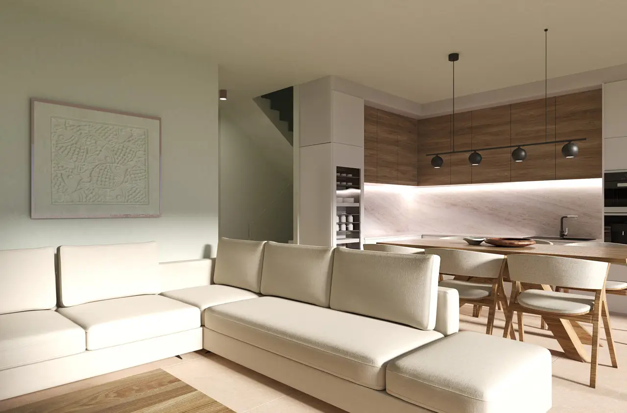 Discover an extraordinary residential gem in Marratxí - Sa Cabaneta: a planned terraced house that leaves nothing to be desired. This domicile extends over two floors and combines sophisticated architecture with modern comfort to perfection. As you enter this impressive townhouse, you pass from the entrance area via the first bedroom and a bathroom directly into the spacious living and dining room. A stylish fitted kitchen awaits you here, seamlessly integrated into the living area and equipped with high-quality appliances. The expansive glass fronts open up a captivating view of the approximately 17 m² swimming pool and the magnificent, approximately 33 m² terrace. From here you can enjoy a breathtaking panoramic view of the valley and the majestic Tramuntana mountains. On the lower floor there are three further spacious bedrooms, each with an en-suite bathroom and a dressing room. Each of these bedrooms also offers a fantastic panoramic view, which further emphasizes the feeling of luxury and security. Despite its central location, this exclusive home offers you an oasis of tranquillity: relax by the pool and let your gaze wander into the distance. You also benefit from air conditioning, which ensures a pleasant indoor climate all year round, and high-quality tiling, which stands for elegance and style. This terraced house combines modern amenities with a unique living experience and offers you a unique opportunity to realize your dream of owning your own home on the enchanting island of Mallorca.