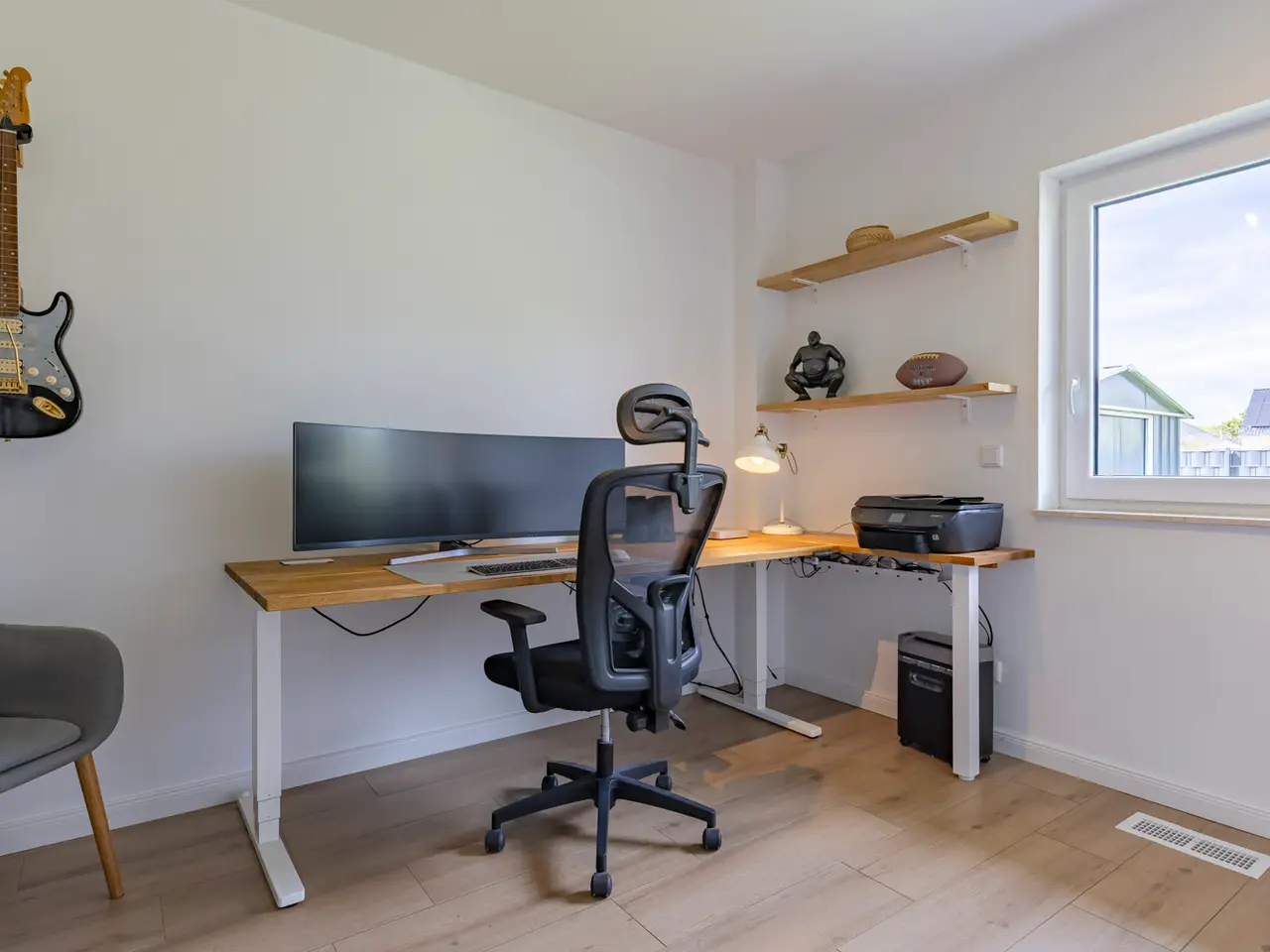 This well-kept detached house, built in 2017, is for sale in a high-quality residential estate. With a living space of approx. 161.9 m² on a spacious plot of approx. 1305 m², this house offers a wide range of possible uses and modern amenities. The property comprises a total of five rooms, including four bedrooms and two bathrooms. The first floor and upper floor have underfloor heating, which is operated by an efficient geothermal heat pump (brine borehole) and is also combined with a ventilation system. This environmentally friendly solution ensures a pleasant heat distribution and fresh air supply throughout the house. The home technology is supported by Homatic smart home control, which enables convenient operation of heating, lighting and other electronic devices. LAN cabling ensures a reliable internet connection throughout the houseThe rooms are fitted with high-quality tiled and vinyl flooring. The fitted kitchen offers ample worktop and storage space. The stylish outdoor facilities underline the special character of this property. A spacious, covered natural stone terrace with electric awning invites you to spend relaxing hours outdoors. Paths and paving made of natural stone and granite are not only a visual highlight, but also robust and durable. A fountain with irrigation system supplies the high-quality plants in the garden. A garden shed offers additional storage space, e.g. for bicycles, or can be used individually. The spacious double carport is directly connected to the house, so that you can reach your car safely even in bad weather. The long, paved driveway also offers ample parking space for families and visitors. The electric access gate offers additional convenience and security. The location of the property is characterized by its tranquillity and good connections to the surrounding freeways. Schools and shopping facilities are just a few minutes' drive away, while the nearby golf course provides leisure activities and recreation. The large plot also offers the possibility of integrating a pool or other leisure facilities. All in all, this as-new detached house presents itself as a property that impresses with both its modern fittings and its versatile usage options. The combination of a quiet location, high-quality construction and environmentally friendly technologies makes it an ideal home for discerning buyers who value quality and comfort.