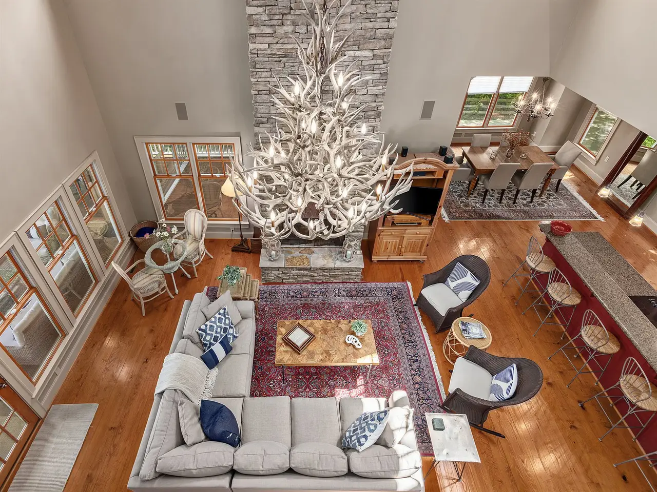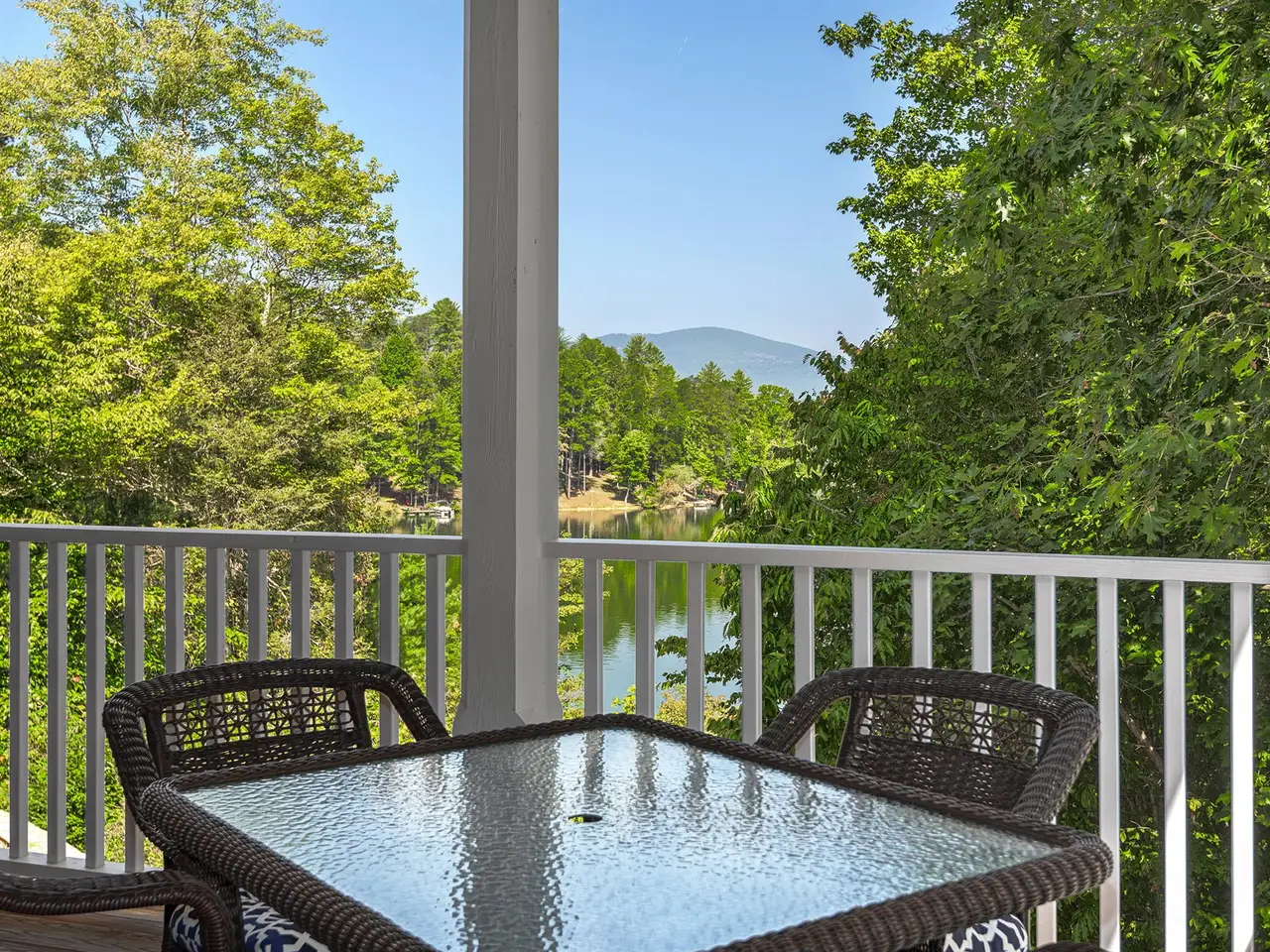 Idyllic lakefront home tucked in a private cove on Lake Adger is the perfect mountain getaway! Featuring year-round lake and mountain views, this home sits close to the water and has a gentle sloped yard with stone pathway to the lake and your own floating dock. This home checks all the boxes including an open floor plan, a large versatile kitchen, warm pine wood floors, and a marvelous great room with a dramatic two-story stacked stone fireplace and vaulted wood ceilings. The rooms are spacious, and the ceilings are almost 10' tall throughout. Relax and listen to the splashing creek from the wraparound covered porch or terrace level patio. Create the ultimate home office on the second level loft. Invite all of your friends because there is plenty of room including a terrace level family room with entertainment kitchenette, a large bunk room, and bonus rooms throughout. Loads of storage, and an attached tandem garage with plenty of room to store your water toys. This is the lake life!