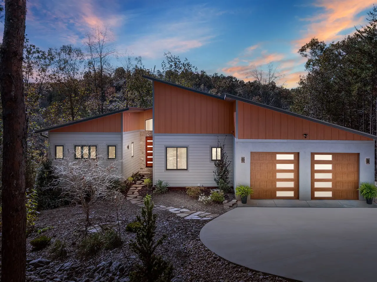 Peaceful lakefront property with mountain views on Lake Adger. This hideaway home offers soft lake breezes and sanctuary from busy city life. Includes your own private floating dock and over 300 feet of lakefront. A serenity entry at the enclosed patio garden with a gentle water feature. Step inside and you will find stylish design with soaring ceilings along with African Mahogany and steel accents throughout the house, perfectly highlighted by modern light fixtures. The main level screened porch is ideal for relaxing and the open concept living space makes for easy entertaining. Experience mountain, lake, and wooded views from the secluded primary suite with lovely skylights to explore dark sky stargazing. The primary bath is highlighted by a natural edge Maple slab vanity plus a Victoria and Albert freestanding soaking tub and separate frameless glass shower. The terrace level family room has its own fireplace and walk-out to a tiered patio. Life is better at the lake!