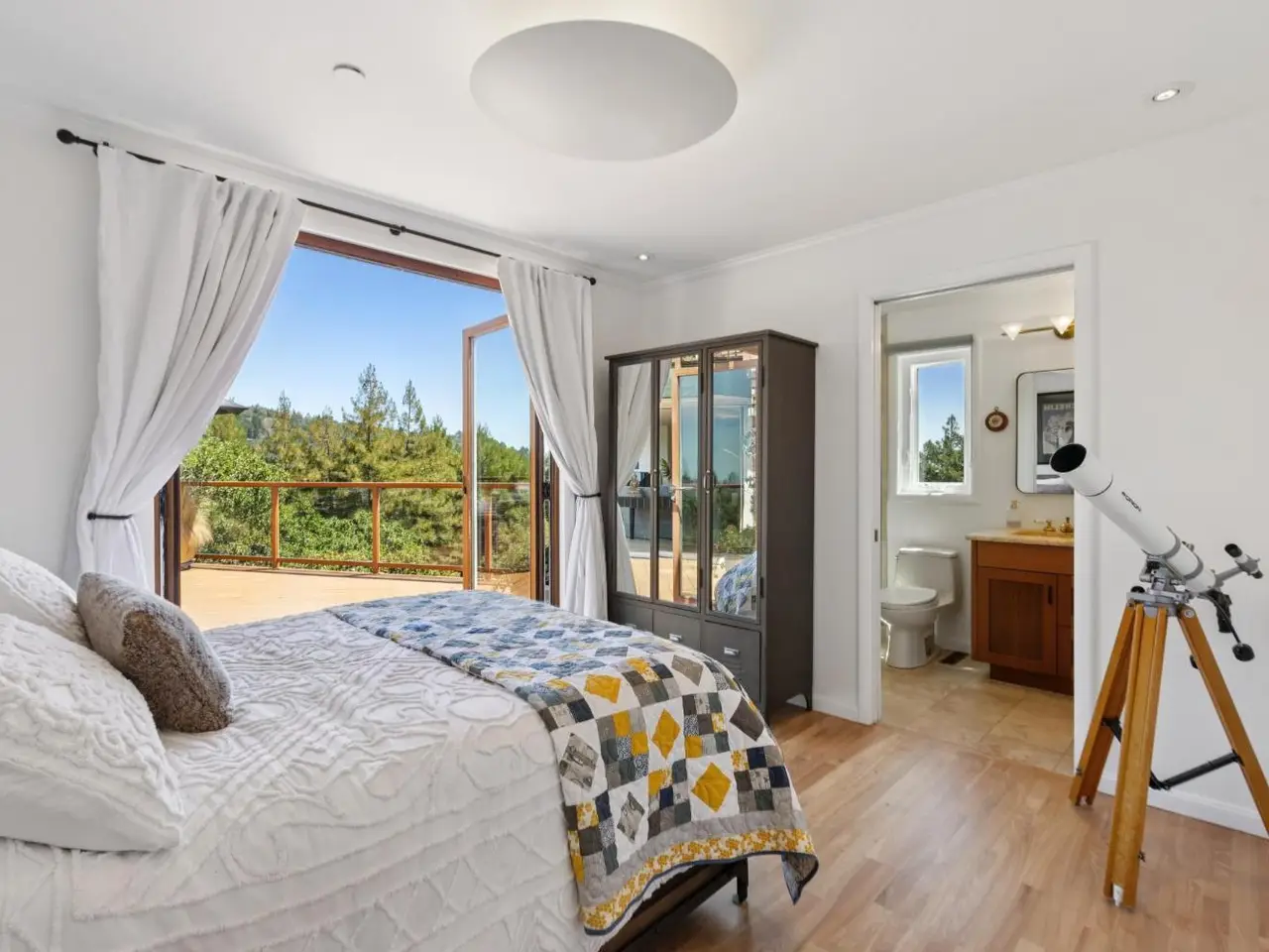 This stunning custom four-bedroom, five-bath home on prestigious Middle Ridge delivers the quintessential Marin lifestyle with sweeping views spanning the surrounding hills to Angel Island, the Bay, and downtown San Francisco. Entertain effortlessly on multiple decks, including the main deck accessible through custom moveable glass doors from the expansive great room featuring living, dining, and gourmet kitchen areas. The chef's kitchen showcases elegant Italian marble countertops, top-tier appliances, and exquisite custom mahogany Berkeley Mills cabinetry. Two sunny main-level bedrooms each offer en-suite baths, while the private upper-level primary suite captures incredible vistas from dual private decks, one featuring a spa tub and outdoor shower. This indulgent retreat includes a luxurious bath, wood-burning marble fireplace, oversized walk-in closet, and dedicated office and exercise areas. A versatile guest suite with separate entrance provides flexible living options. Premium features include hardwood floors throughout and owned solar panels. Situated on a tranquil, sun-drenched avenue mere minutes from downtown Mill Valley's award-winning schools and world-renowned hiking and biking trails.