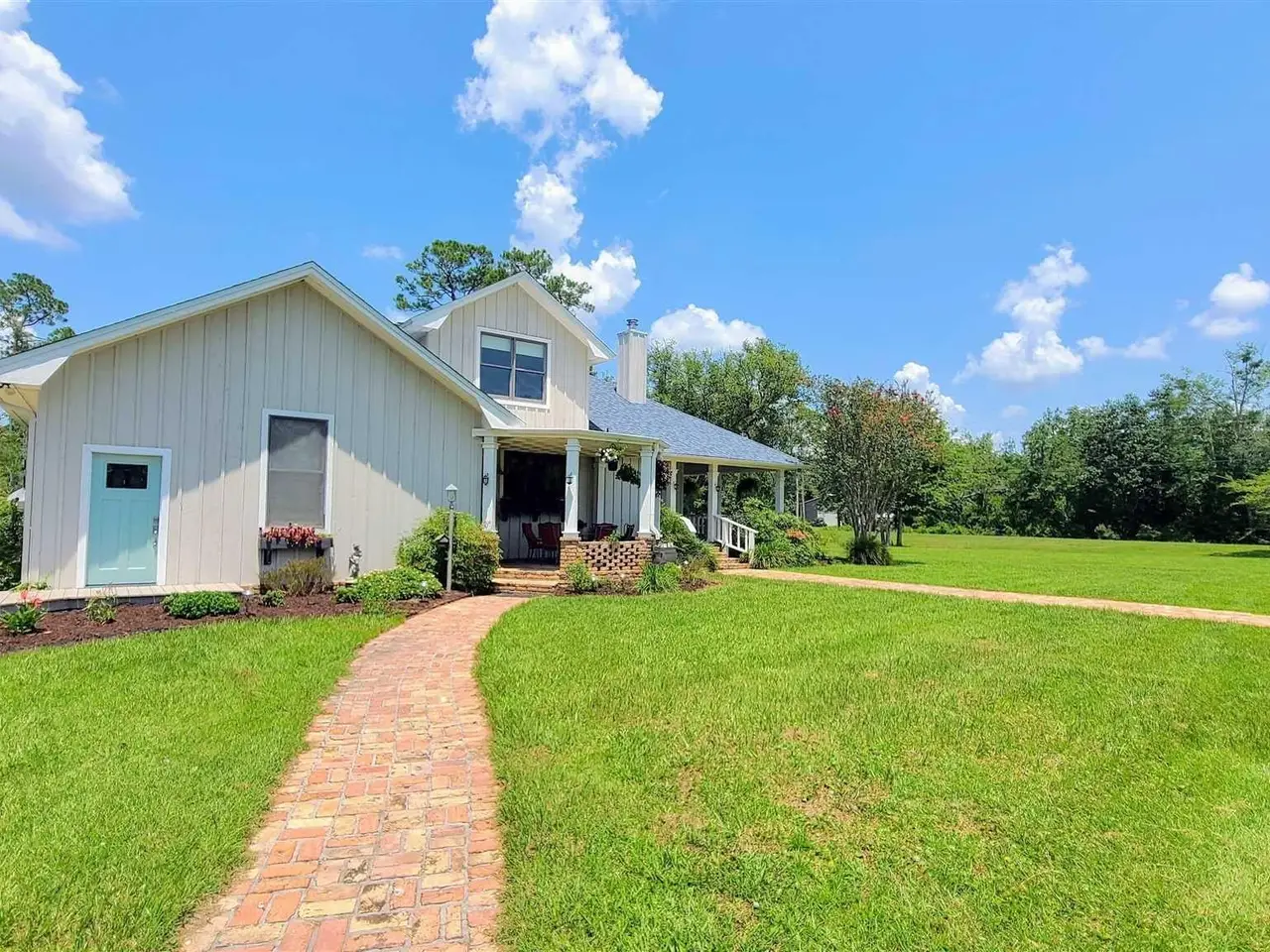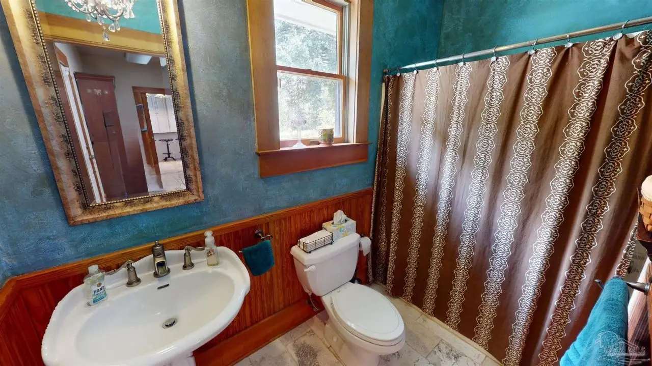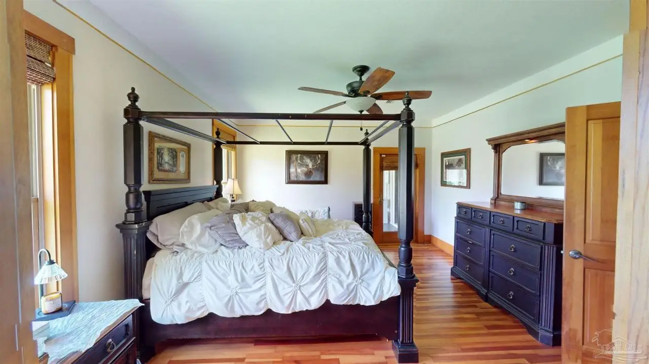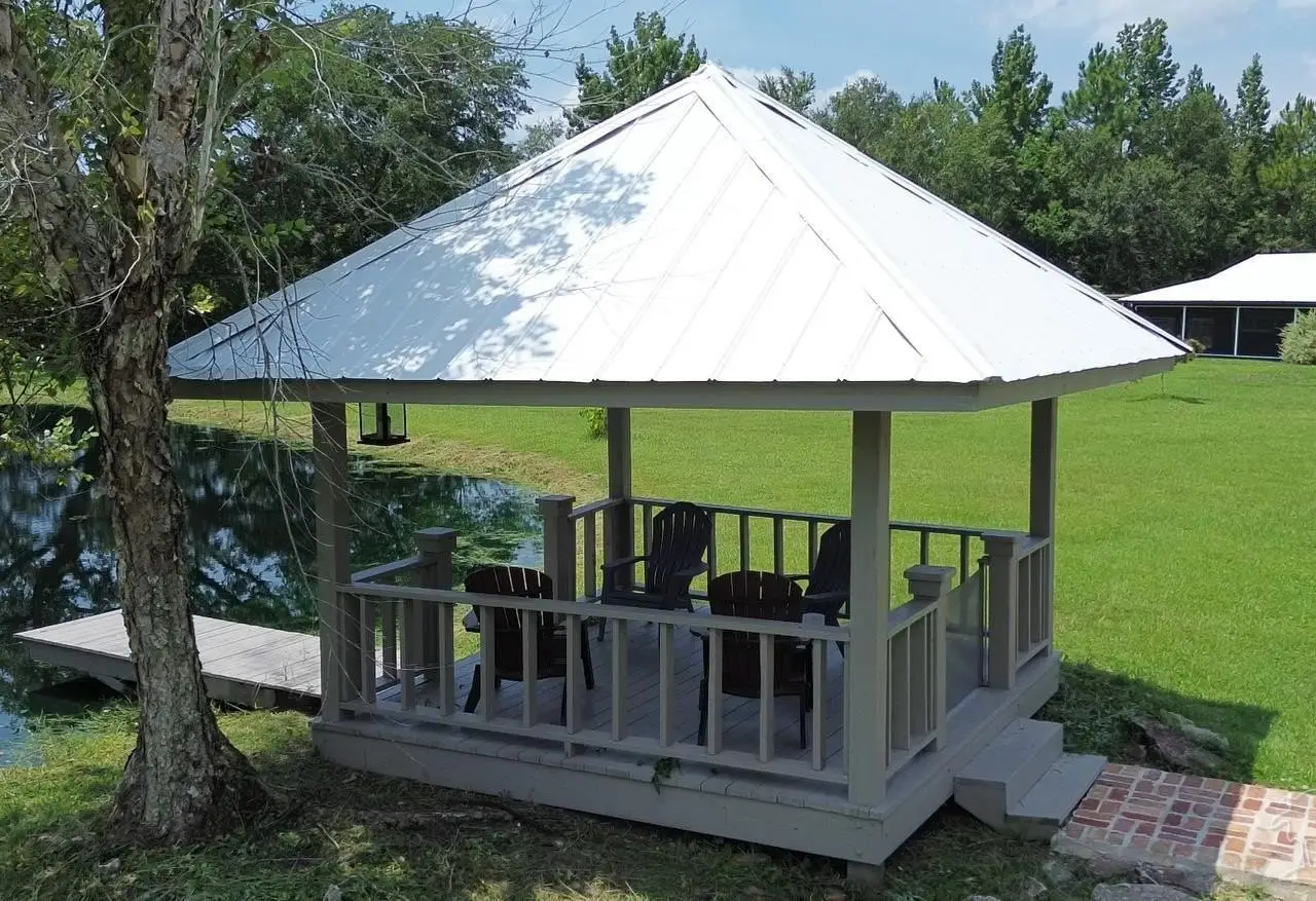 This Garcon Point-Milton expansive property could be an entertainer's dream, an event venue property for weddings or conferences, a multi-generational family compound, or income producing (AirBnB). The homes are a Tuscan-style main house, a guest house, and a studio cottage. Solar panels help reduce electricity costs! The main house has three bedrooms and baths with unique custom details like 'Henry' stained glass, cypress beamed ceilings, and a wood-burning stove. Its open layout connects living, dining, and kitchen areas to various porches, perfect for gatherings. A large loft offers versatile space. The guest house is fully furnished with two bedrooms, one bath, and a full kitchen, while the studio cottage provides a kitchenette, bath, and a screened porch with pond views. Both could be income producing! Outdoor amenities include an entertaining pavilion, a dining/cooking shack, a pool oasis with a cabana and fire pit, and a Rainbow swing set. Children love this property! Overlooking the self-watering pond are a gazebo and dock. The property also has a workshop, garden shed, raised garden beds, and a metal garage for extra storage or vehicles. It's conveniently located in quiet rural area just three miles south of I-10... including a local marina 5 minutes away to launch your boat!