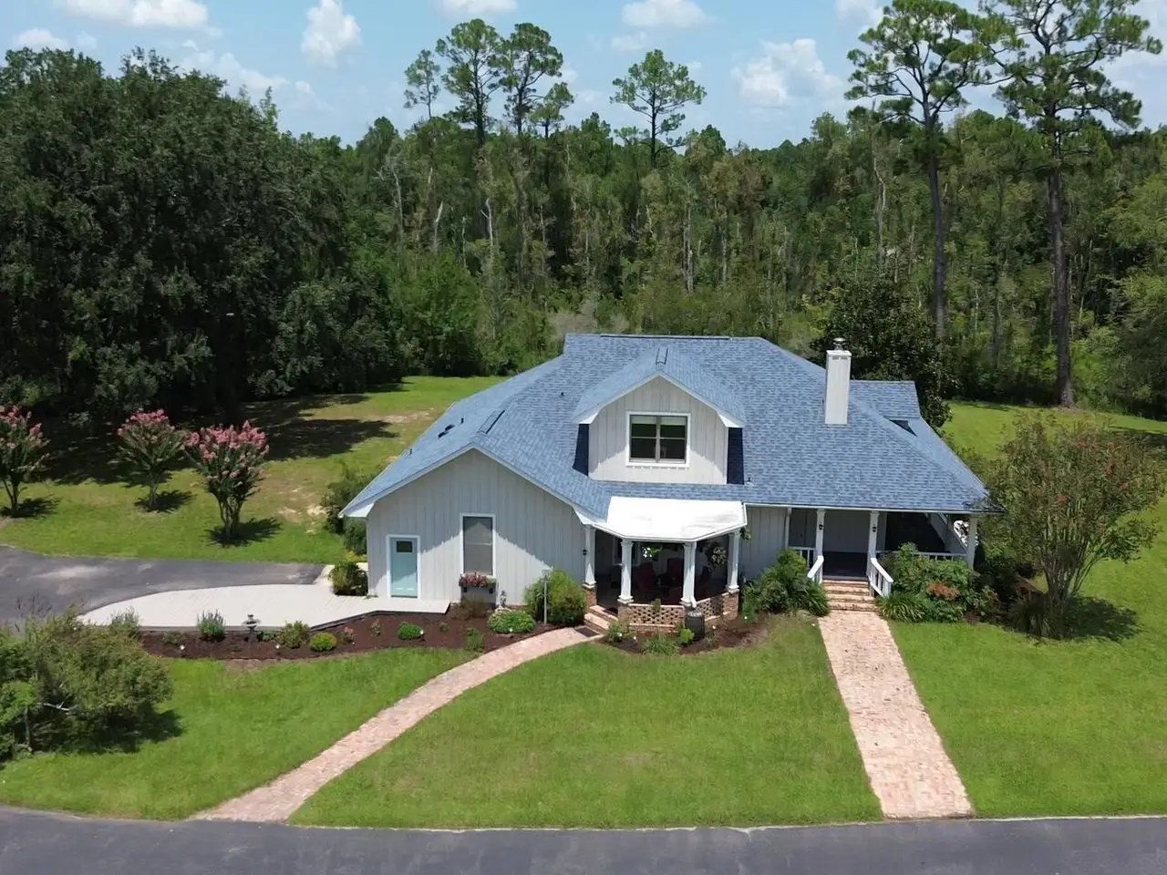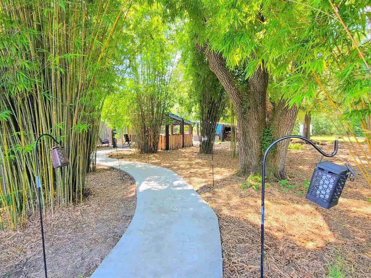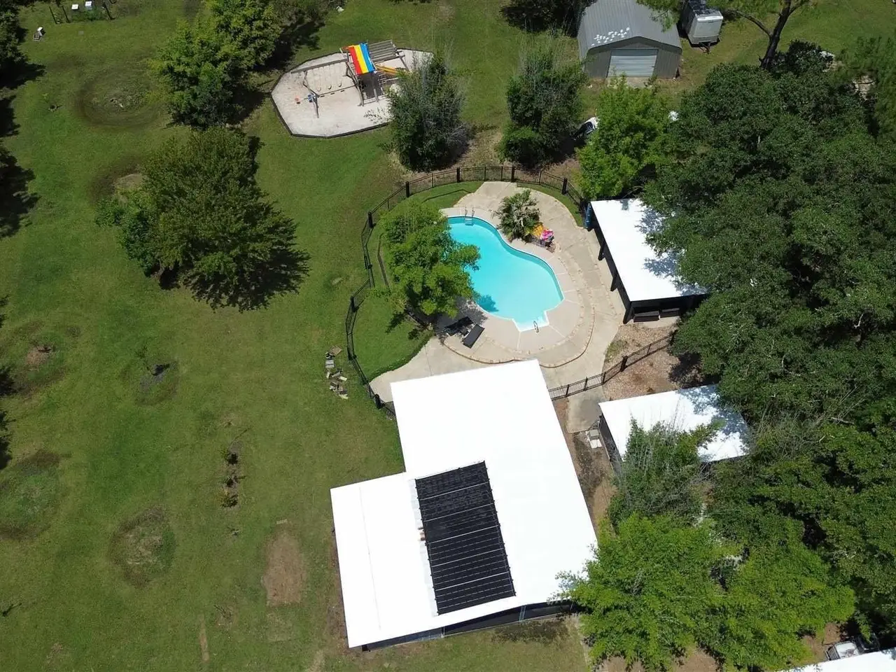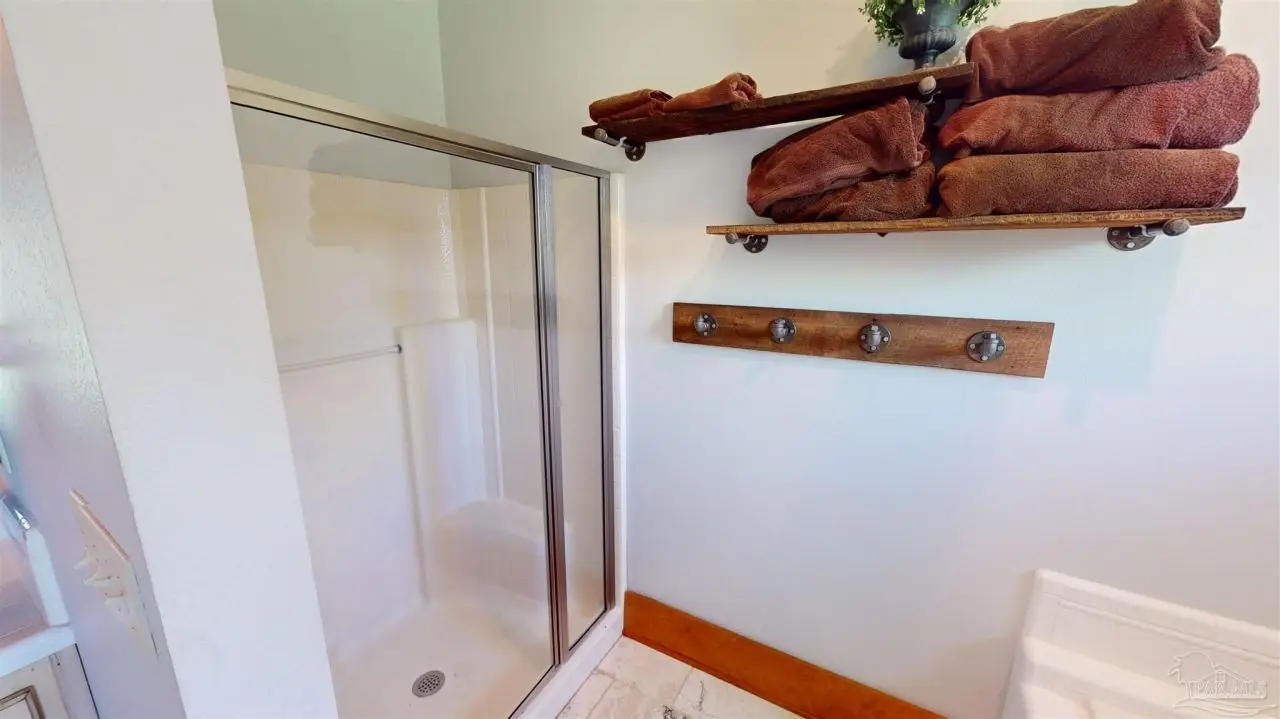 This Garcon Point-Milton expansive property could be an entertainer's dream, an event venue property for weddings or conferences, a multi-generational family compound, or income producing (AirBnB). The homes are a Tuscan-style main house, a guest house, and a studio cottage. Solar panels help reduce electricity costs! The main house has three bedrooms and baths with unique custom details like 'Henry' stained glass, cypress beamed ceilings, and a wood-burning stove. Its open layout connects living, dining, and kitchen areas to various porches, perfect for gatherings. A large loft offers versatile space. The guest house is fully furnished with two bedrooms, one bath, and a full kitchen, while the studio cottage provides a kitchenette, bath, and a screened porch with pond views. Both could be income producing! Outdoor amenities include an entertaining pavilion, a dining/cooking shack, a pool oasis with a cabana and fire pit, and a Rainbow swing set. Children love this property! Overlooking the self-watering pond are a gazebo and dock. The property also has a workshop, garden shed, raised garden beds, and a metal garage for extra storage or vehicles. It's conveniently located in quiet rural area just three miles south of I-10... including a local marina 5 minutes away to launch your boat!