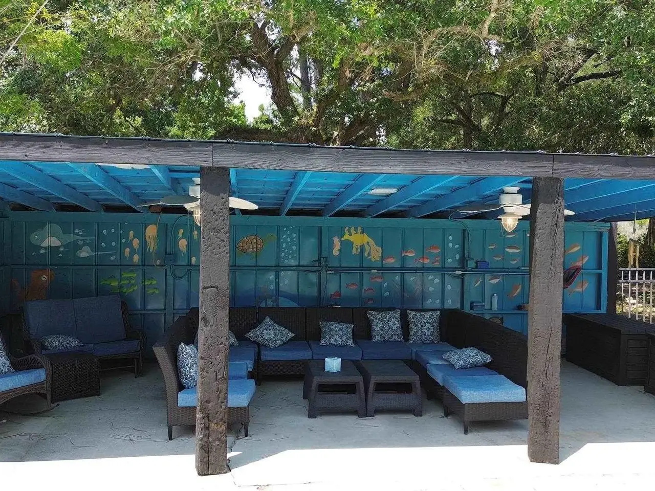 Covered cabana with painted depictions