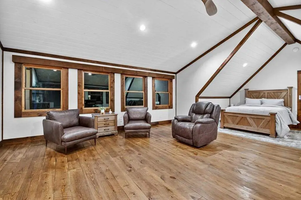 Extraordinary one-of-a-kind Marc Nicholson custom luxury estate situated on 3.34 pristine mountain acres within an ultra-exclusive gated community featuring complete paved road access, magnificent community pavilion with outdoor kitchen, and private Toccoa River access just minutes from downtown Blue Ridge. This breathtaking 5-bedroom, 5.5-bathroom architectural masterpiece showcases stunning curb appeal and welcomes guests through a grand foyer with soaring ceilings and floor-to-ceiling windows. The heart of this magnificent home features a great room anchored by a custom rock fireplace, seamlessly flowing into a culinary masterpiece kitchen equipped with luxury appliances, oversized entertaining island, sophisticated coffee bar, and concealed butler's pantry for effortless service. The owner's suite serves as a private sanctuary featuring a romantic balcony, sumptuous soaking tub, extraordinary steam shower with rainfall head, luxurious heated floors, and palatial walk-in closet overlooking the wooded grounds. Sophisticated interior spaces include an exclusive bourbon and cigar lounge with state-of-the-art air purification, versatile multi-purpose room with elevated dog wash station, convenient mud room off the garage with custom storage bench, and climate-controlled three-car garage with EV charging pre-wiring and impressive 1,000 square foot guest apartment above with private entrance. Step into your private backyard resort oasis featuring a magnificent heated saltwater pool with tanning ledge, oversized spa with dramatic spillover features, all surrounded by exquisite custom travertine stonework. The professional outdoor kitchen showcases premium stainless steel cabinetry, Big Green Egg, Blackstone griddle, Bull propane grill, and beverage cooling system, while the expansive covered porch features a breathtaking double-sided stone fireplace. Award-worthy professional landscaping creates perfect harmony between sophisticated design and natural mountain beauty.